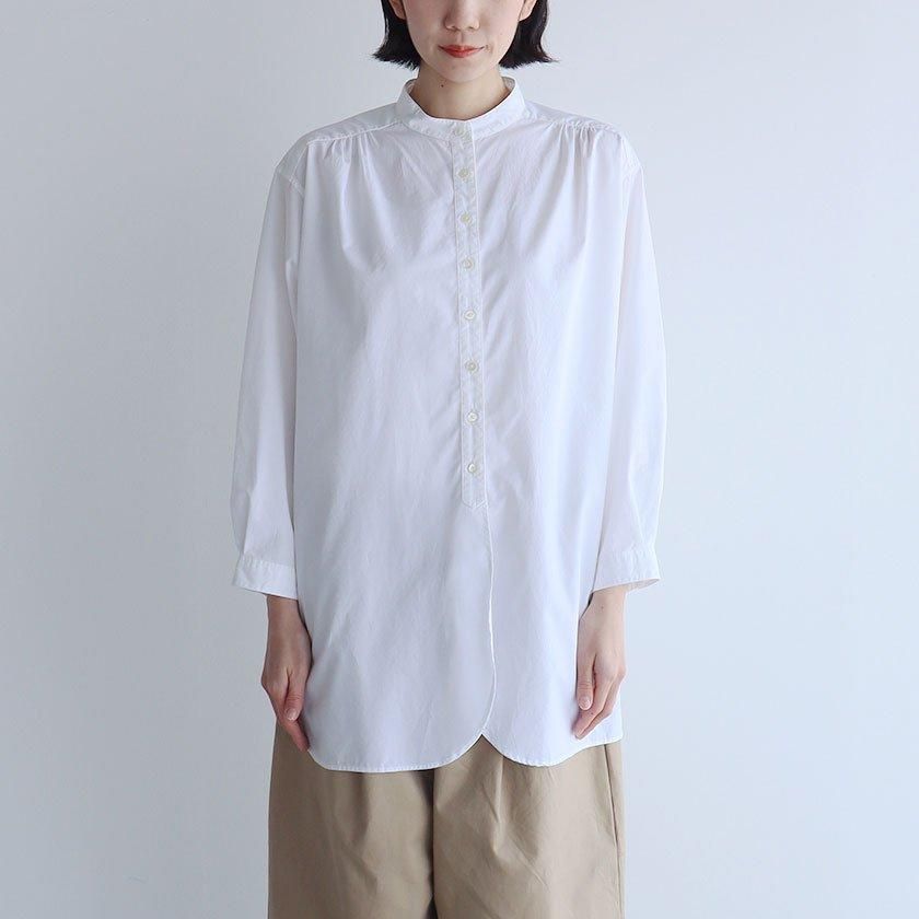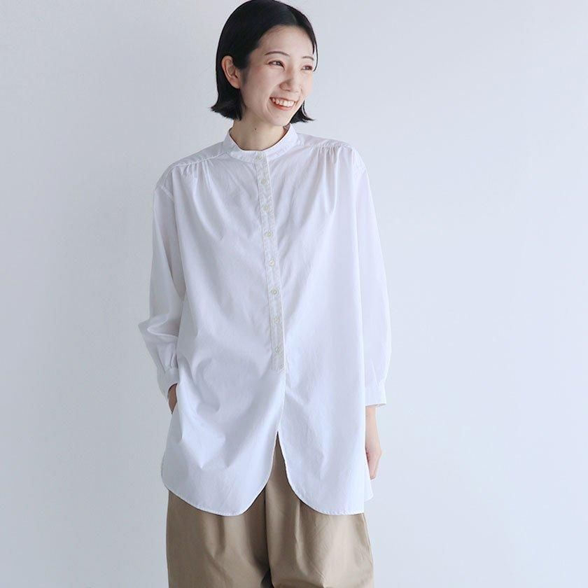 ゆったりとした身幅に前身頃の肩と後ヨークの中央にギャザーを入れることでふんわりと動きのあるシルエットに。首回りをすっきりと見せてくれるバンドカラーが全体を引き締めて、きちんと感を演出しています。着丈は安心感のある膝上ほど長さで裾のラウンドカットが柔らかな印象を与えます。