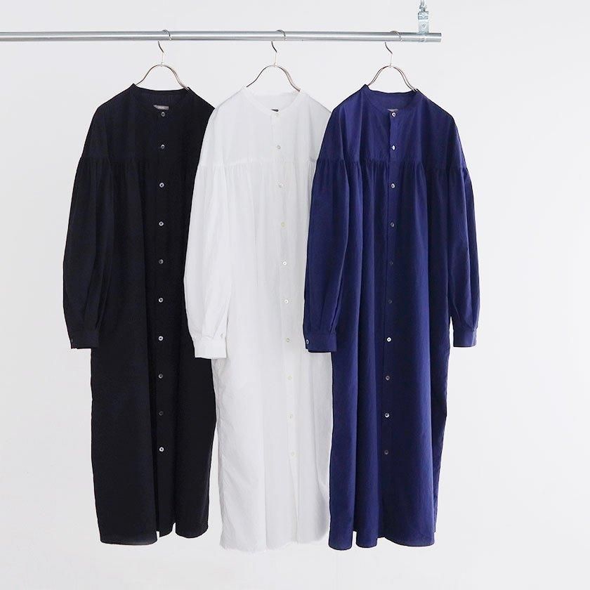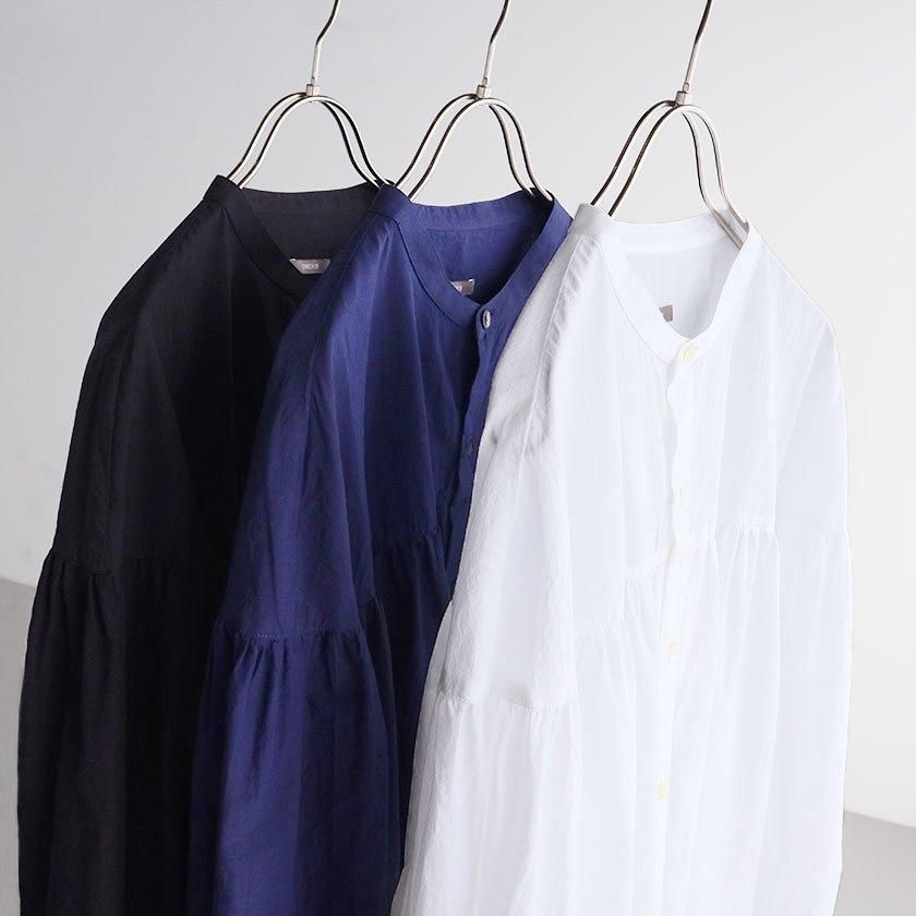 たっぷりとゆとりを持たせた身幅に胸元から袖回り、後ヨークにかけて贅沢にギャザーを施すことで、ふんわりとした立体感のあるシルエットに。首元をバンドカラーにすることで甘さを抑え、全体を引き締めています。絶妙なボリューム感の袖もデザインのポイント。気になる二の腕のラインを拾わず、さりげなくカバーしてくれます。両サイドにはあると便利なポケットが付いています。
