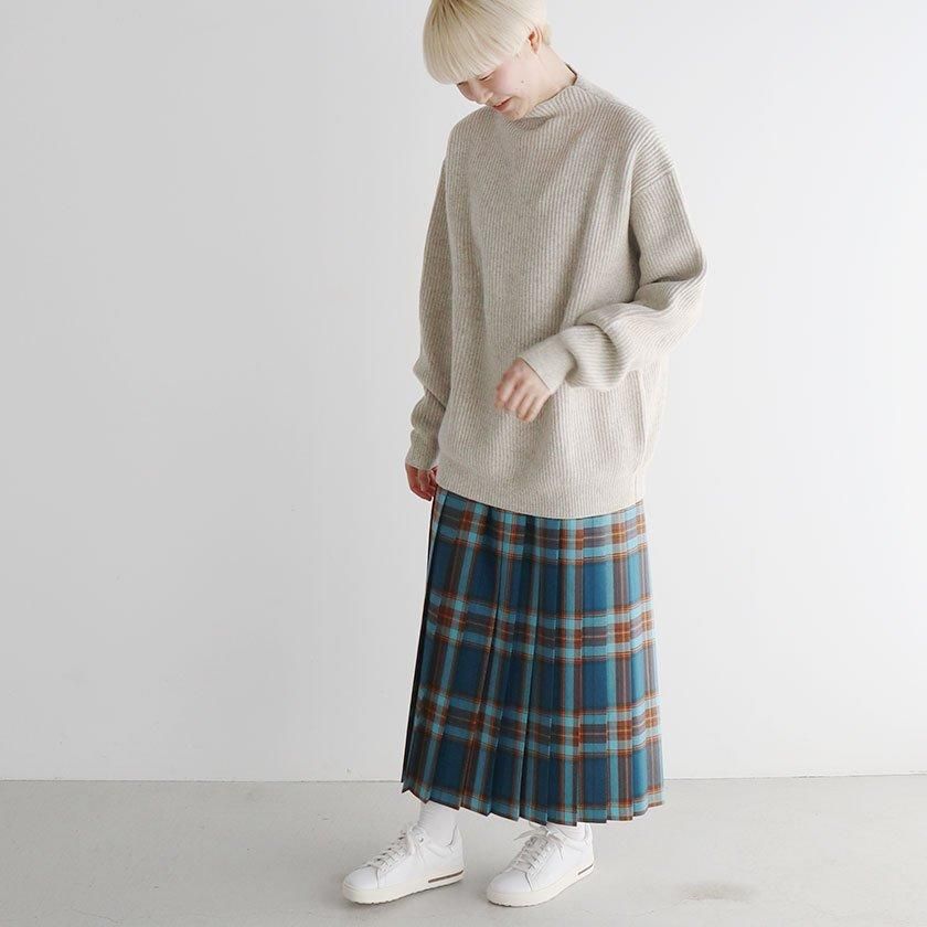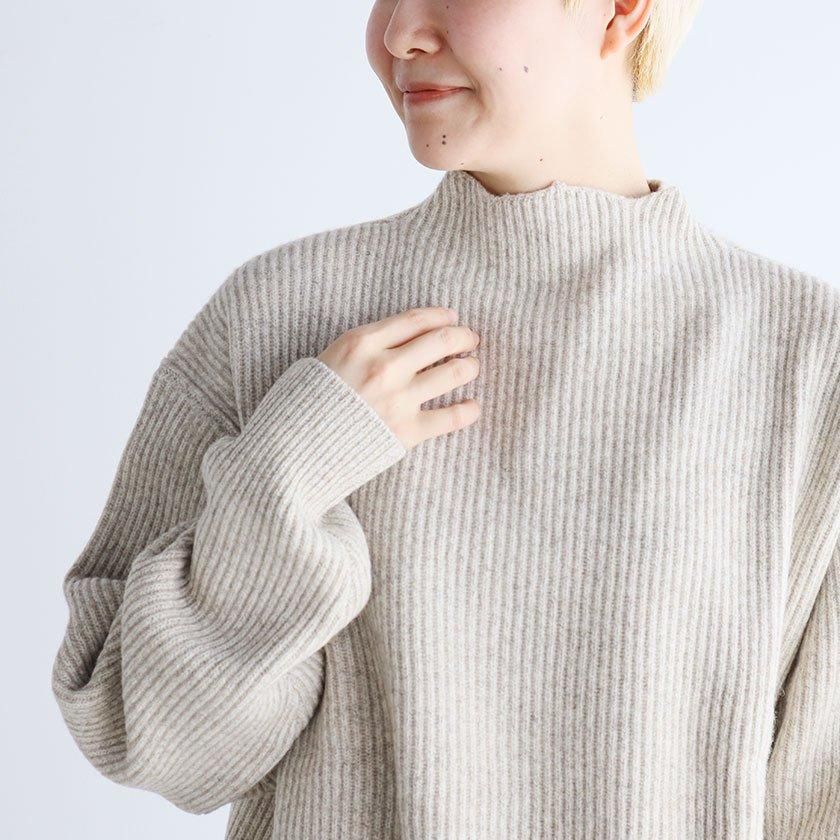 名前の通り、モックネックの襟端が三角形になったデザイン。三角のラインにすることで日本人の首の形に沿い、首回りを美しく見せてくれるささやかなポイントに。ラフに一枚で着ていただくだけでサマになりますが、インナーとして着用した際にも存在感を放ちます。合わせるアイテムによってきれいめにもカジュアルにも印象が変化し、洗練された着こなしが完成するニットです。