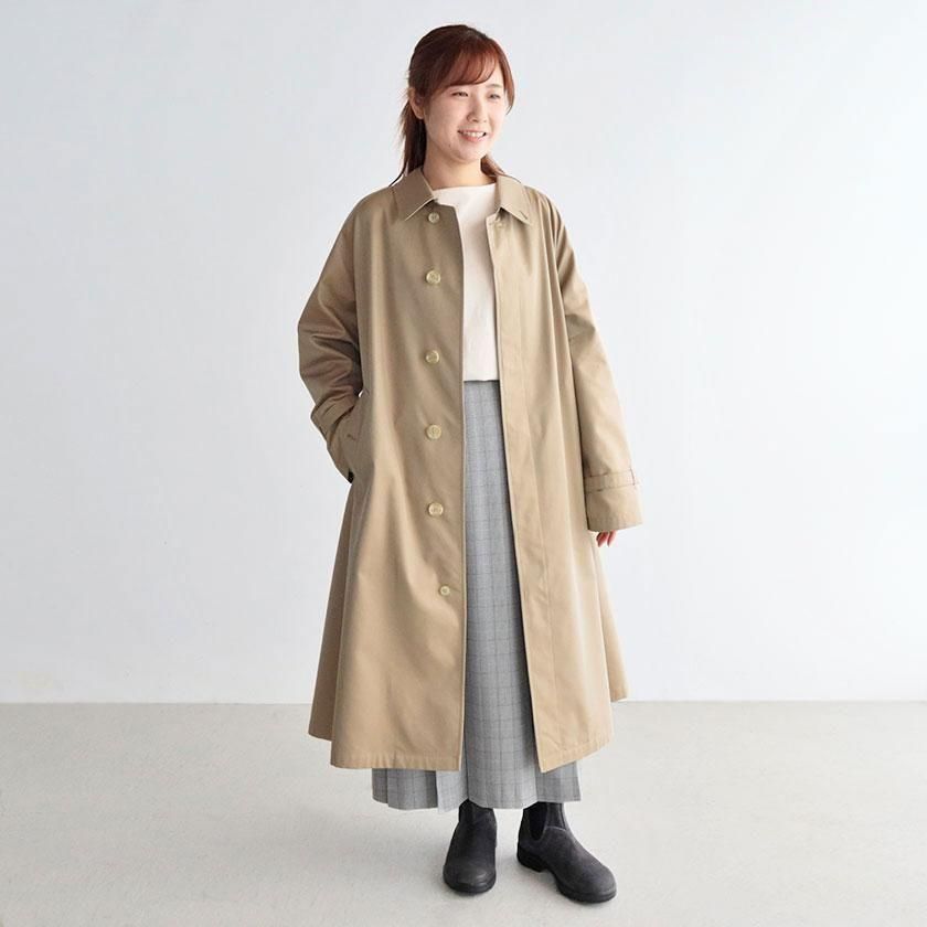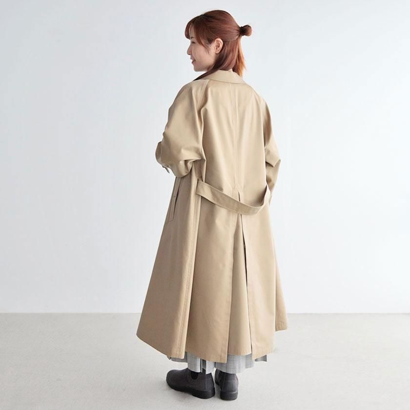 前裾の内側・背中のインバーテッドプリーツには裾のバタつきを防ぐためのベルトが配されていて、そのままベルトを留めずに着用すれば足さばきを良くしてくれ、反対にベルトを留めれば風が強い日や自転車での通勤時にも安心です。便利なボタン付きのポケットがフロントに2つ付いています。