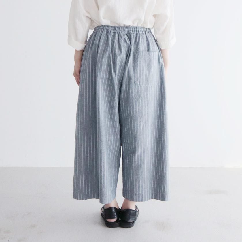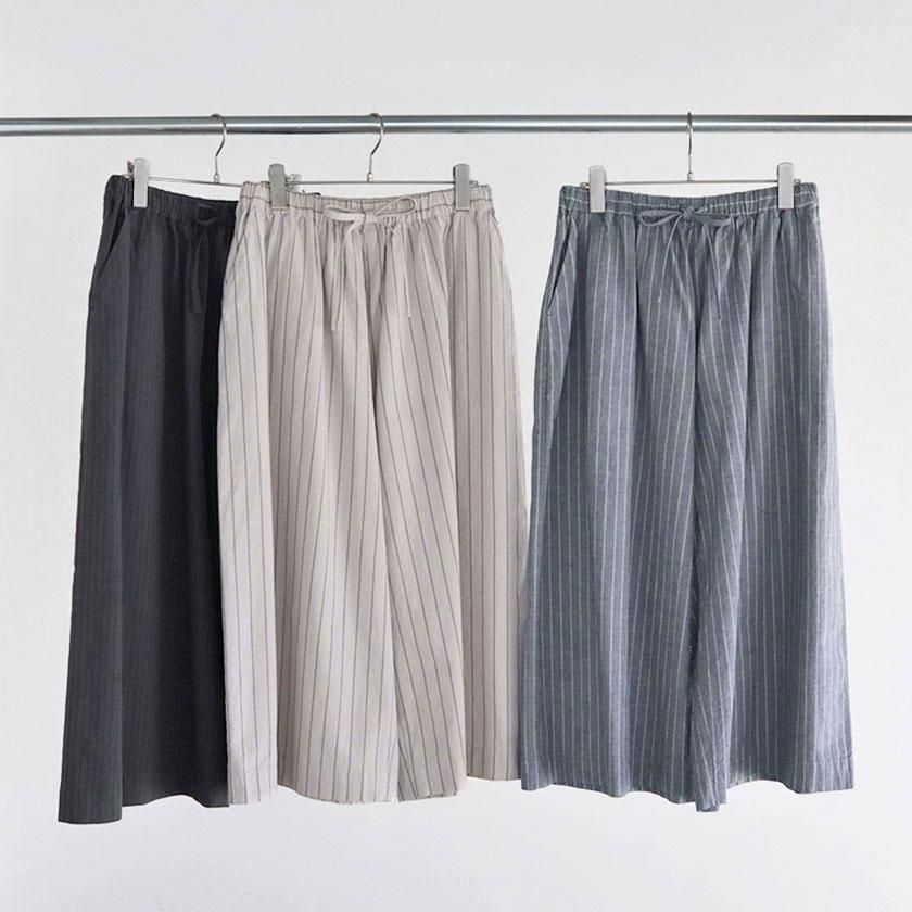 キュロットパンツのようなリラックス感のあるシルエット。歩くたびにふわりと風を通す涼やかな穿き心地が魅力です。足首が見えるクロップド丈は軽快な印象で、カラフルな靴下をちらりと覗かせたり、足元のコーディネートを楽しむのも素敵ですね。ウエストは嬉しい総ゴム仕様。ドローコードが付いているのでサイズ調節も可能です。
