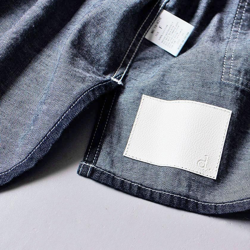 前後差を付けた裾はフロントはスクエアカット、背面はラウンドカット仕様に。両サイドにはスリットを入れて軽さを出しています。前身頃の内側にはブランドロゴのレザータグ付き。猫目ボタンや大きなポケットなど、昔のワークウェアのディテールが所々に落とし込まれているのもD.M.G.らしいポイントです。