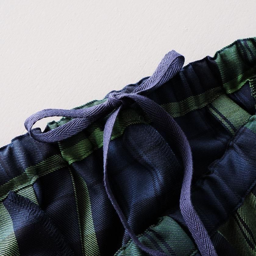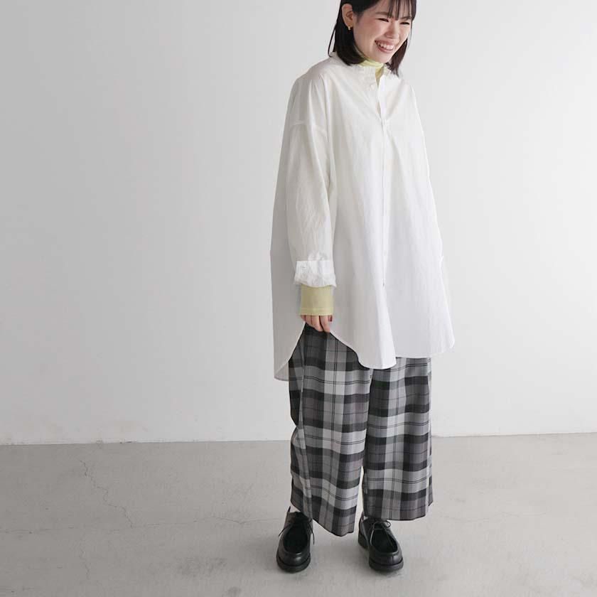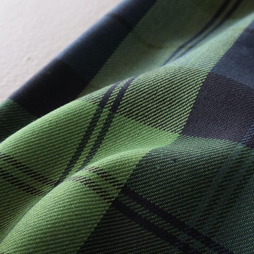 愛知県一宮で織られたオリジナルのチェック生地で仕立てた一着。ポリエステルとウールの混紡糸を使用し、高密度に織り上げられた生地は適度な光沢感があり、上品な印象を与えます。落ち着いたトーンのチェック柄は大人っぽく、シーズンムード漂う仕上がり。ウール特有のあたたかみを感じる素材ですが、さらりとなめらかなタッチで軽やかにご着用いただけます。