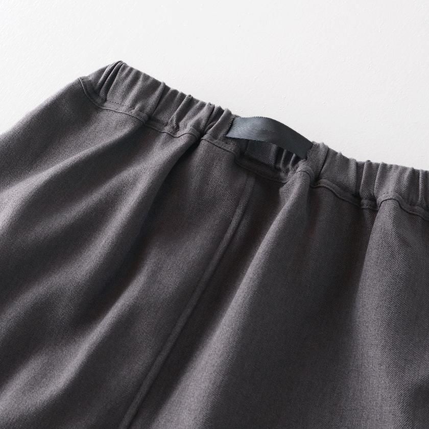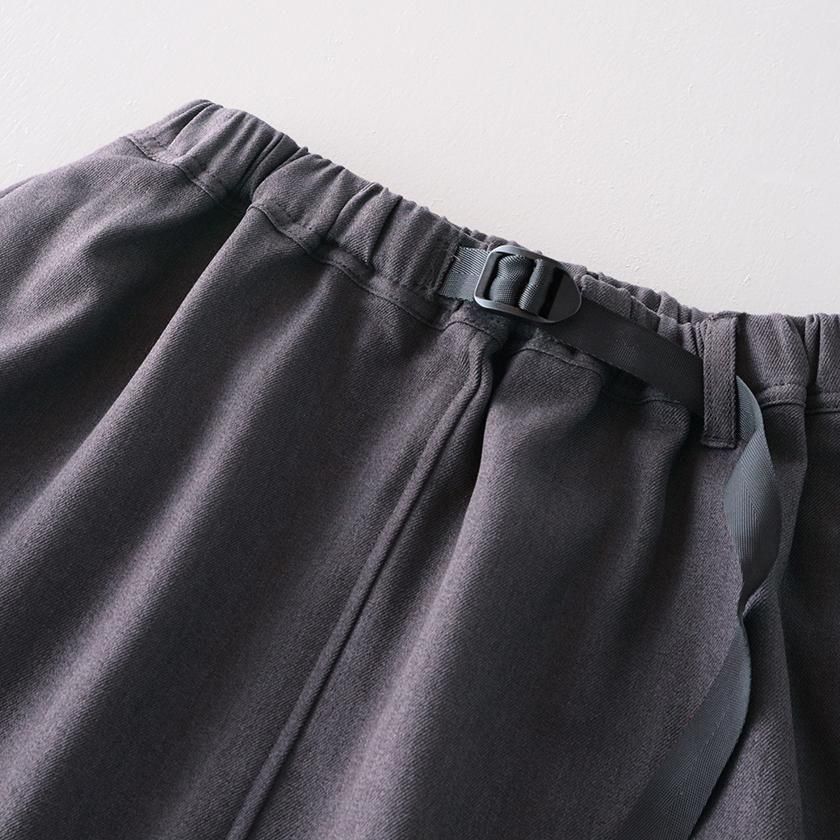 裾に向かってほどよく広がるフレアシルエットがエレガントな印象。ウエストは片手で簡単にサイズ調節できるウェビングベルト仕様で、きれいめな中にもアウトドアの要素をプラスしています。くるぶしが見え隠れするほどの長さは、靴下やスニーカー、ショートブーツとの組み合わせなど様々な足元のおしゃれを楽しむのに最適。 両サイドにはあると便利なポケットが付いています。