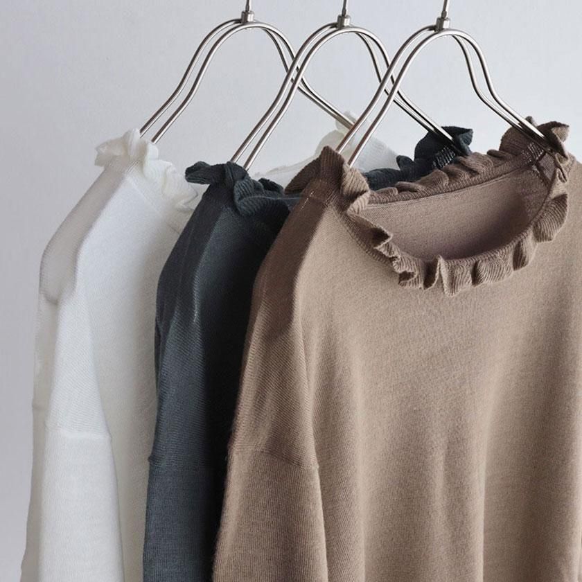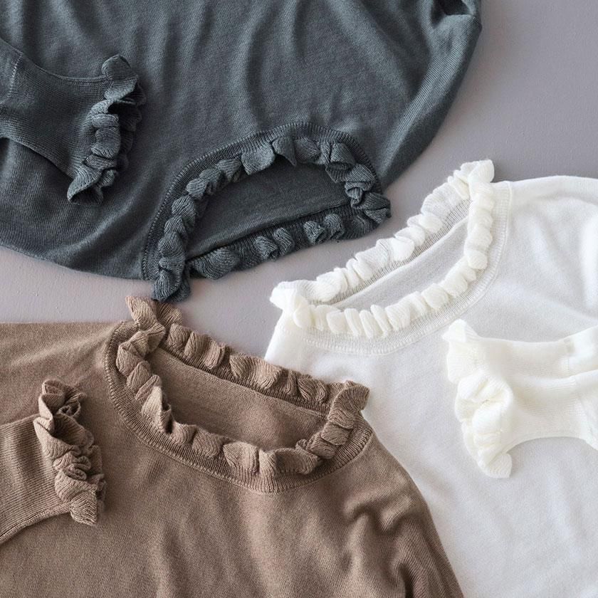 袖と裾に施された広めのリブがメリハリの効いたシルエットに。首元と袖口のフリルがほどよい甘さをプラスするので普段使いはもちろんのこと、装いにちょっと華やかさをプラスしたいときにも重宝します。ベストやアウターを重ねた際にもフリルが可愛らしいポイントになってくれますよ。