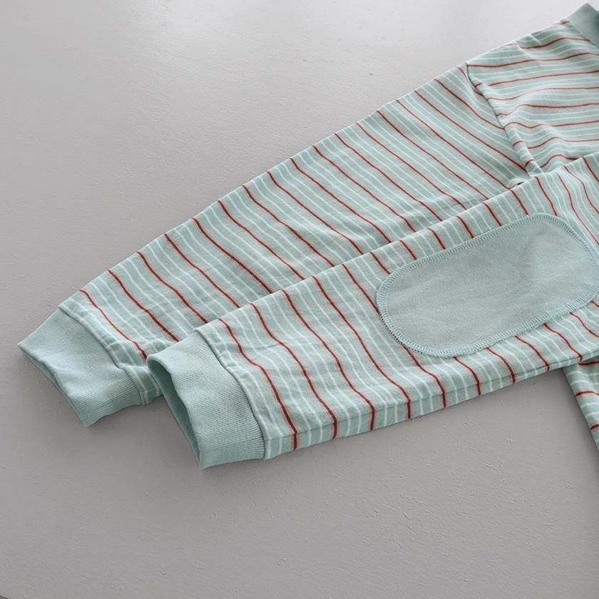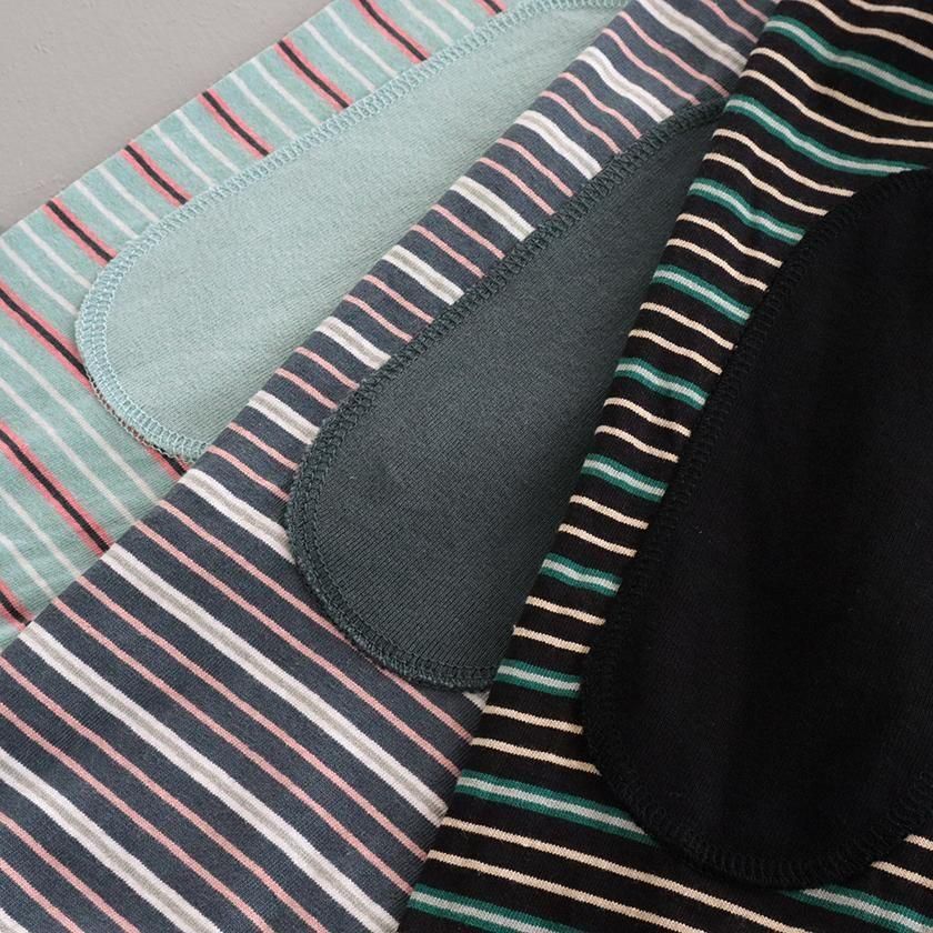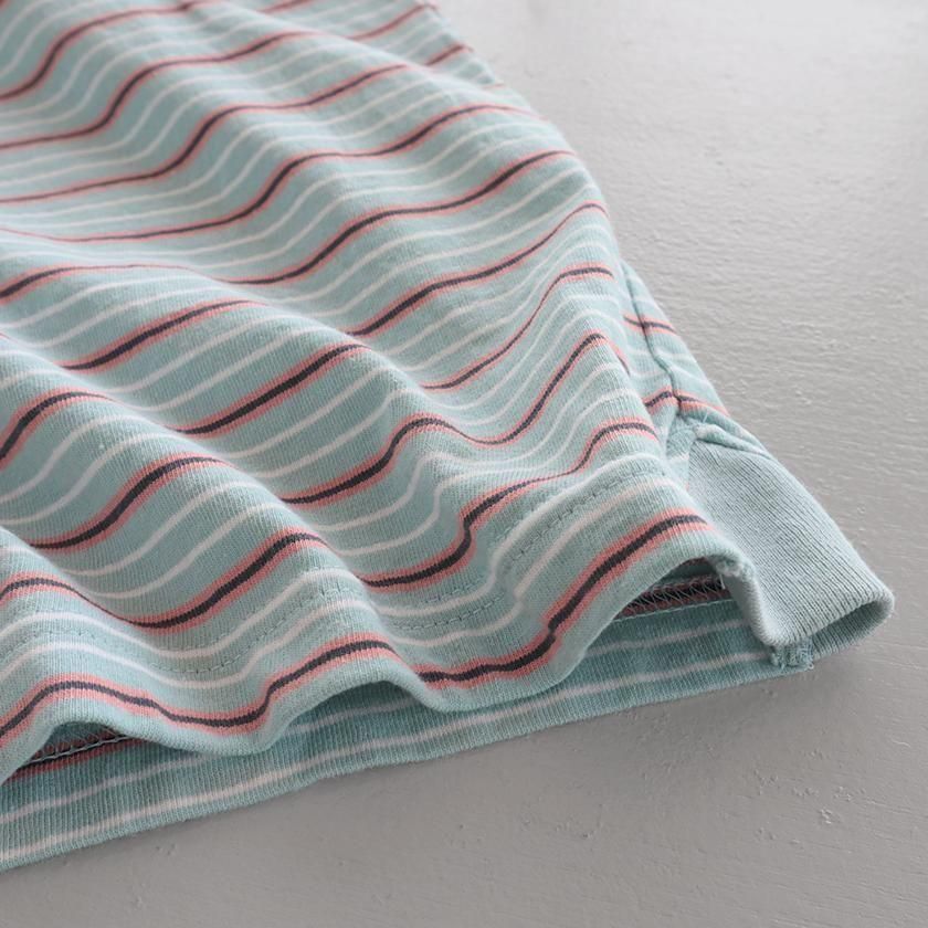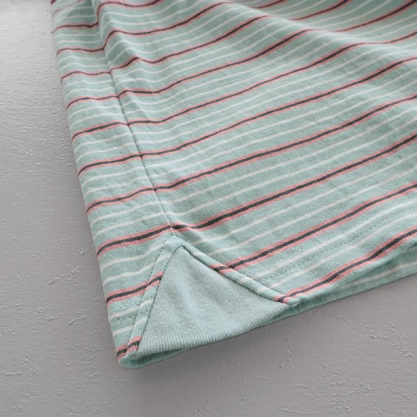 綿100%の空紡糸を用いたドライタッチなボーダー生地。暑さの残る時期にも着用しやすいシャリ感のあるさらりとした着心地です。洗うたびにより風合いが増し、長くお楽しみいただけるのも魅力です。