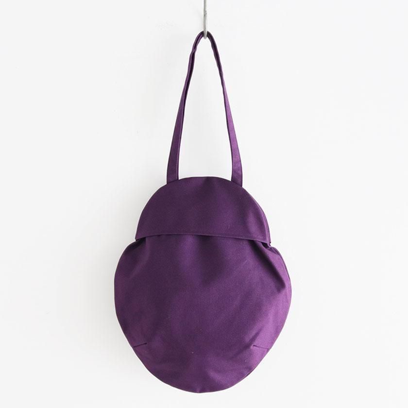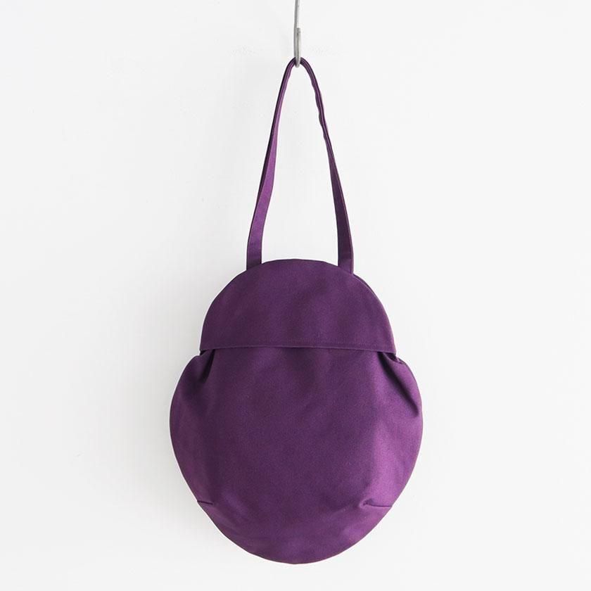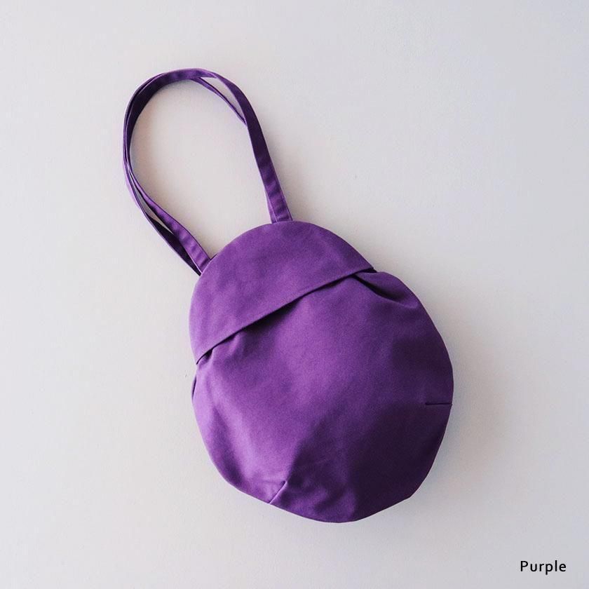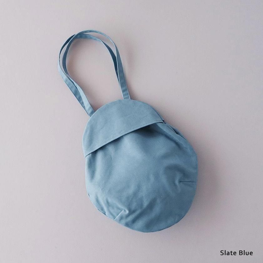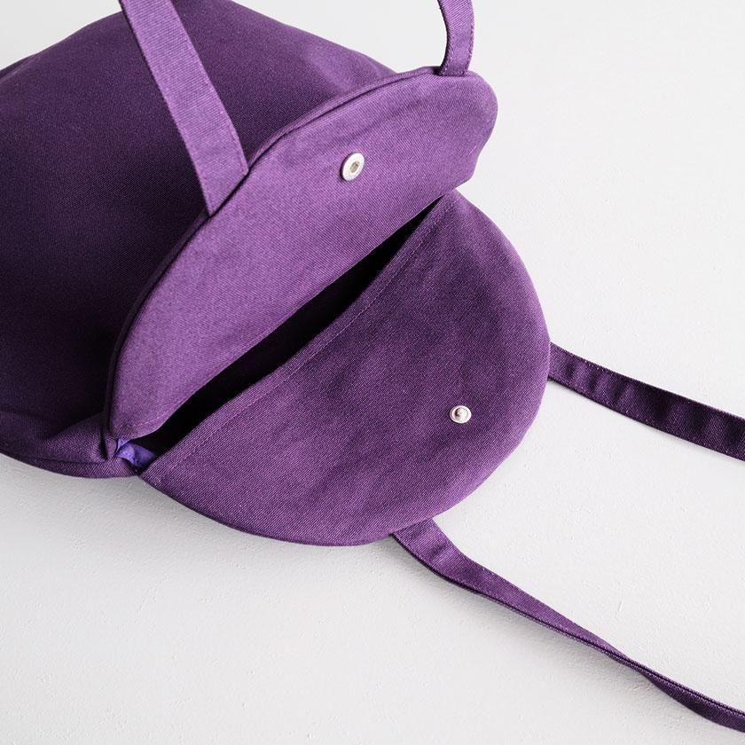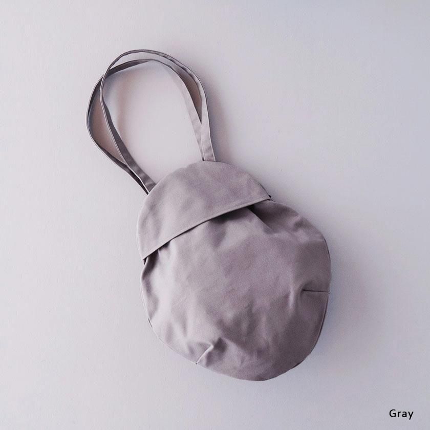 そら豆のようなコロンと丸いフォルムが印象的なデザイン。荷物を入れると丸みが増し、やわらかい雰囲気に。長財布や大きめのポーチはもちろん、500mlのペットボトルが縦にすっぽり収まる見た目以上の収納力も魅力です。持ち手は手持ちでも肩掛けでも使いやすい長さ。口は開け閉めしやすいスナップボタン仕様で、内側には小物の整理に便利なポケットが1つ付いています。