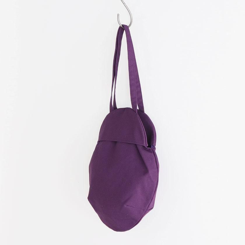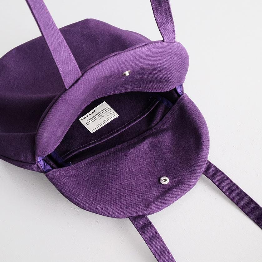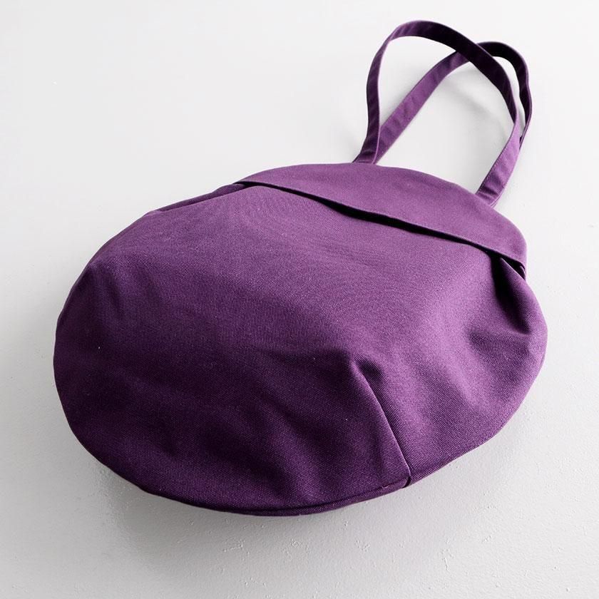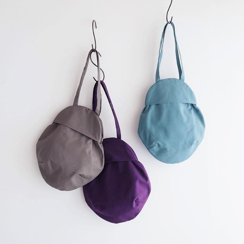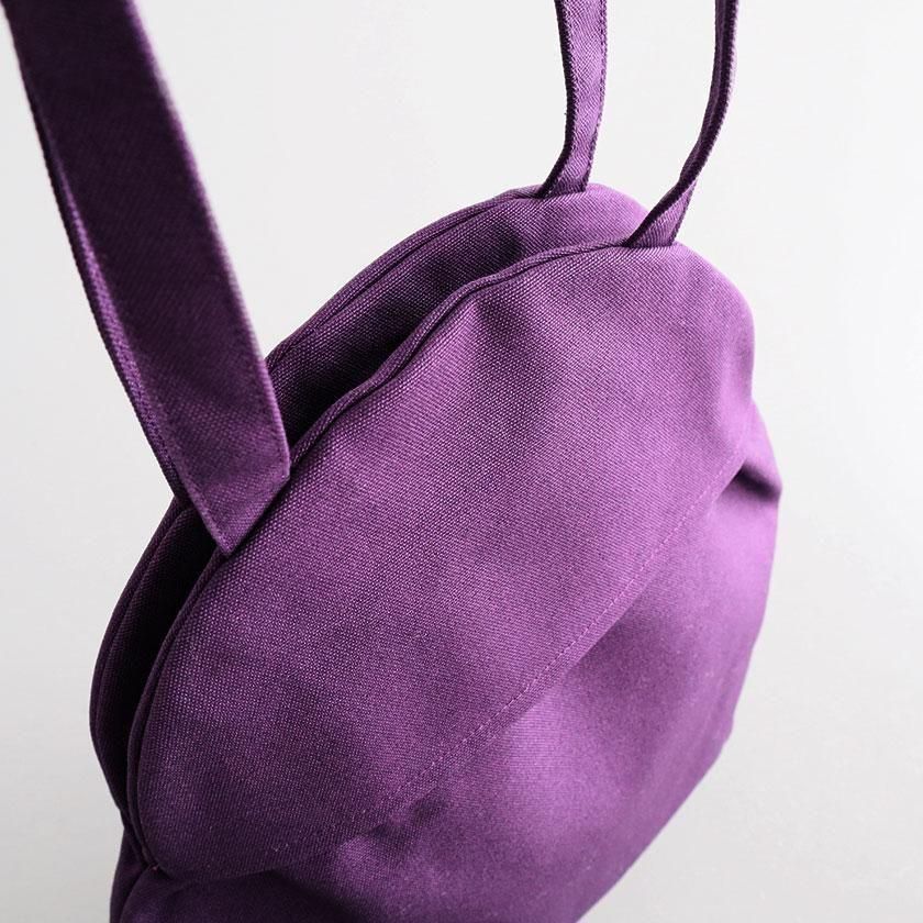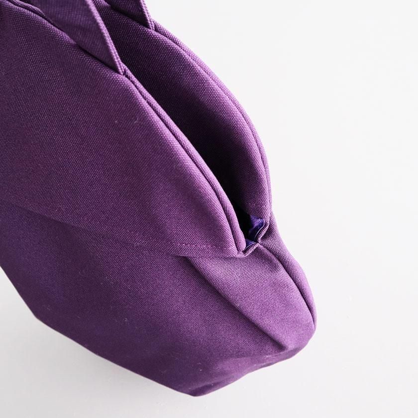 そら豆のようなコロンと丸いフォルムが印象的なデザイン。荷物を入れると丸みが増し、やわらかい雰囲気に。長財布や大きめのポーチはもちろん、500mlのペットボトルが縦にすっぽり収まる見た目以上の収納力も魅力です。持ち手は手持ちでも肩掛けでも使いやすい長さ。口は開け閉めしやすいスナップボタン仕様で、内側には小物の整理に便利なポケットが1つ付いています。