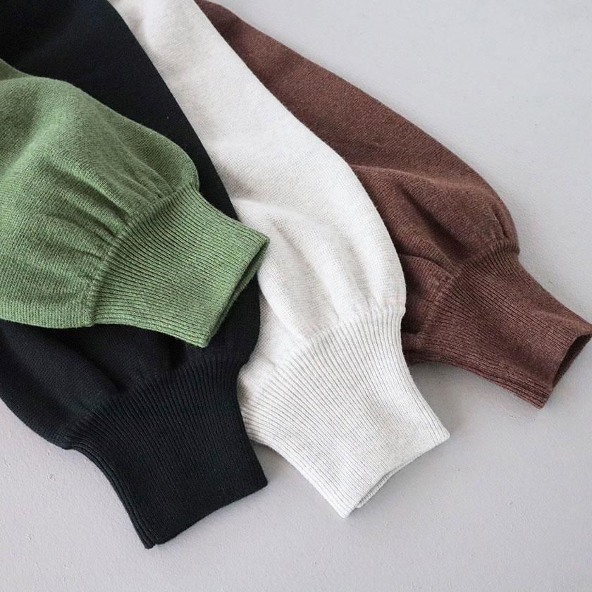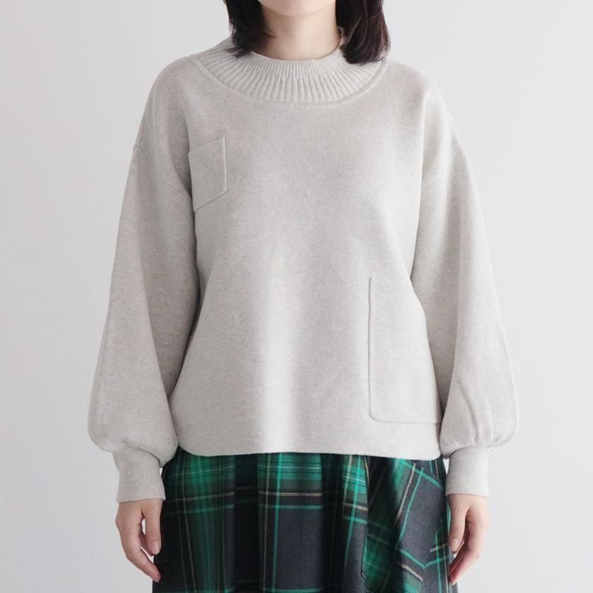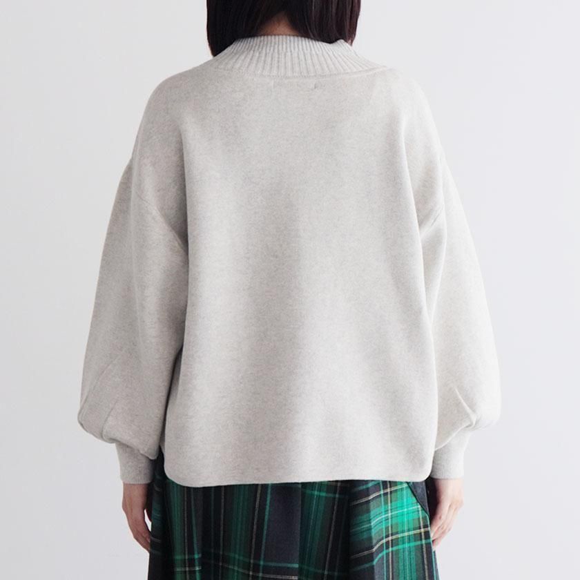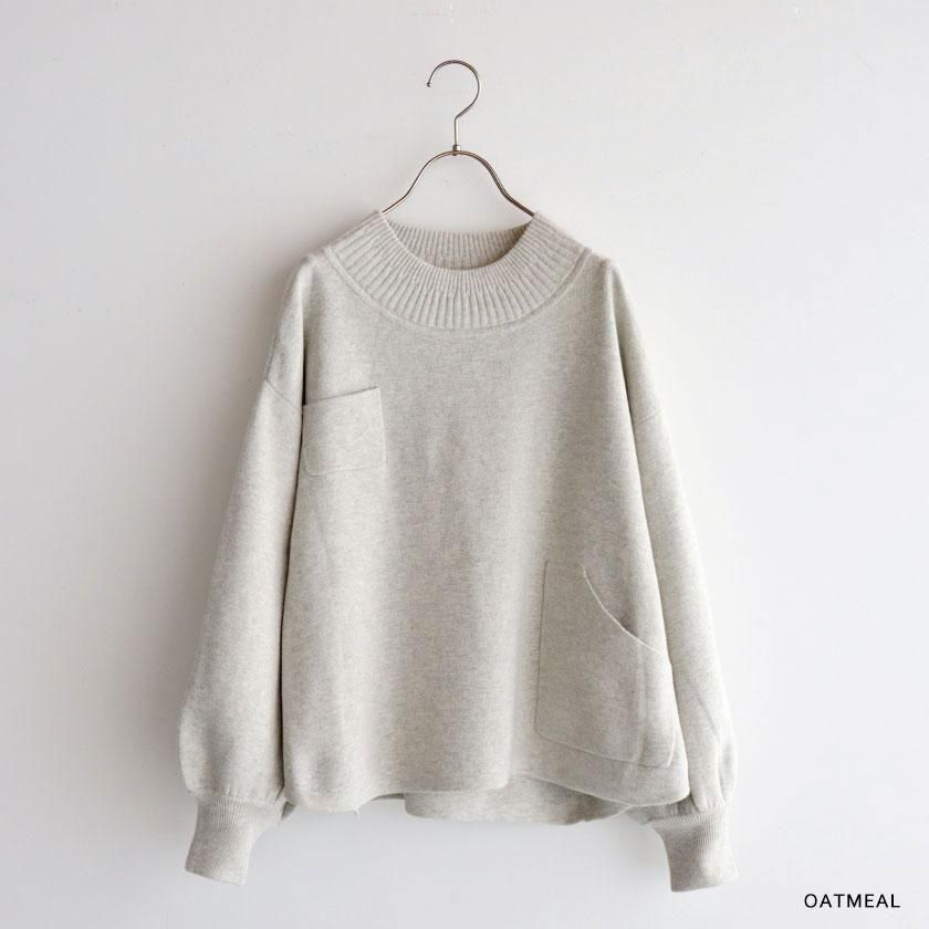 首元は窮屈感のないゆるめのタートルネック。リラックスして着用できる広めの身幅と腕まわりは体のラインをさりげなくカバーし、首元と袖口のリブでメリハリを効かせています。