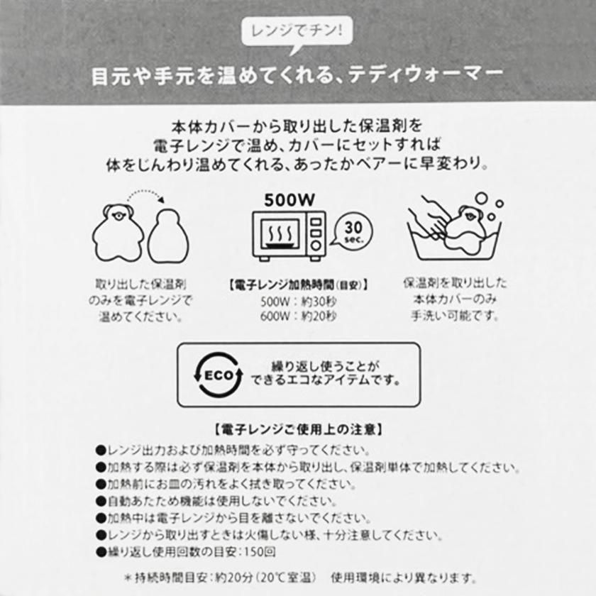 一見すると可愛らしいぬいぐるみかと思いきや、実は繰り返し使えるあったかアイテム。中に入っている保温剤を取り出して、電子レンジで温めるとカイロのようにじんわりと体を温めてくれます。保温剤もくま型になっており、細部まで可愛いが詰まっています。