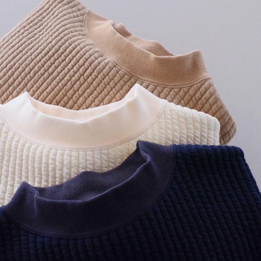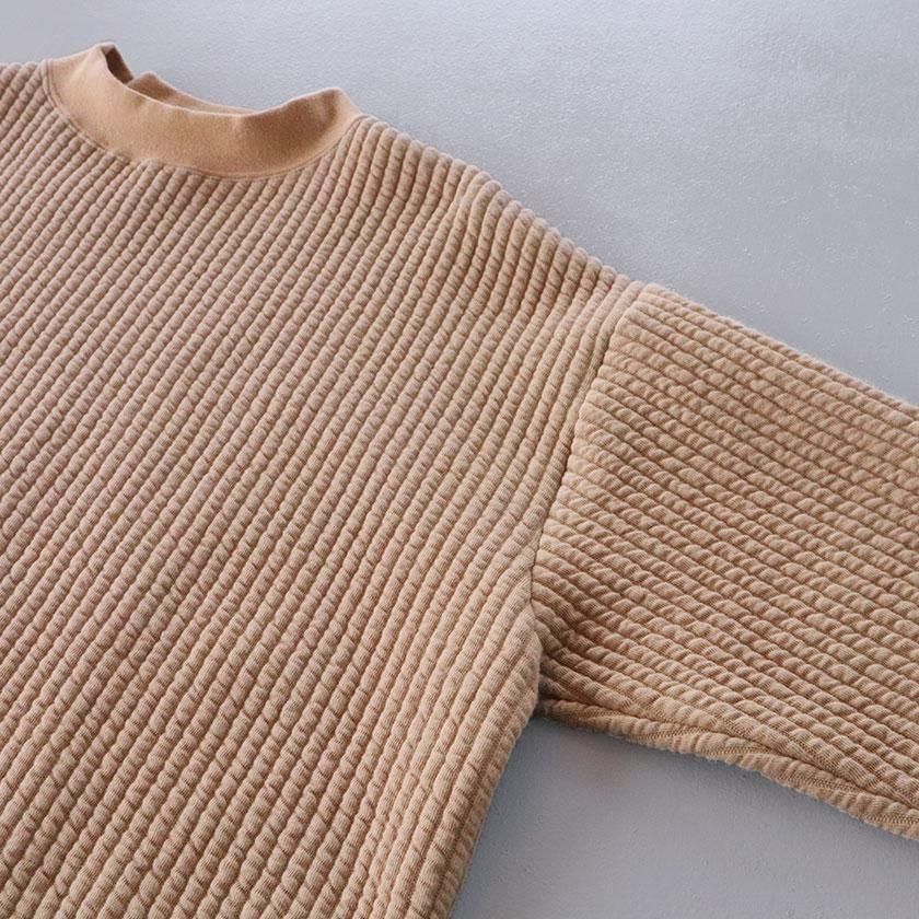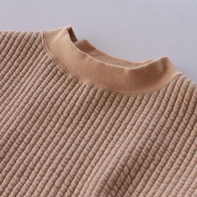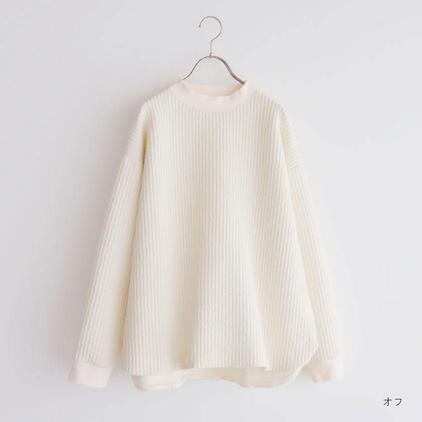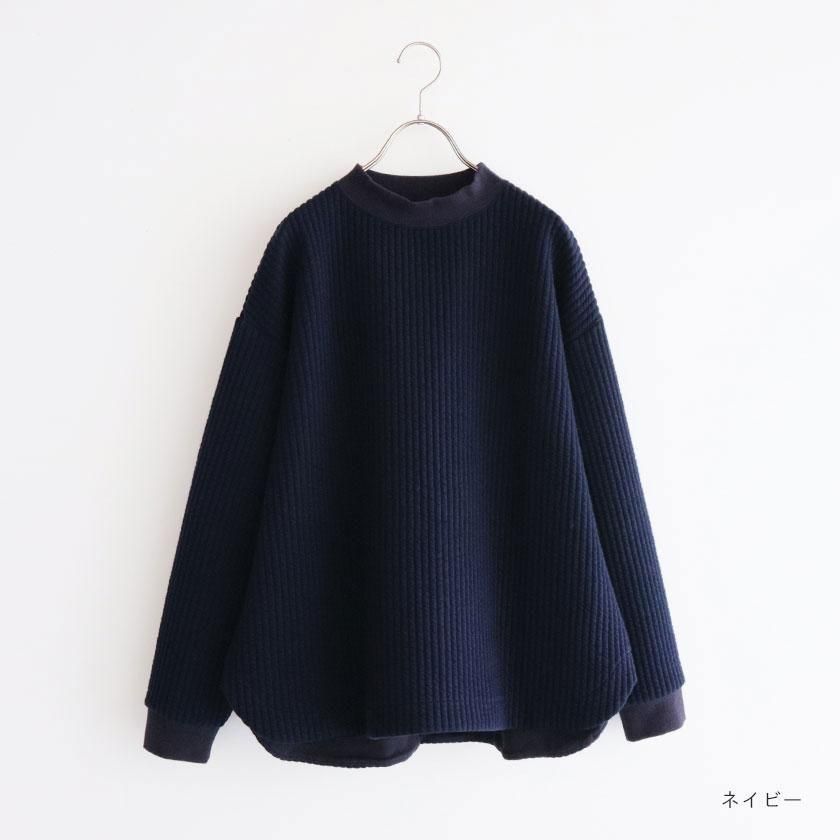 ゆとりのある身幅に肩落ちのデザインでリラックス感のあるシルエットに。少し高さのあるモックネックが首回りをすっきりと美しく見せてくれます。前後差のある裾はラウンドカット仕様で柔らかな印象をプラス。首元と袖口のリブが全体を引き締めて、シンプルなデザインのアクセントになっています。