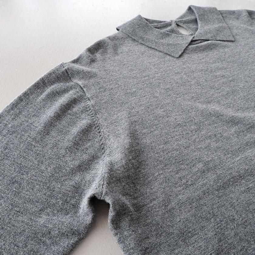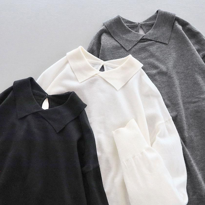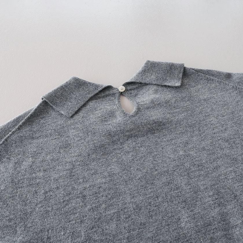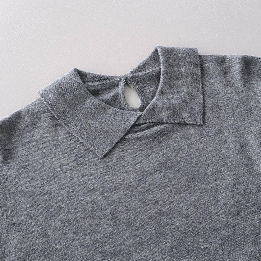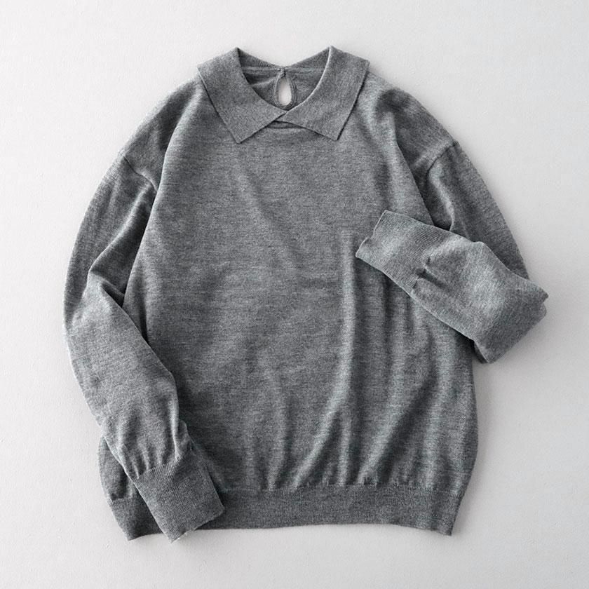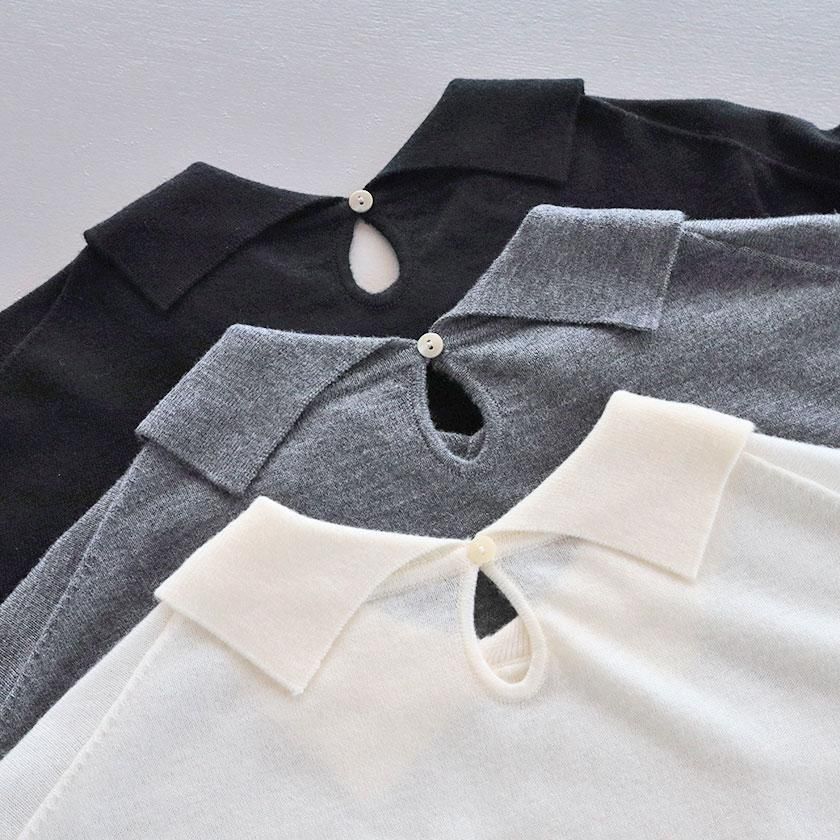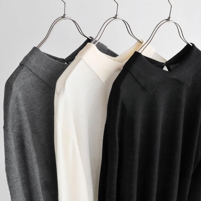 ほどよくゆとりのある身幅とドロップショルダーが柔らかく女性らしい印象に。袖口と裾はリブ仕様にすることで、メリハリのあるシルエットに仕上げています。クラシカルな雰囲気の小さめの襟が顔周りに華やかさをプラス。背面には着脱用のボタンがあり、バックスタイルのさりげないアクセントになっています。