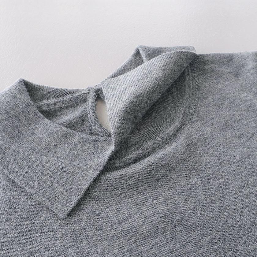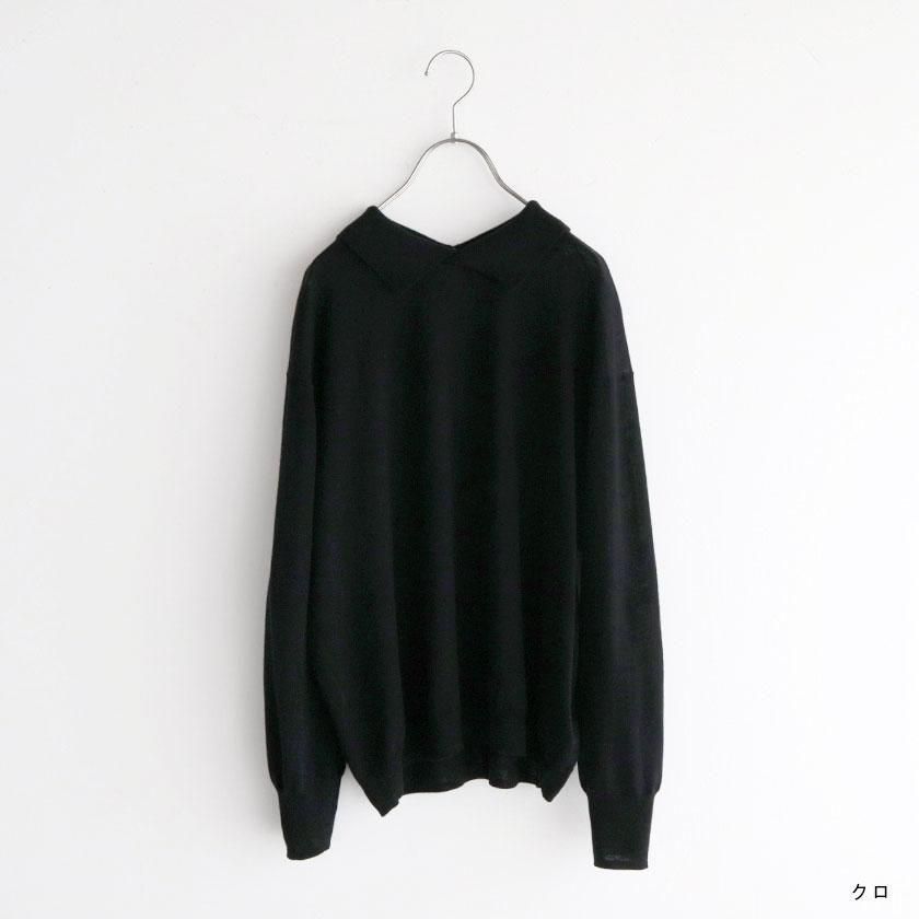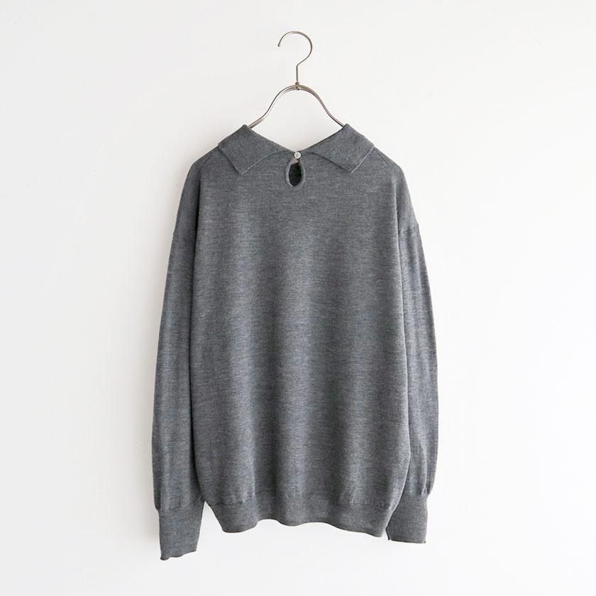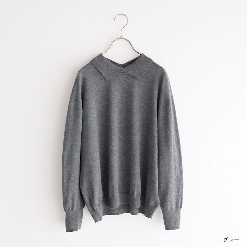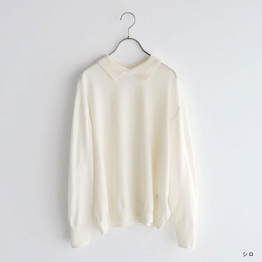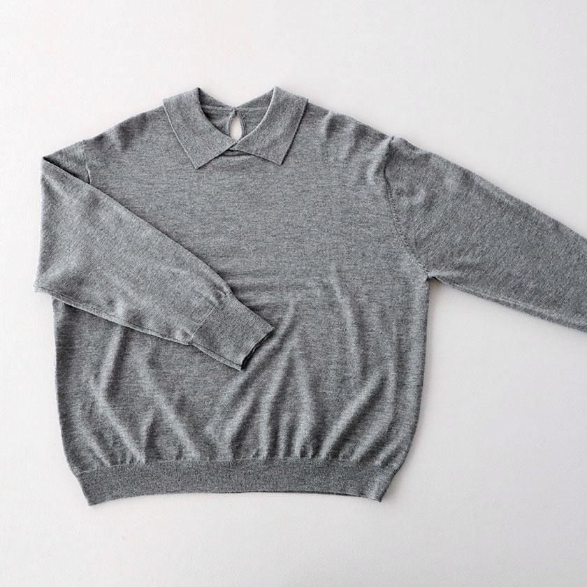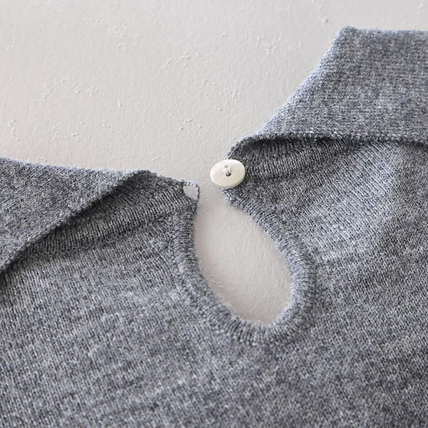 ほどよくゆとりのある身幅とドロップショルダーが柔らかく女性らしい印象に。袖口と裾はリブ仕様にすることで、メリハリのあるシルエットに仕上げています。クラシカルな雰囲気の小さめの襟が顔周りに華やかさをプラス。背面には着脱用のボタンがあり、バックスタイルのさりげないアクセントになっています。
