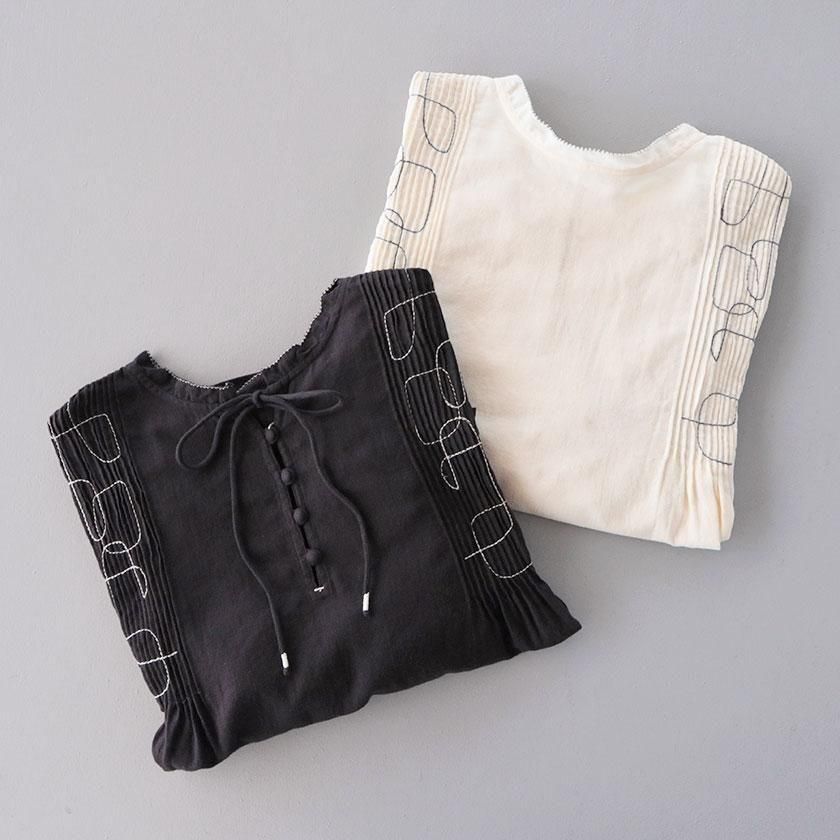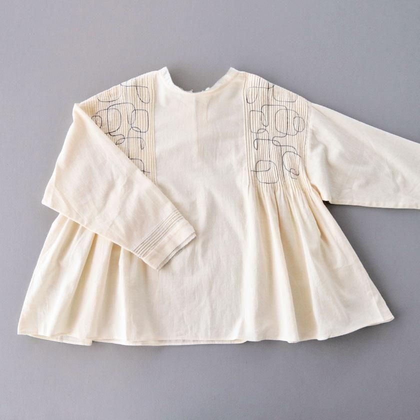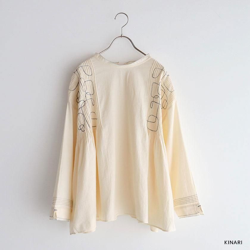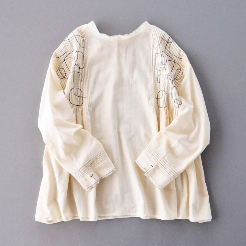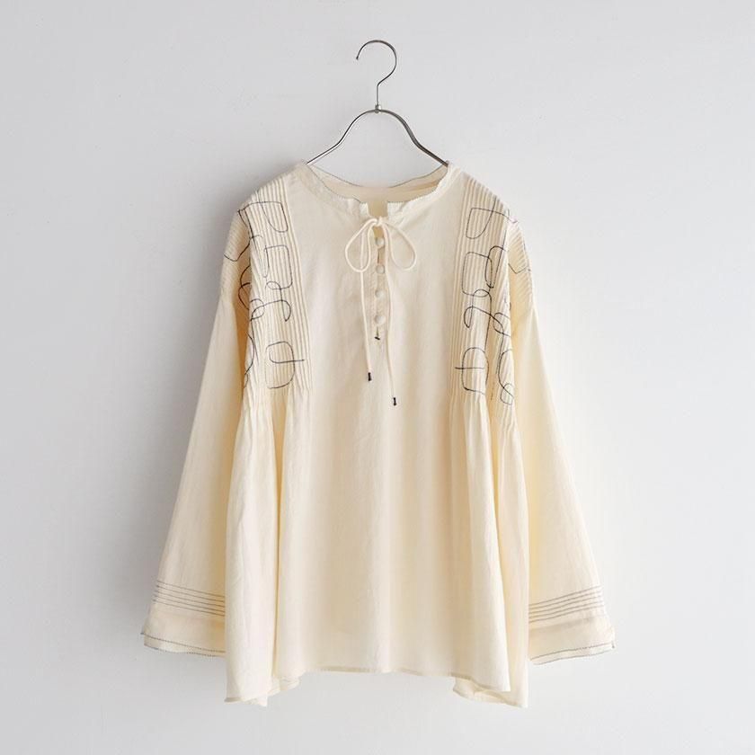 幾何学模様の刺繍と繊細なピンタックが存在感を放つtumugu: (ツムグ)のブラウスです。