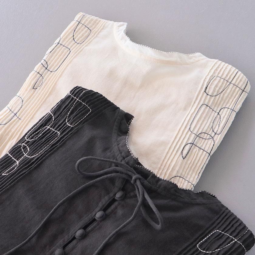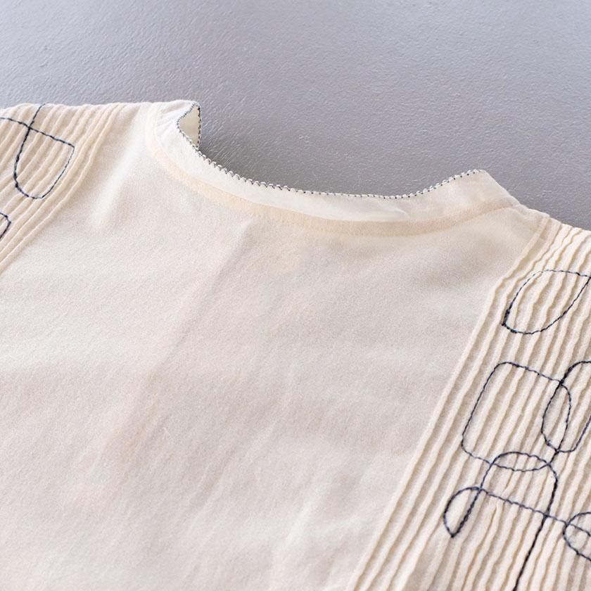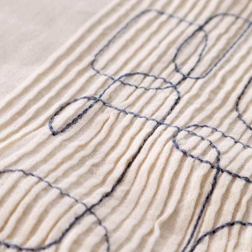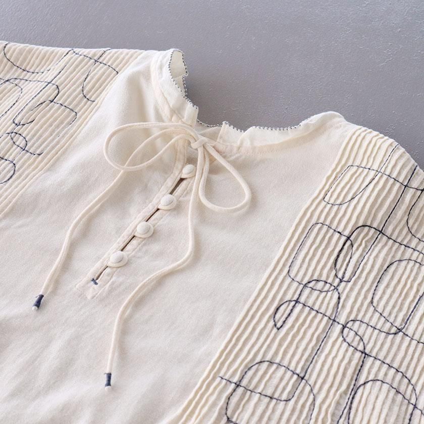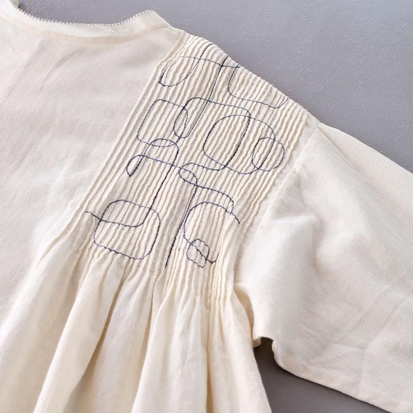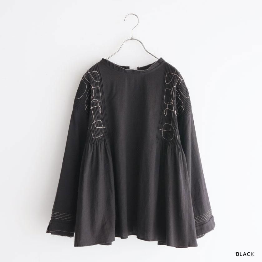 幾何学模様の刺繍と繊細なピンタックが存在感を放つtumugu: (ツムグ)のブラウスです。