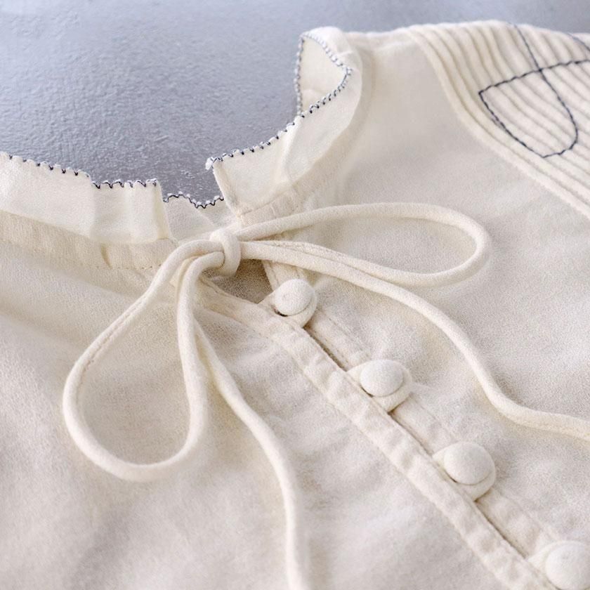 ボタンを前にしても後ろにしても着れる2way仕様。ふんわりと広がるAラインシルエットがさりげなく体型をカバーし、フェミニンな印象を与えます。丁寧に施されたピンタックやピコ刺繍とステッチが特徴的で、ボタンにはくるみボタンを採用したり、袖口にスリットを入れたりなど細部までこだわりが感じられます。リボンは結ぶのはもちろん、ラフに垂らしても可愛いですよ。