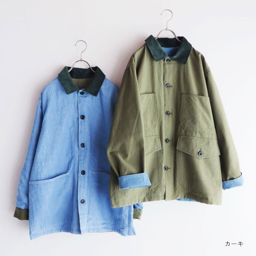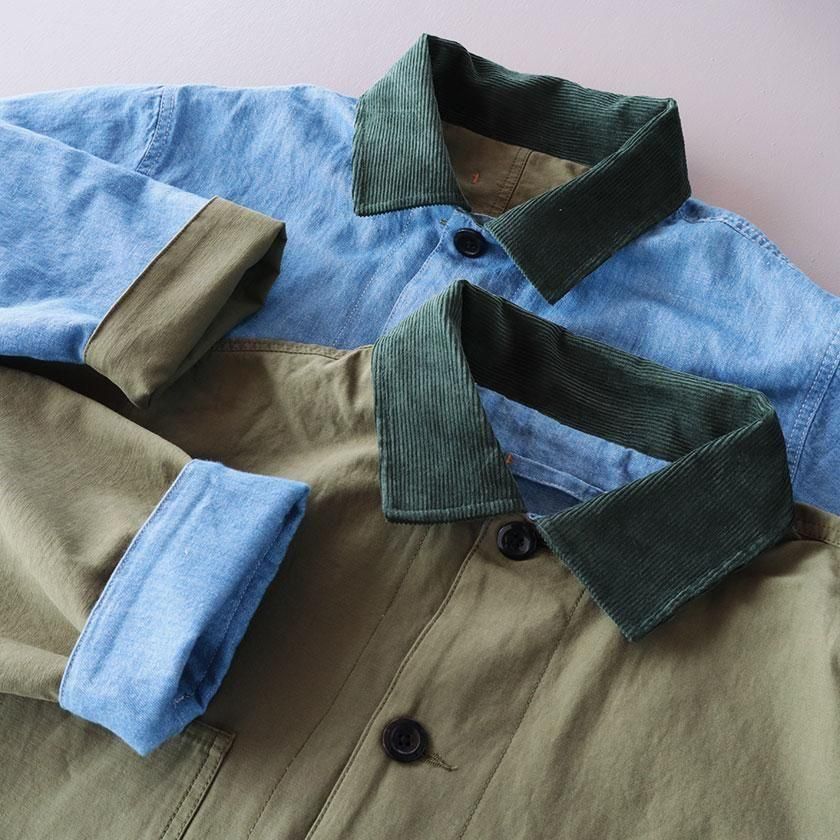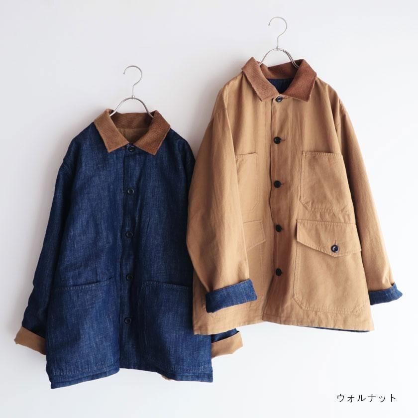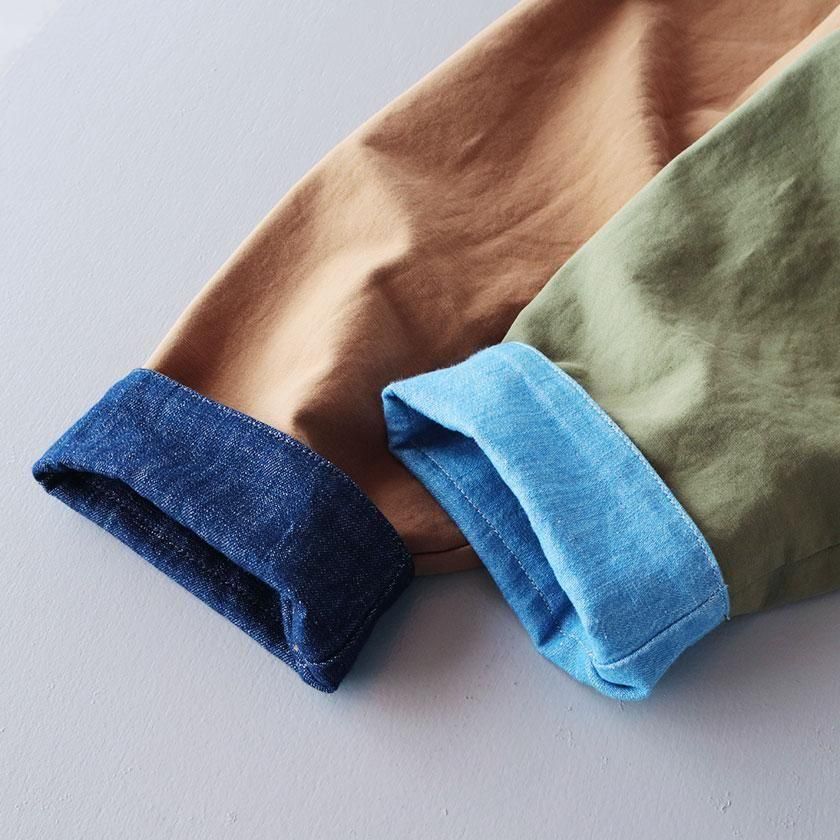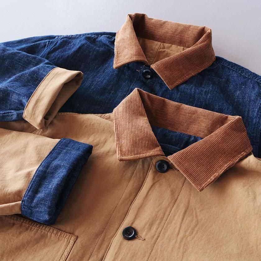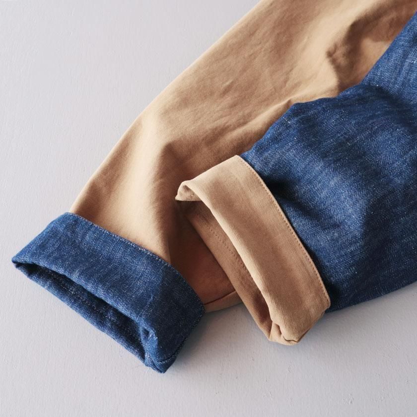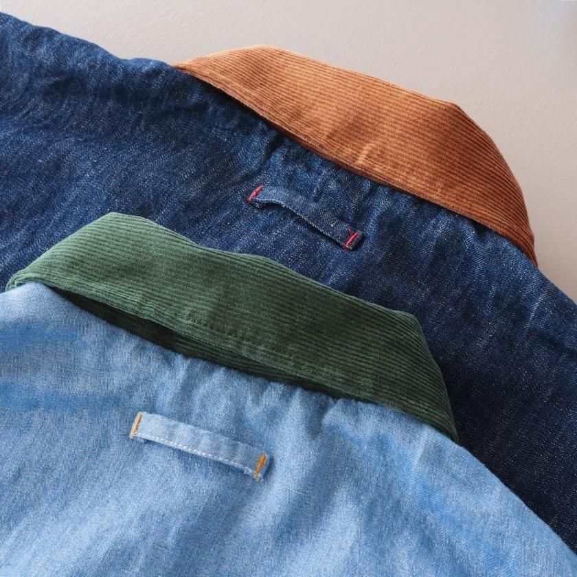 ゆとりを持たせたオーバーシルエットと、やや長めの袖丈がメンズライクな雰囲気。袖を折り返すと裏面の生地が現れてアクセントを加えます。ゆったりとした着心地なのでスウェットやセーターなど厚手のインナーも中に着込むことができ、サッと羽織るだけでカッコ良く決まりますよ。それぞれのカラーと同系色になったコーデュロイの襟もポイントに。ツイル面には大きなフロントポケットが4つ、デニム面にも2つついています。