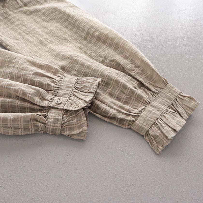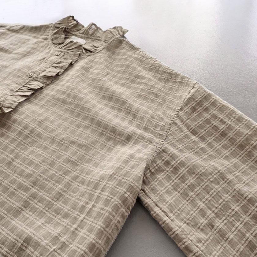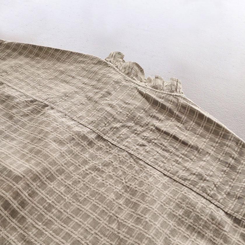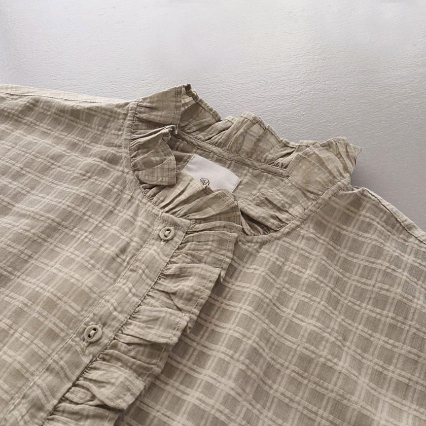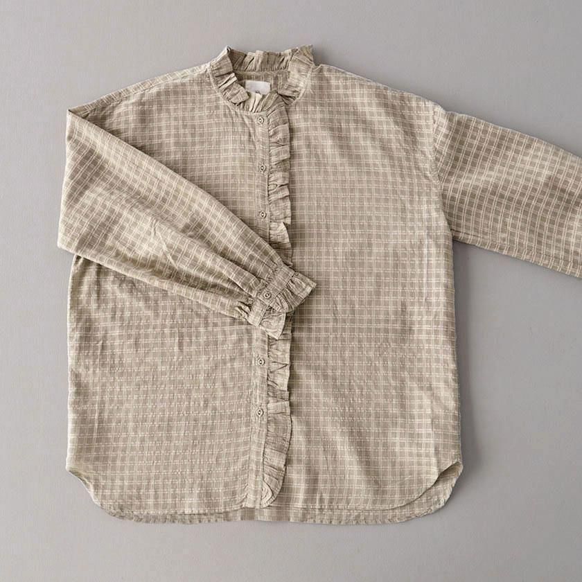 maison de soil (メゾン ド ソイル)より、手織りにより丁寧に織られたさりげないチェック柄が魅力のフリルシャツのご紹介です。
