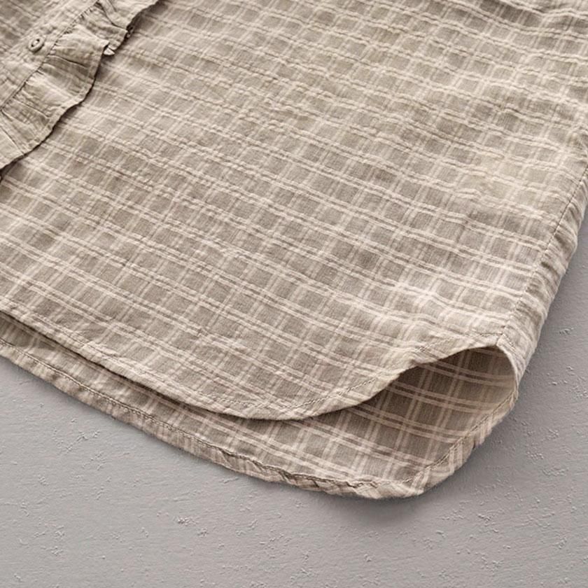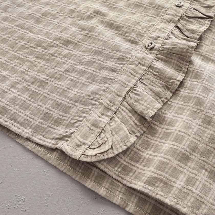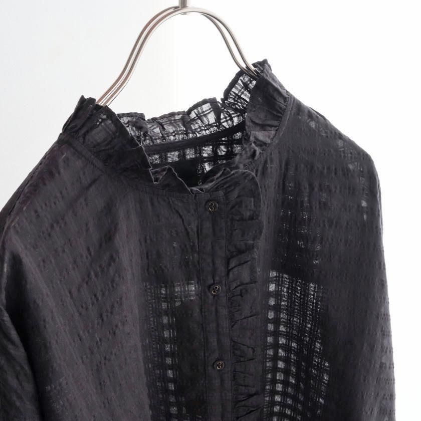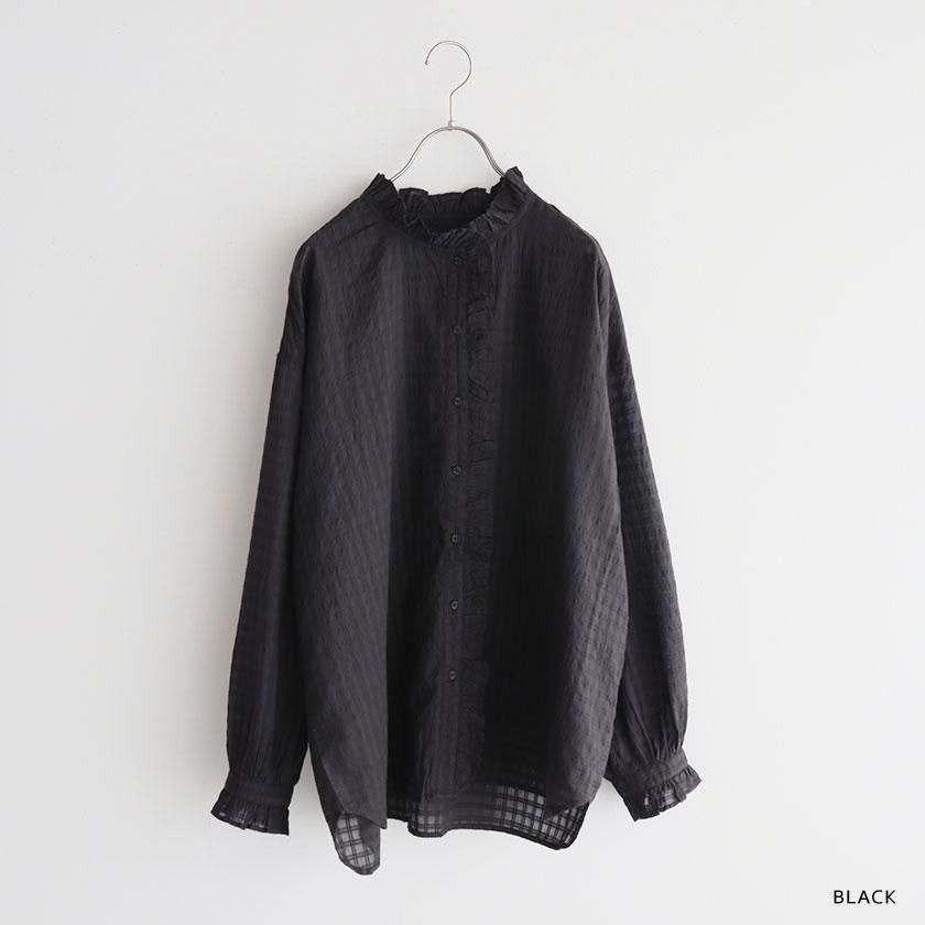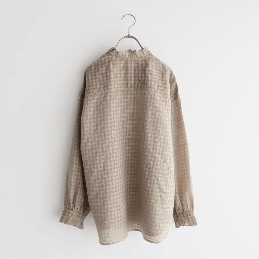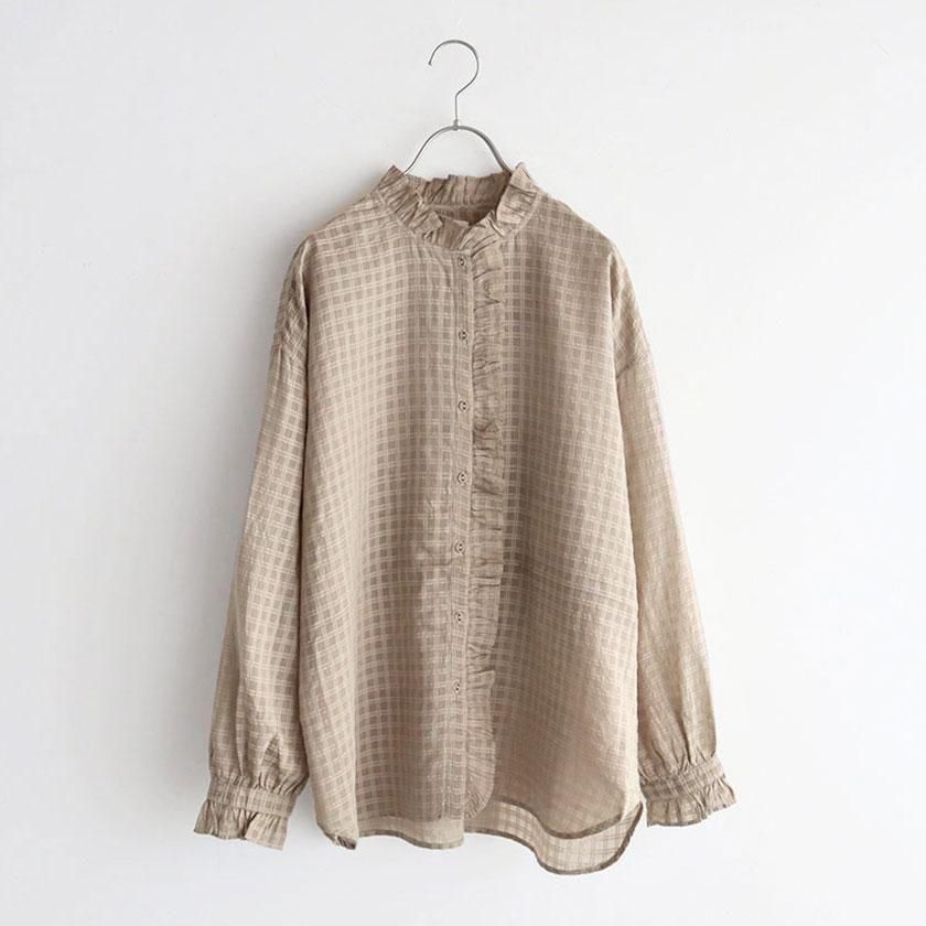 maison de soil (メゾン ド ソイル)より、手織りにより丁寧に織られたさりげないチェック柄が魅力のフリルシャツのご紹介です。