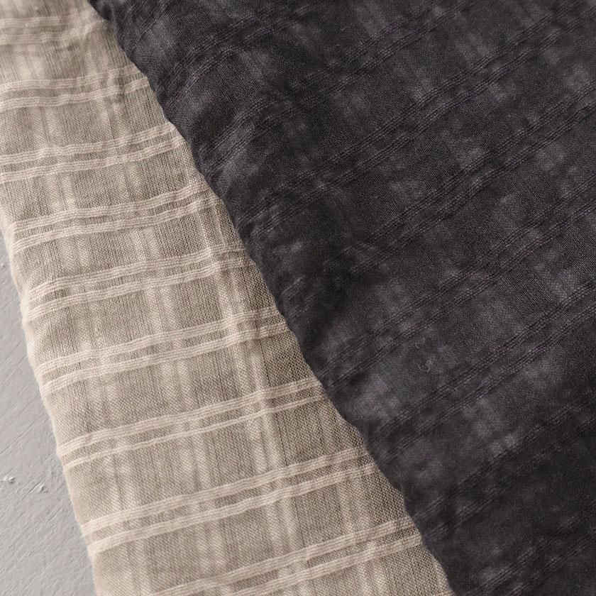 セルフチェックと呼ばれる、織組織によってチェック柄を表現した生地を使用しています。タテ糸・ヨコ糸それぞれに綿とシルクを使用した柔らかな生地感で、季節を問わず重宝します。