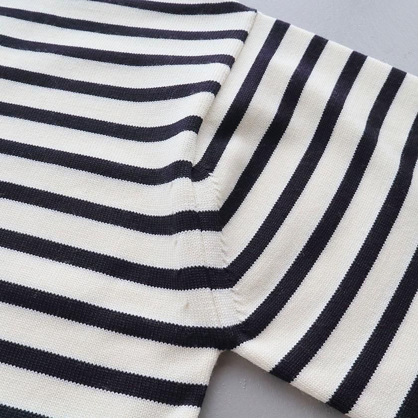 表側にウール、裏側にはマットなポリエステルを使用し、2本の編糸を同時に表裏に編み分ける、プレーティング(添え糸編)という方法で編まれた一着。カットソー感覚で使えるなめらかな肌触りはニット特有のチクチク感が苦手な方にも気兼ねなく着用いただけます。家庭で手洗い洗濯ができるのもうれしいポイントです。
