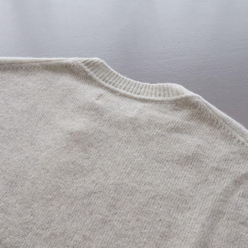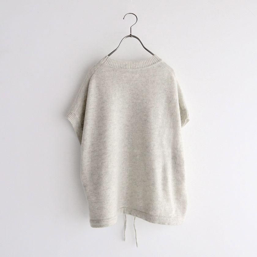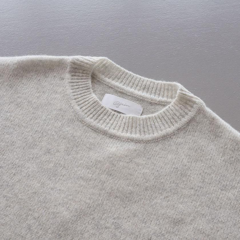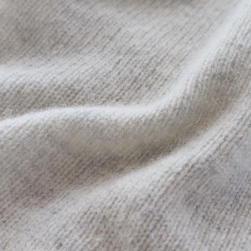 ラムとナイロンをブレンドした素材はウールよりも繊維が細かいため、ウール特有のチクチク感が少ないのが特徴。度目を詰めずに編み上げることで、ゆったりとしたシルエットでも重たくならず驚くほど軽やかな着心地に仕上げています。軽量ながらも保温性が高く、しっかりとあたたかいので秋冬のレイヤードにぴったりの一着です。
