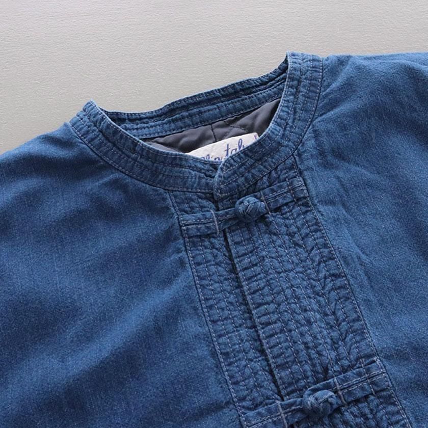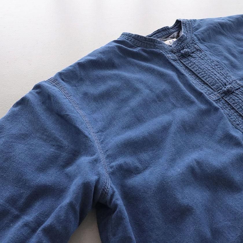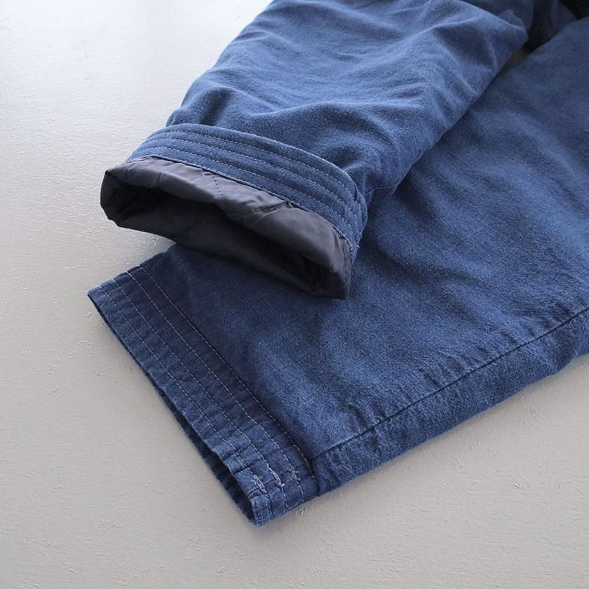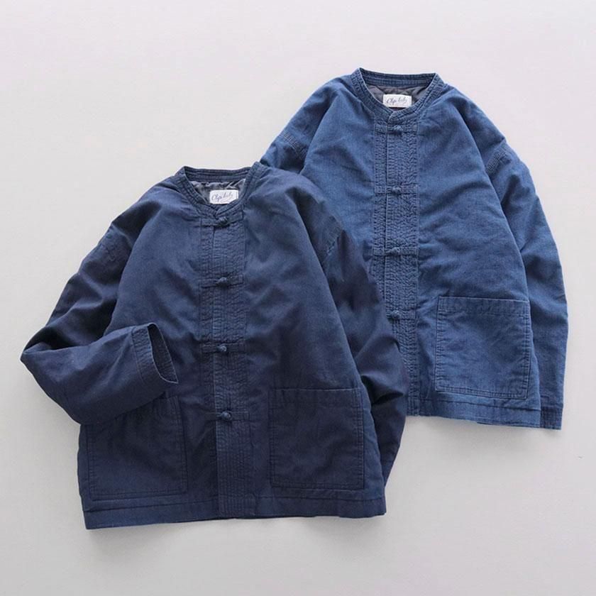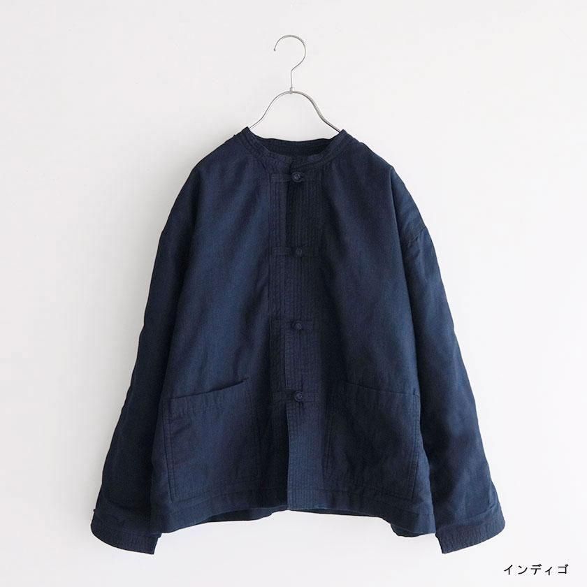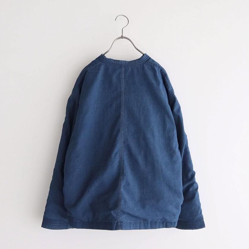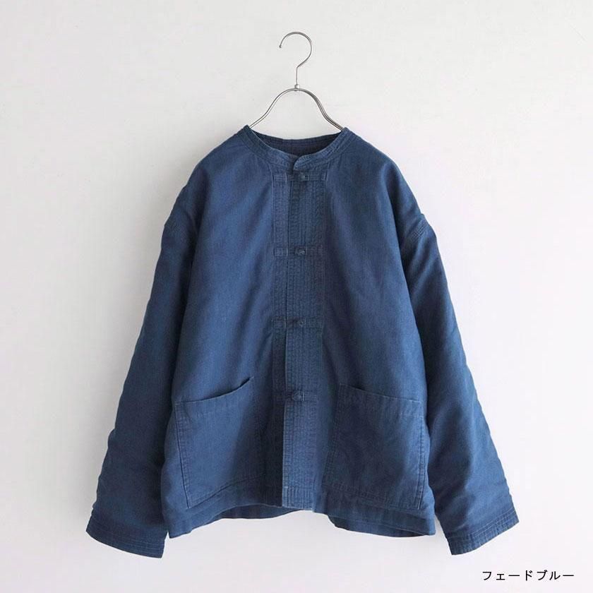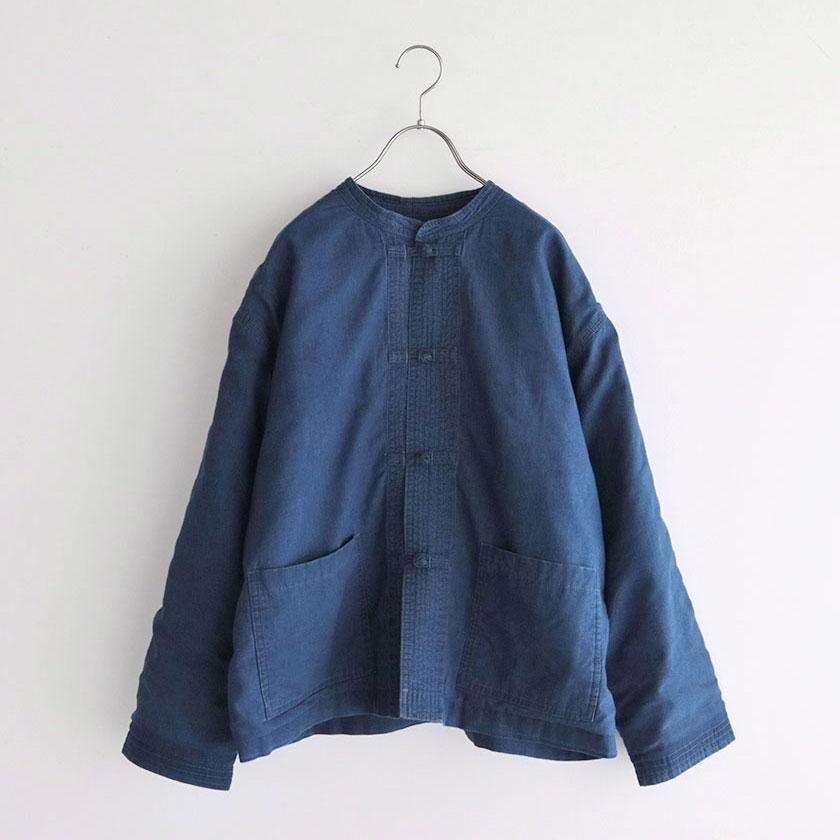 フレンチワークのディテールとチャイナ服の要素を組み合わせたワークウェアから着想を得たジャケット。表地には薄手で軽いシャンブレー生地にインディゴ染めを施し、くったりと柔らかな質感に仕上げた生地を使用。繰り返し洗いをかけていくうちに風合いの変化を重ね、自分だけの一着に育てていけるのも魅力の一つです。ボリュームを抑えた中綿を入れることで着膨れせずにすっきり見えが叶い、軽やかであたたかな着心地に仕上げています。