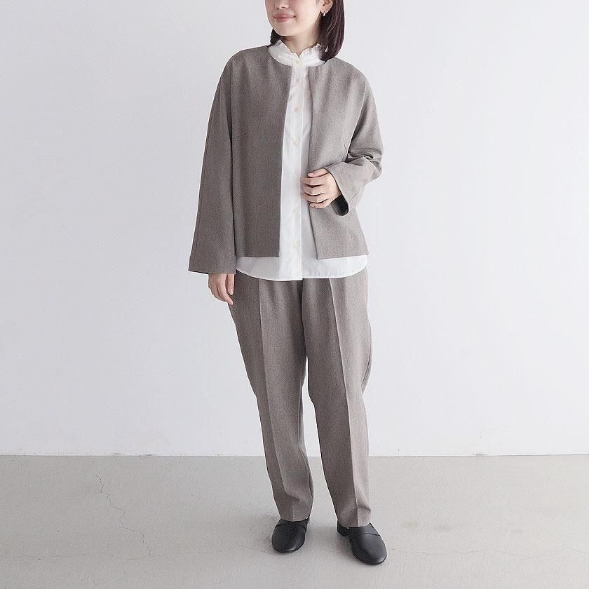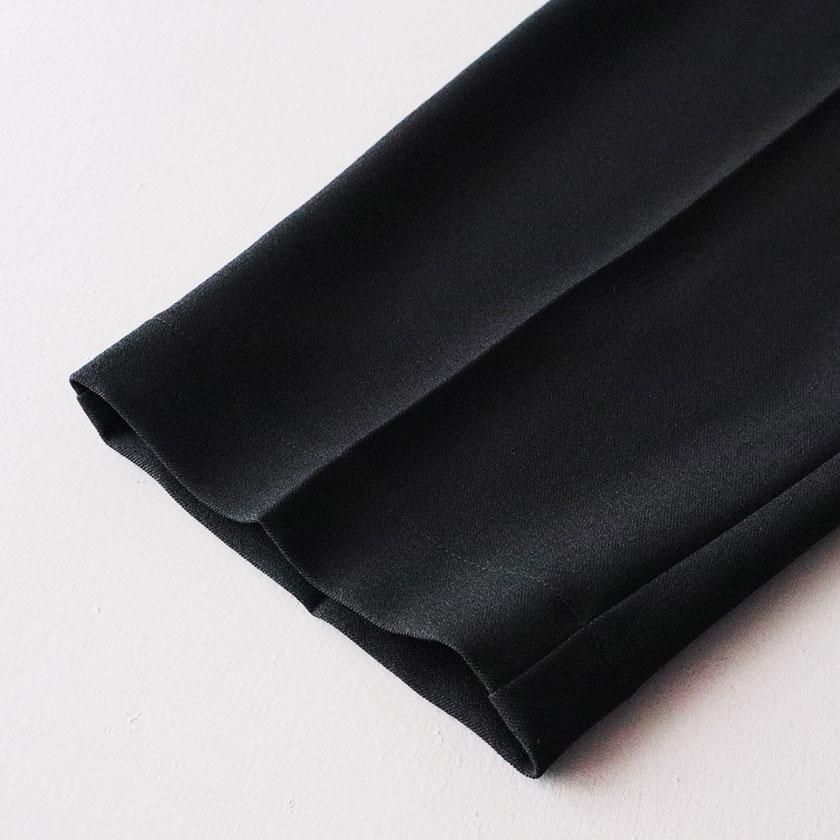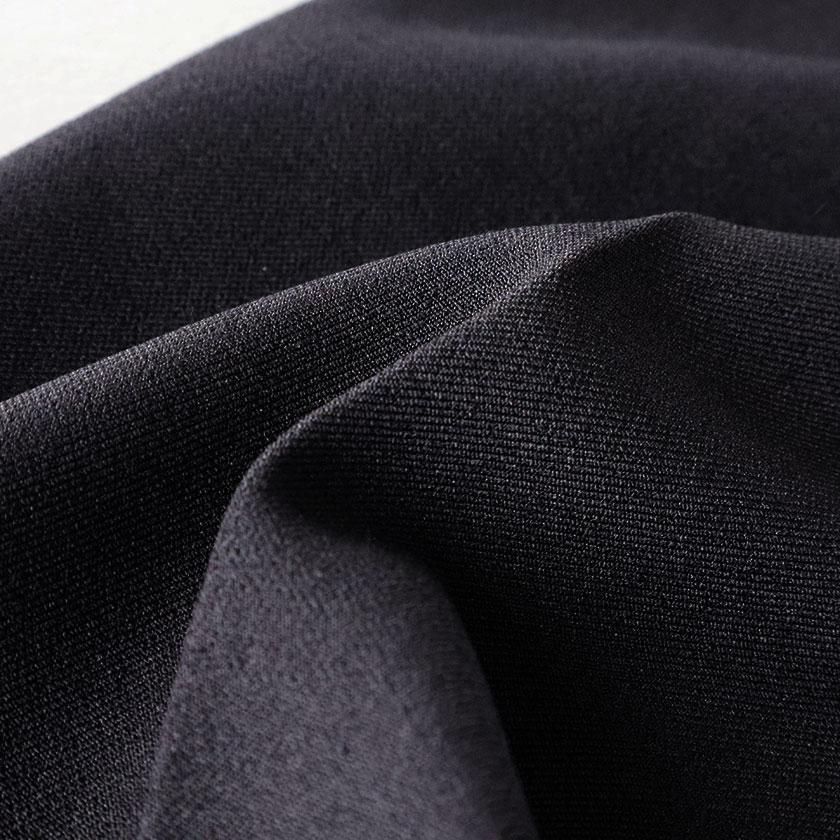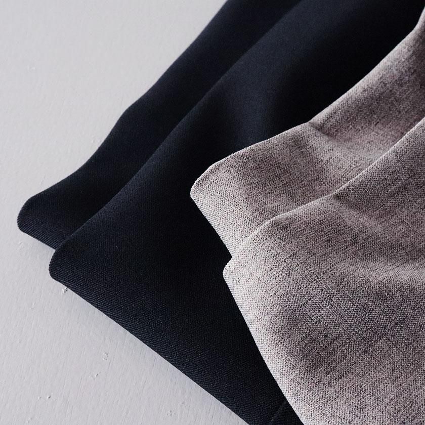 生地にはウールのような風合いを持つポリエステル素材を使用。なめらかで落ち感のある生地は美しいドレープを生み出し、気品のある装いに導いてくれます。ウールでは表現できない軽い着心地も特徴の一つ。ピリング(毛玉)ができにくく、ご家庭で手洗いできるのも嬉しいポイントです。裏地は付いておりませんが、透け感を気にせず軽やかにご着用いただけます。