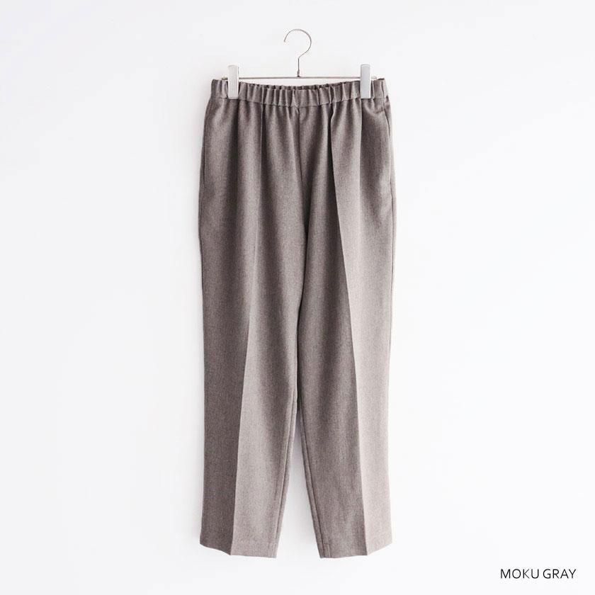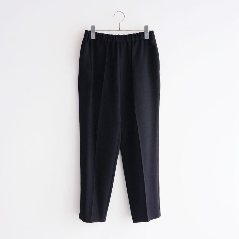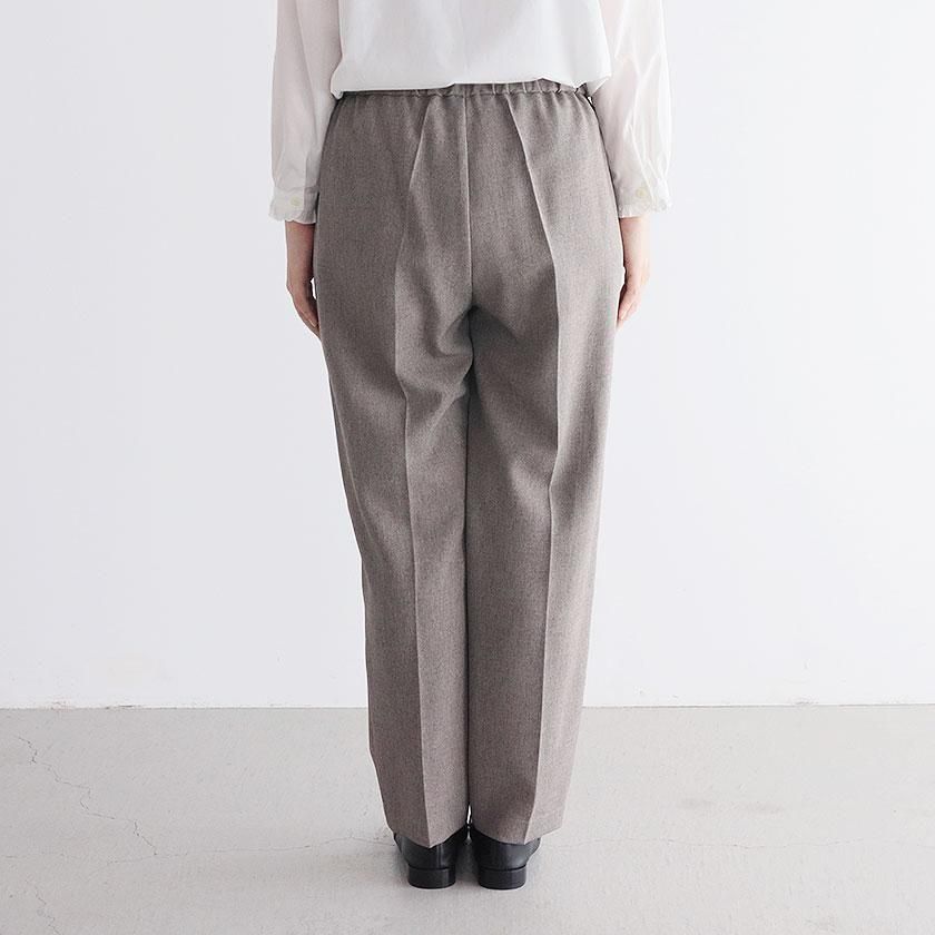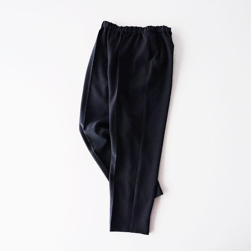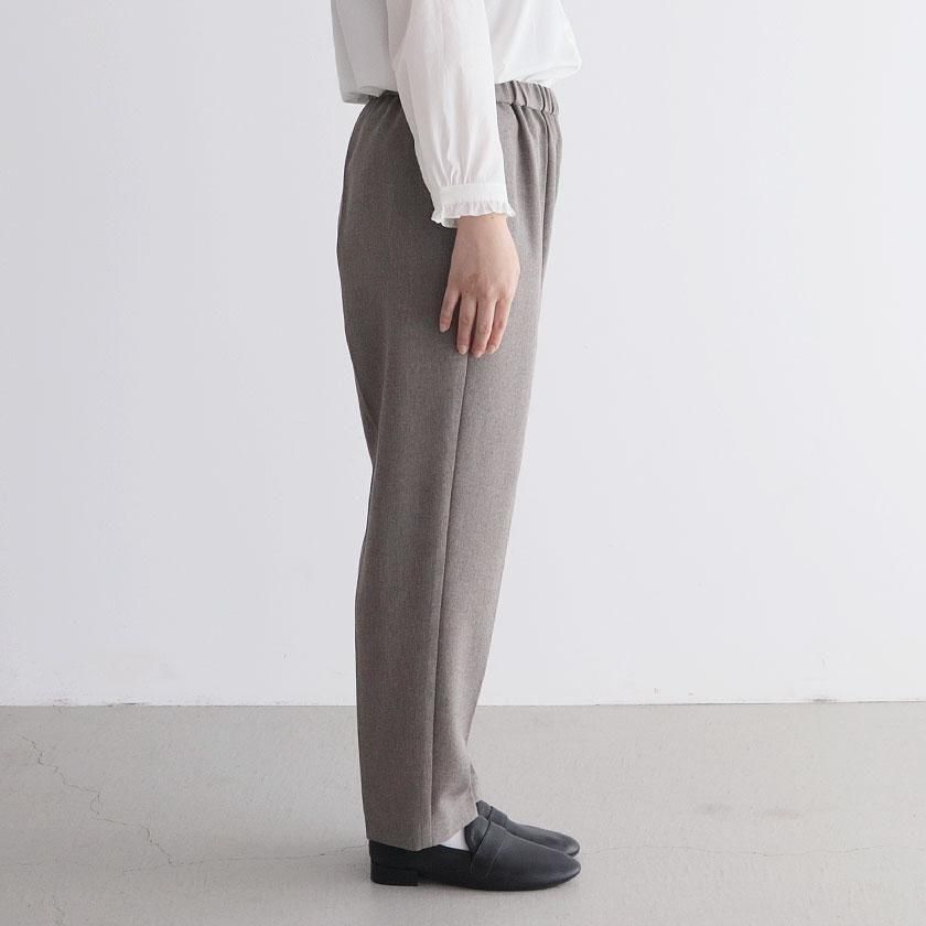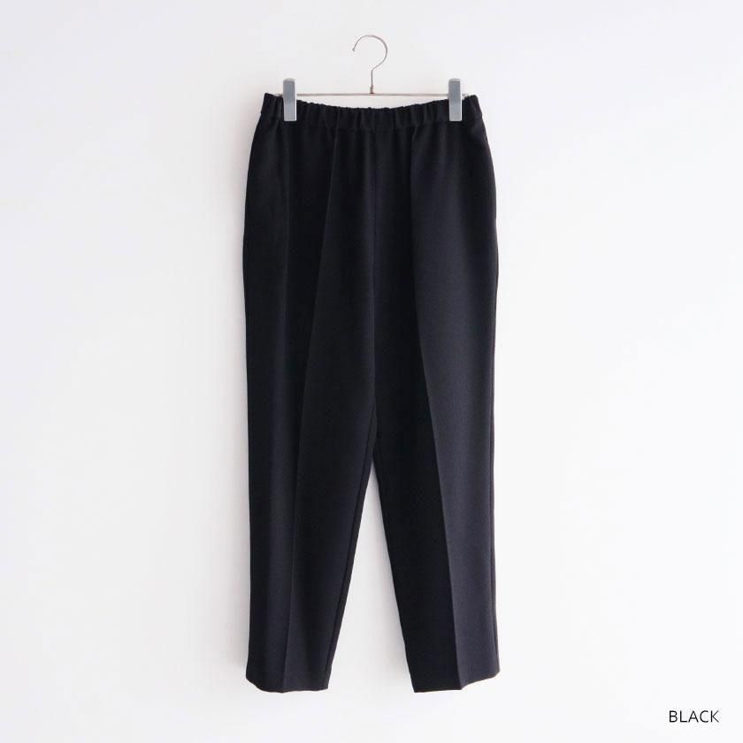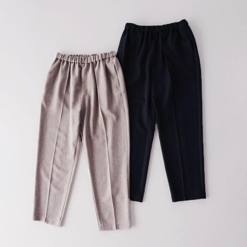 全体的にほどよくゆとりを持たせて脚のラインを拾わないサイジングに。しっかり縦にラインが入ったセンタープレスと裾に向かって細くなるテーパードの効果で脚をすっきりと細く見せてくれます。ウエストは総ゴム仕様でストレスフリーな穿き心地。両サイドにはポケットが付いています。