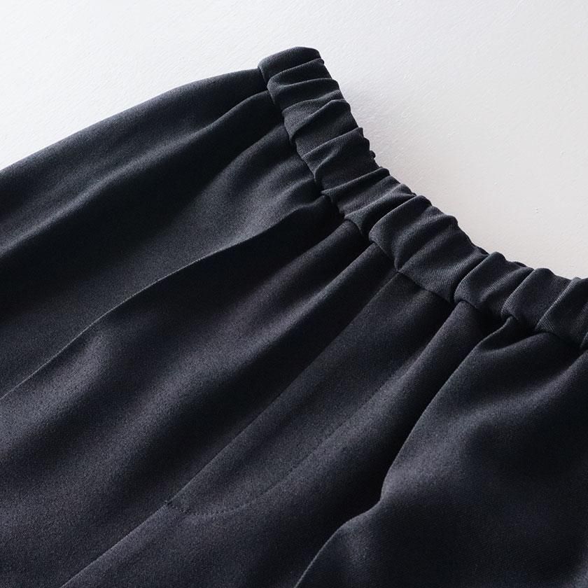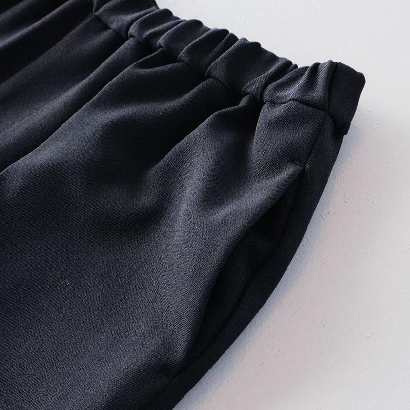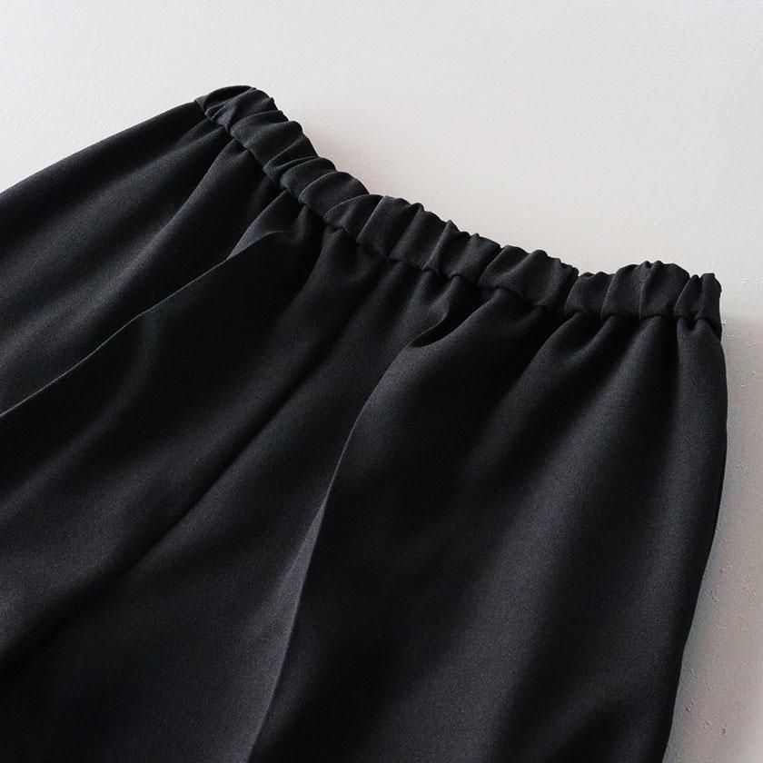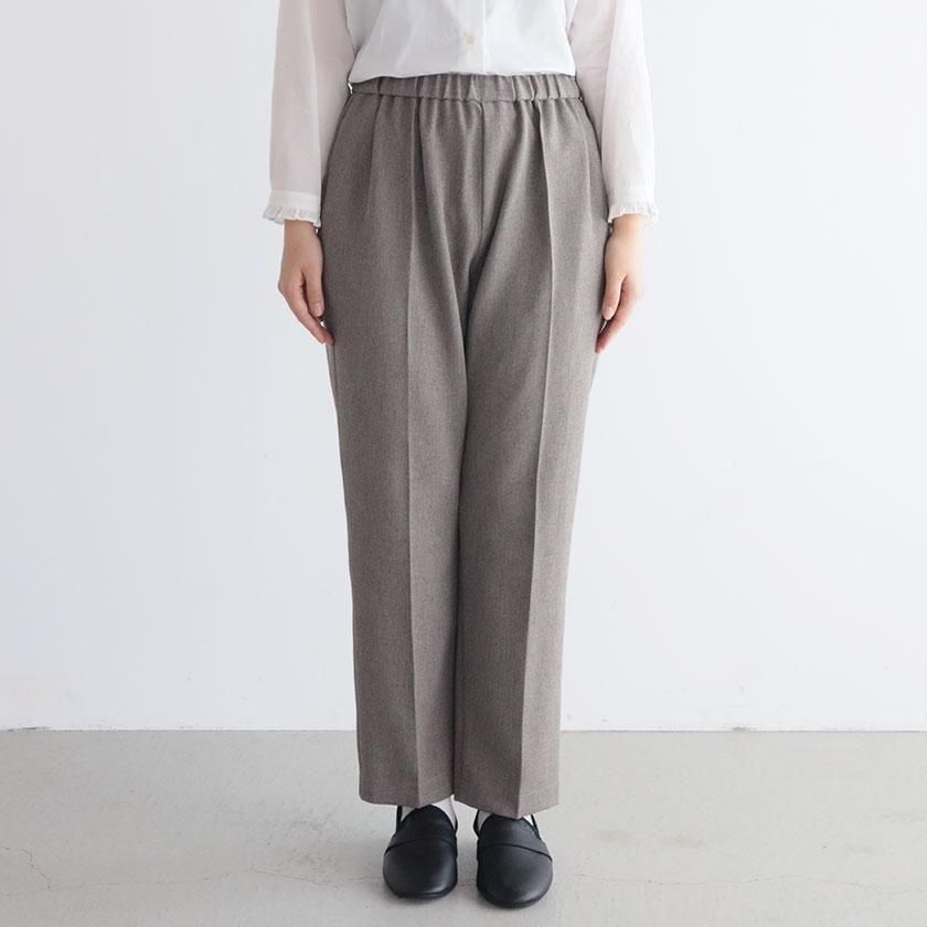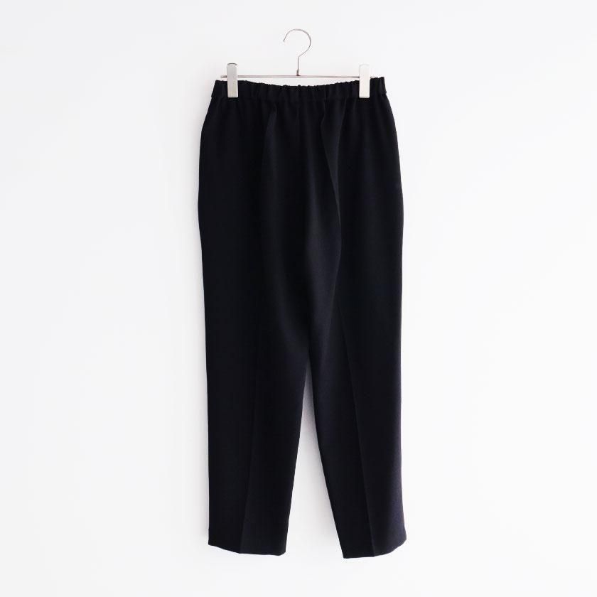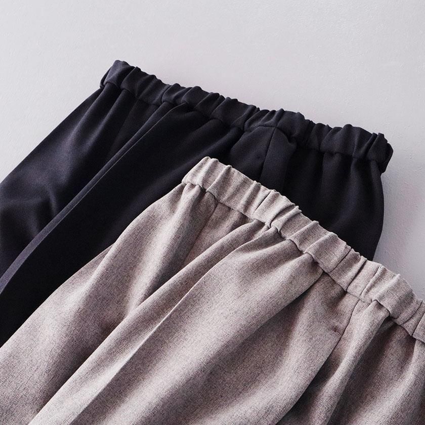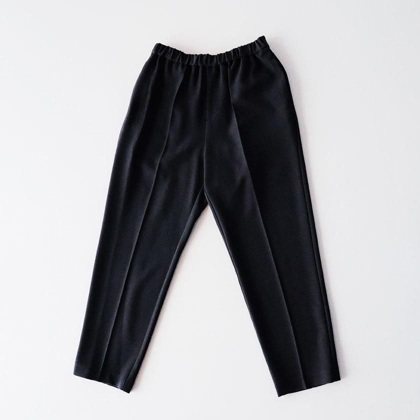 全体的にほどよくゆとりを持たせて脚のラインを拾わないサイジングに。しっかり縦にラインが入ったセンタープレスと裾に向かって細くなるテーパードの効果で脚をすっきりと細く見せてくれます。ウエストは総ゴム仕様でストレスフリーな穿き心地。両サイドにはポケットが付いています。