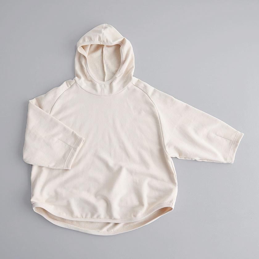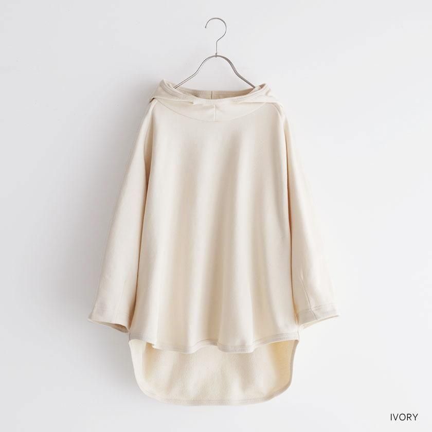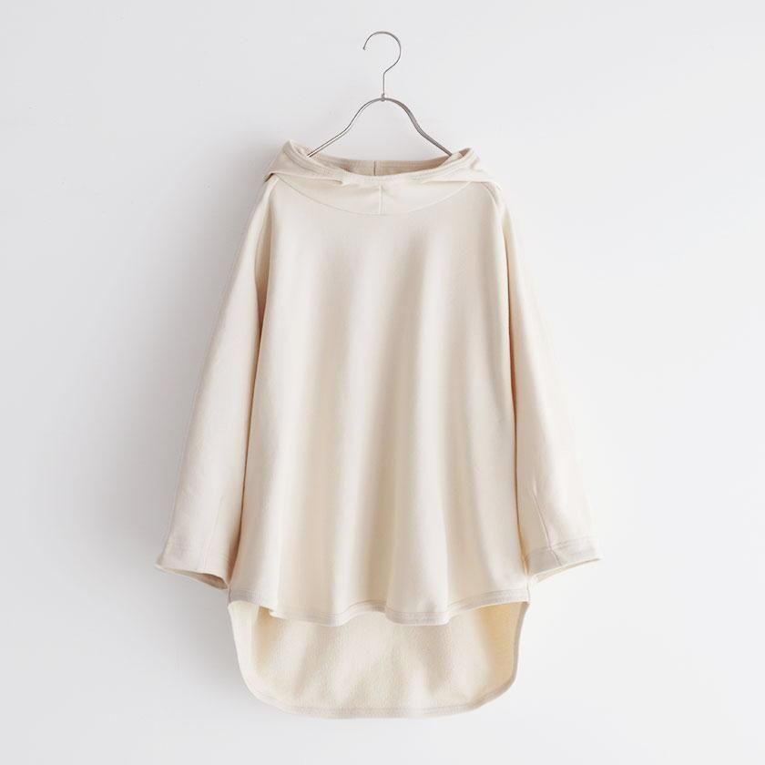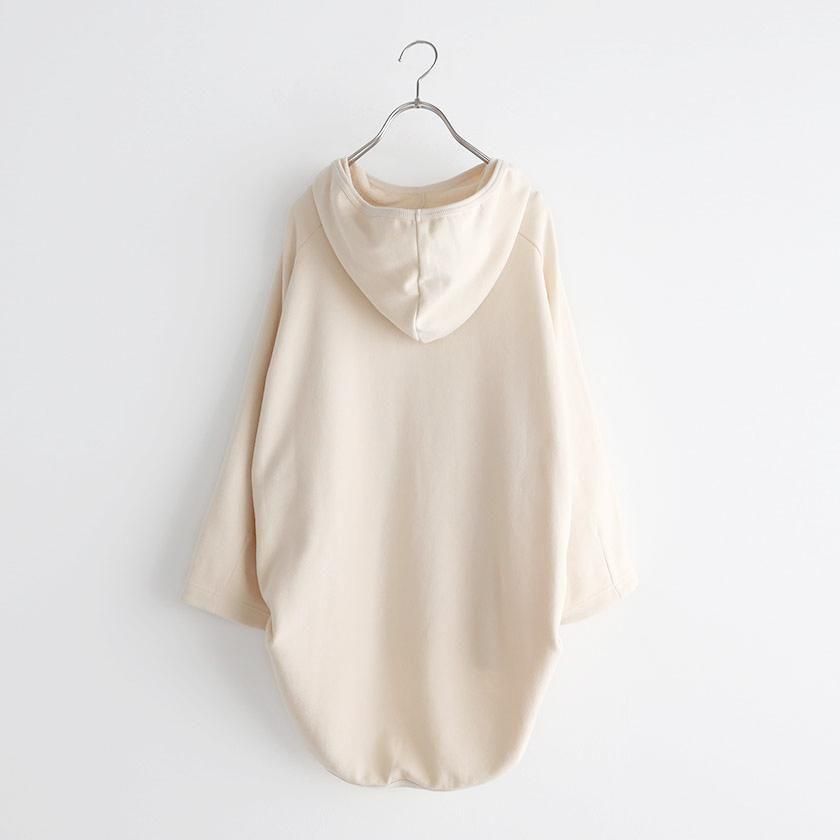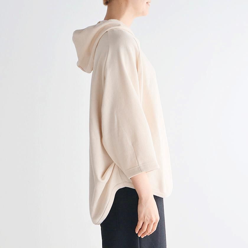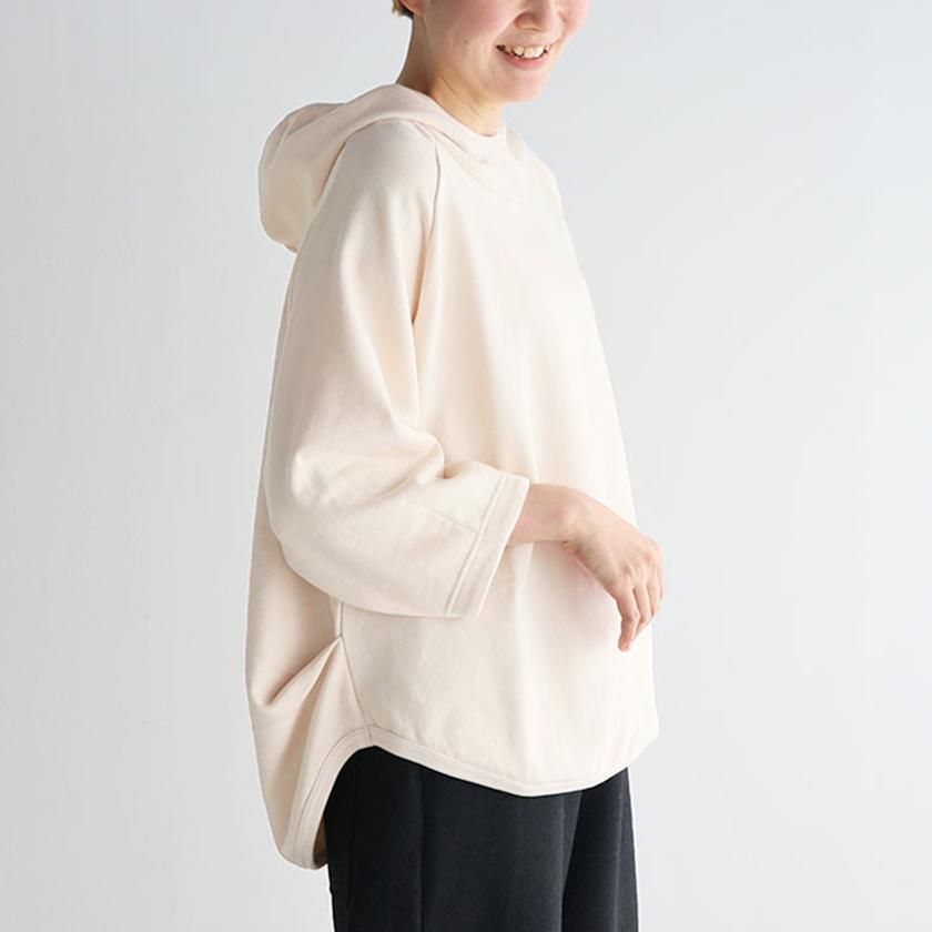 ESTROISLOSEならではの立体的なフォルムが特徴。ゆったりとした身幅とボリュームのある袖でリラックスして着れるサイズ感です。丸く立ち上がった首元と小さめのフードがポイントに。変形のラグランスリーブは袖口に向かって少しすぼまり、手首が見えるやや短めの袖丈にすることで抜け感をプラスしています。着丈は前後差をつけて後ろ身頃を長めにとった、立体的な丸みのあるヘムライン。気になるヒップラインをさりげなくカバーしてくれるのも嬉しいですね。