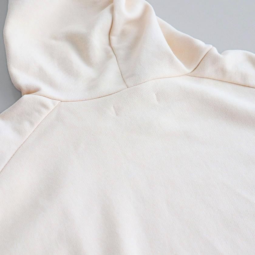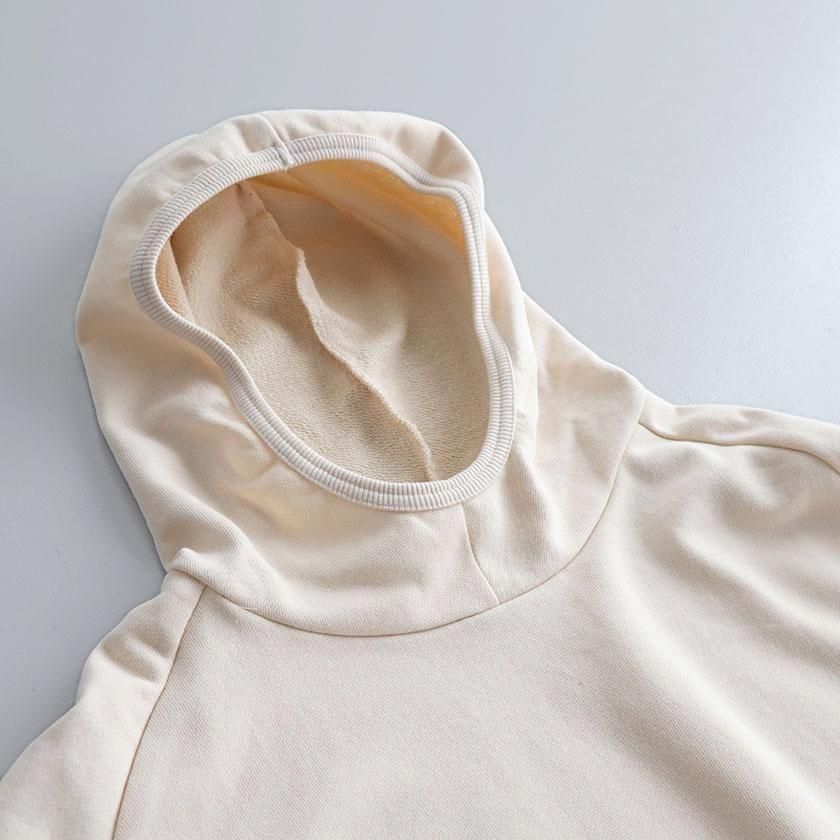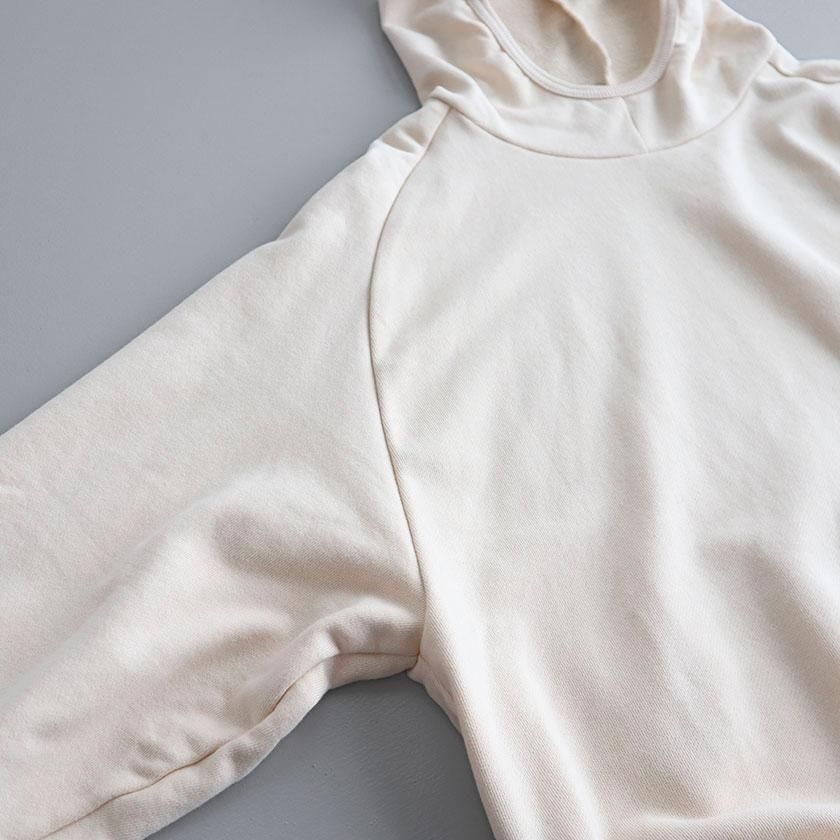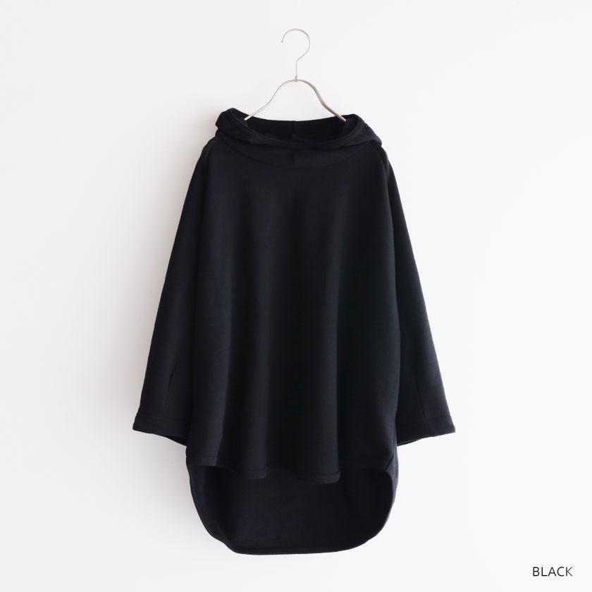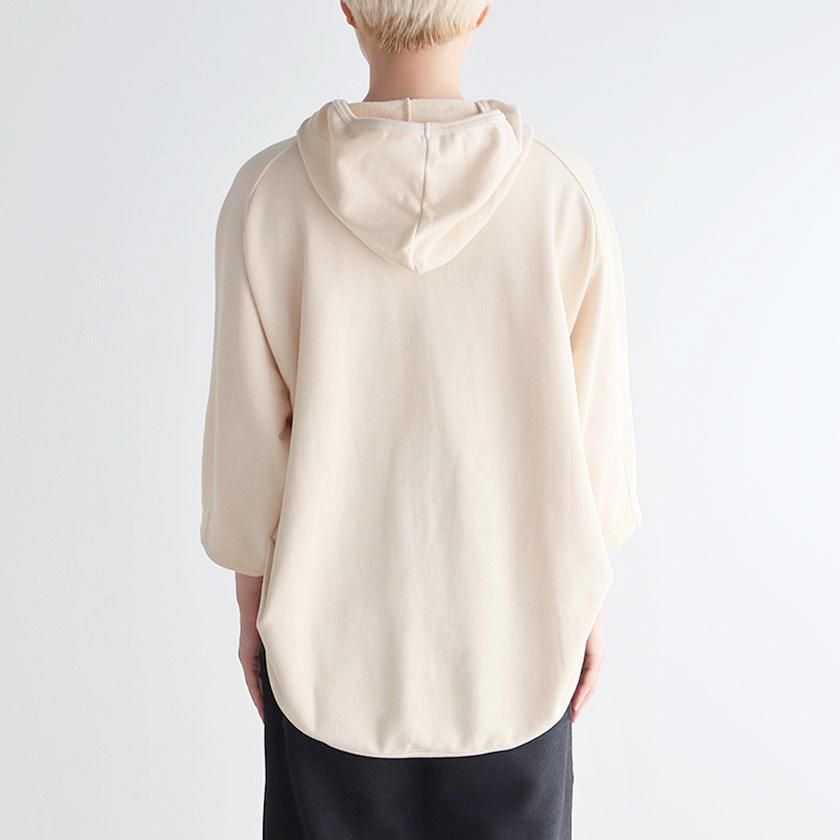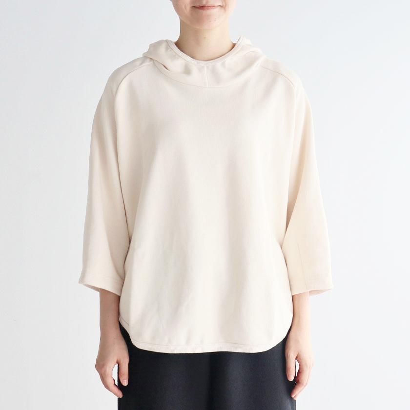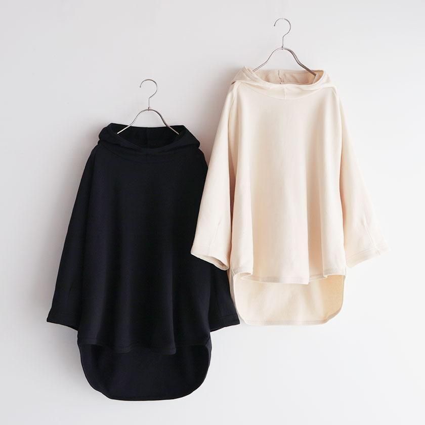 ESTROISLOSEならではの立体的なフォルムが特徴。ゆったりとした身幅とボリュームのある袖でリラックスして着れるサイズ感です。丸く立ち上がった首元と小さめのフードがポイントに。変形のラグランスリーブは袖口に向かって少しすぼまり、手首が見えるやや短めの袖丈にすることで抜け感をプラスしています。着丈は前後差をつけて後ろ身頃を長めにとった、立体的な丸みのあるヘムライン。気になるヒップラインをさりげなくカバーしてくれるのも嬉しいですね。