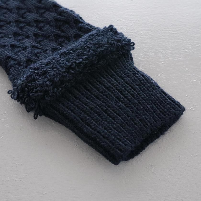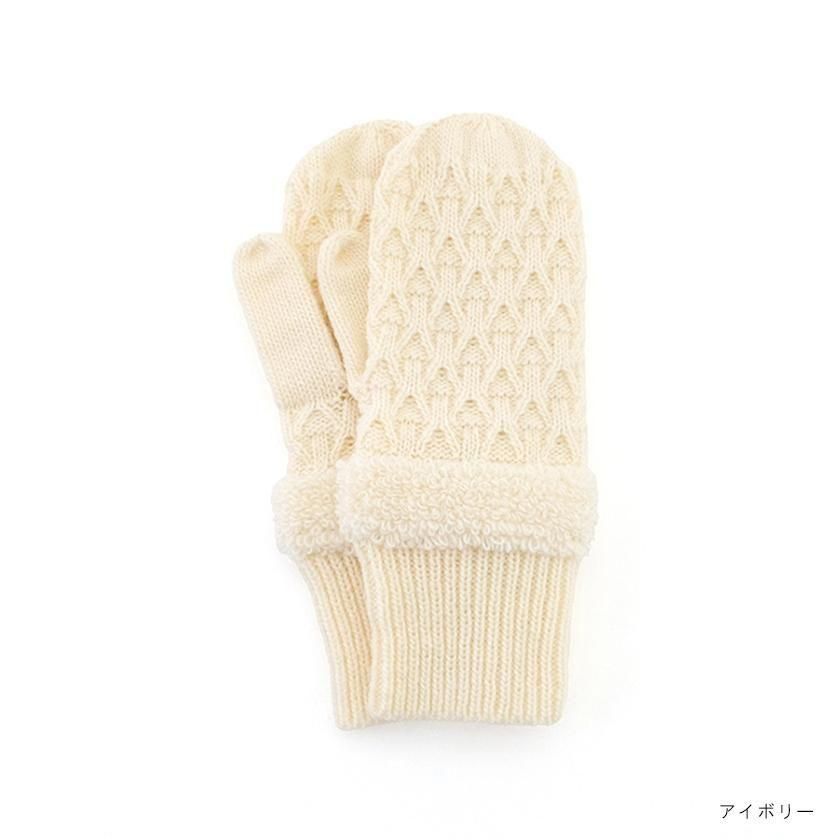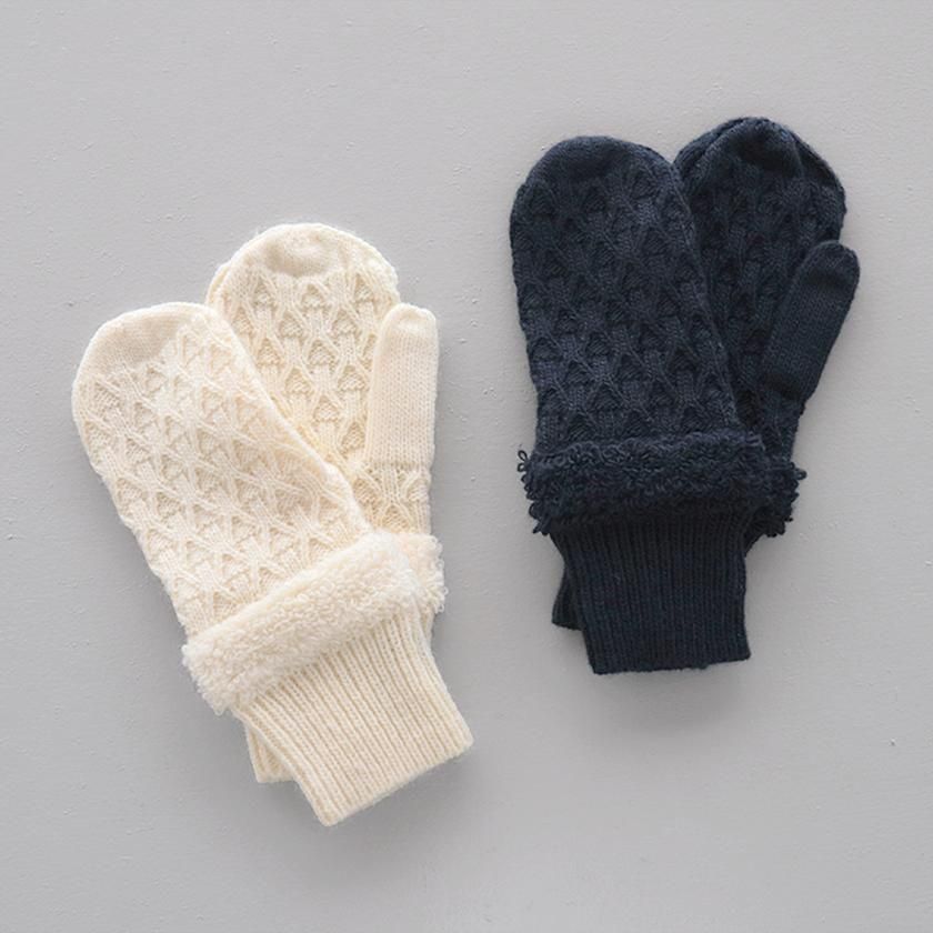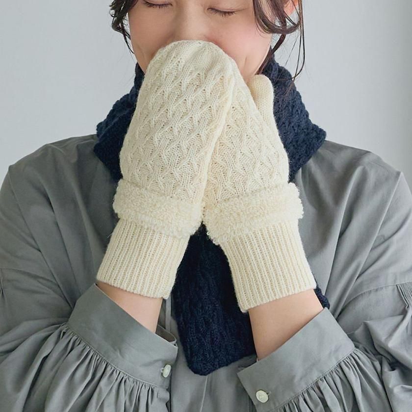 三角地模様とループ編みを組み合わせた表情豊かなミトンは細部までこだわりを感じられ、身に着けるだけで手元のさりげないアクセントになってくれますよ。使わないときもコンパクトになるので、バッグやポケットに入れてもかさばらないのが嬉しいポイントです◎