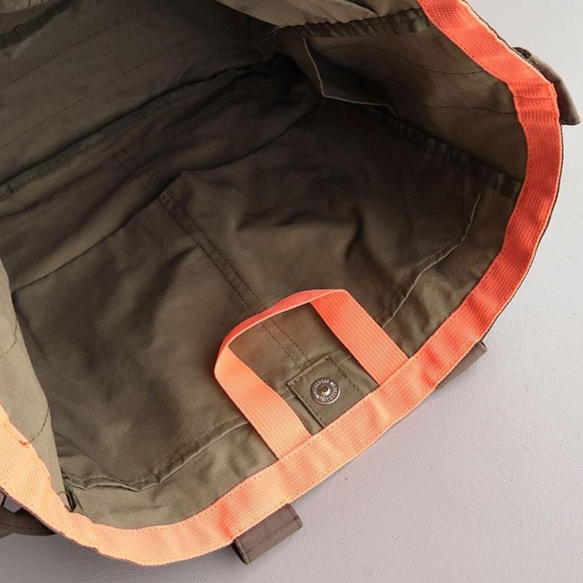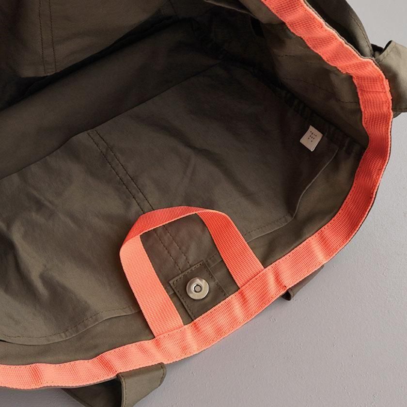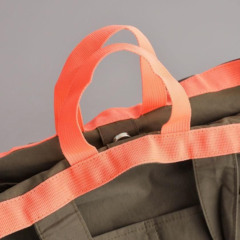マットな色合いのボディに、開口部と手持ちハンドルとして施された配色テープがアクセントに。それぞれのカラーごとに異なる組み合わせになっていますよ。ショルダーストラップをループに結ぶと斜め掛けもできるようになります。ストラップを結ぶ箇所によって長さの調節も可能◎荷物やコーデによって使い分けできるのが嬉しいですね。