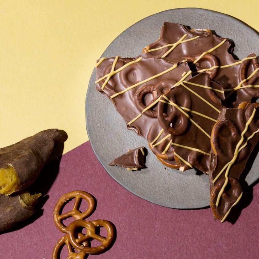 やさしい甘さの安納芋を合わせたミルクチョコレートに塩をまぶしたプレッツェルを掛け合わした逸品。カリカリっとした食感と甘じょっぱさがクセになる、ありそうでなかった和と洋のコラボは当店でしか味わえないオリジナルのフレーバーです。