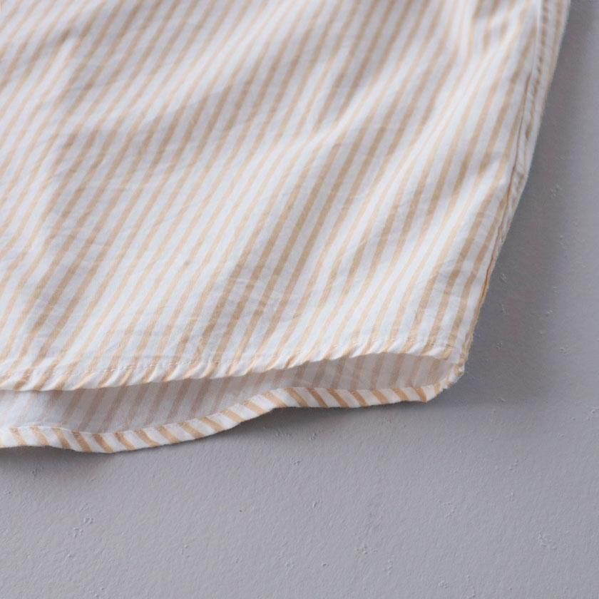糸ムラが少なく、強度と光沢感がある糸を使用したブロード生地で仕立てた一着。生地自体に滑らかな肌触りとツヤ感があるためカジュアルになりすぎず、カチッとした印象を演出します。薄手のさらりとした肌触りで一年を通して活躍してくれますよ。