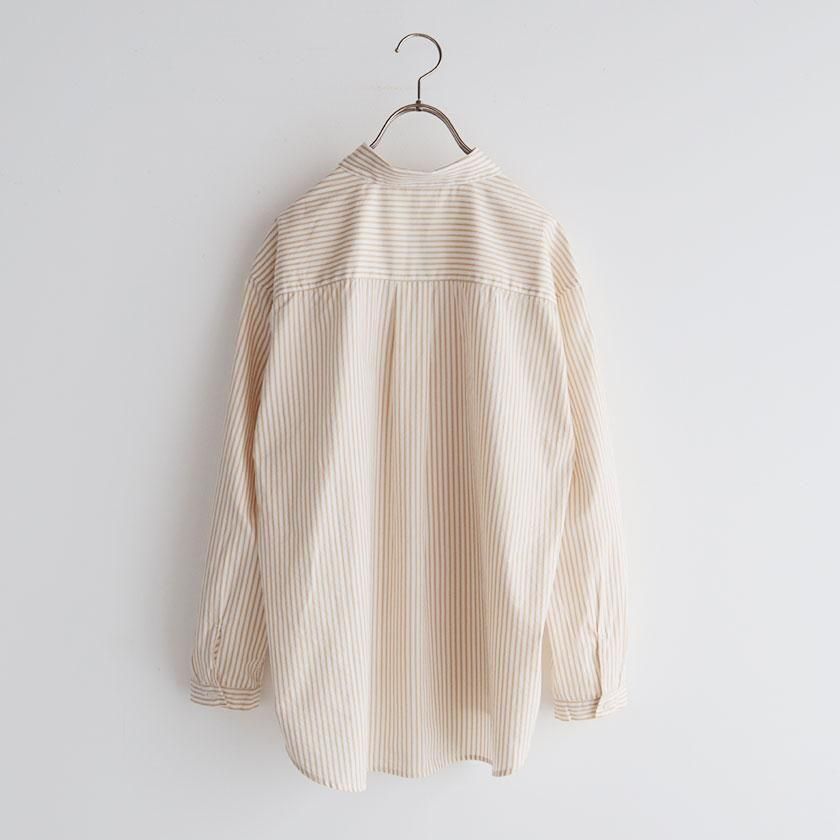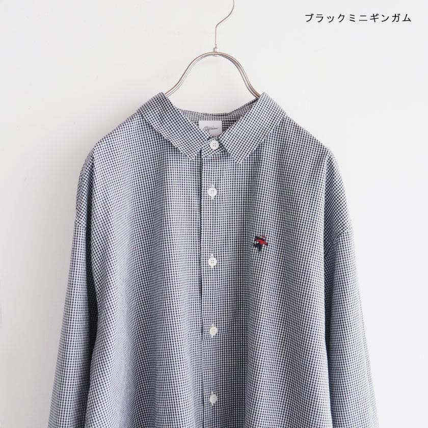 ほどよくゆとりのあるシルエットにヒップが隠れるくらいの丈感で、体のラインを拾わず楽な着心地です。一見するとスタンダードな襟付きシャツですが、ニットやスウェットのインナーとして合わせやすいように着丈を少し長めに設定し、裾をラウンドさせることで重ね着した際にもスッキリ見えるような仕上がりに。年齢や体型を問わずどんな方にも取り入れやすい一枚です。