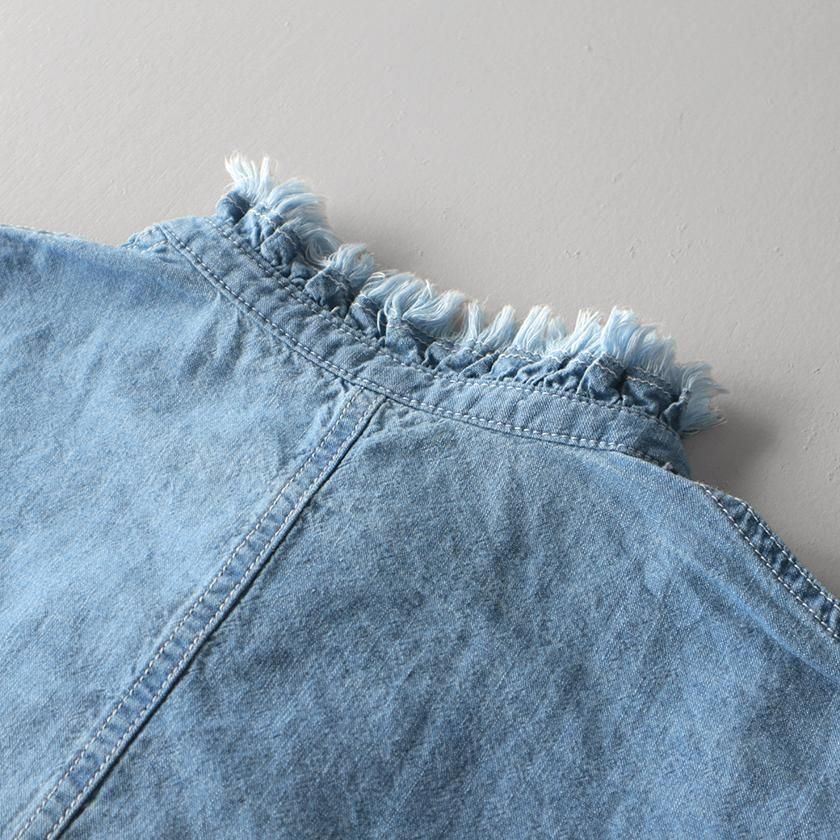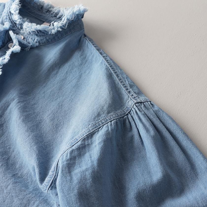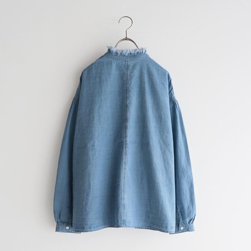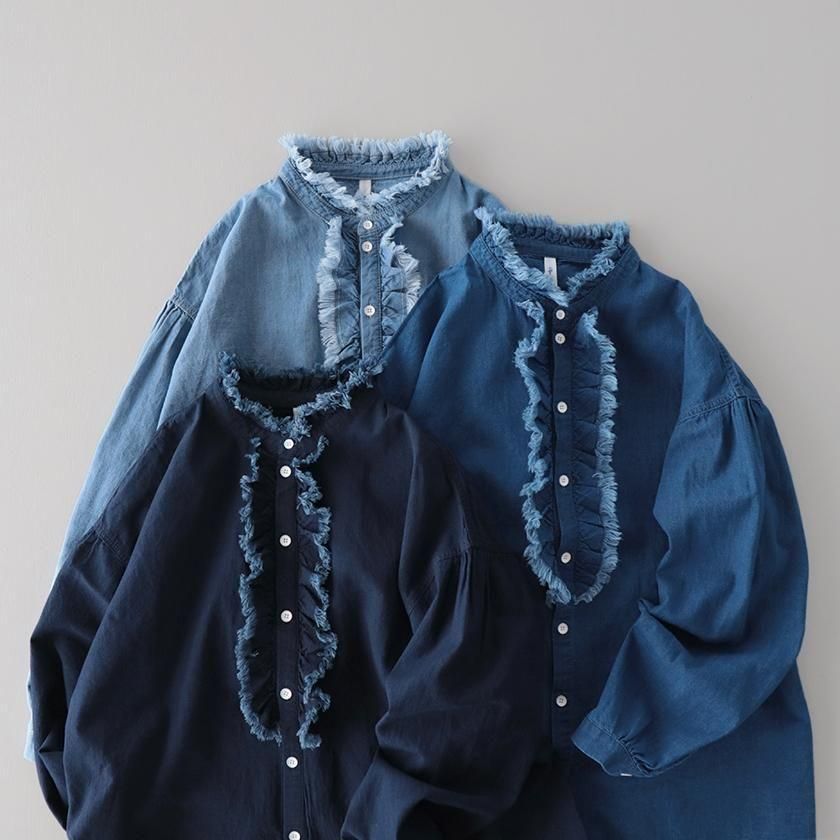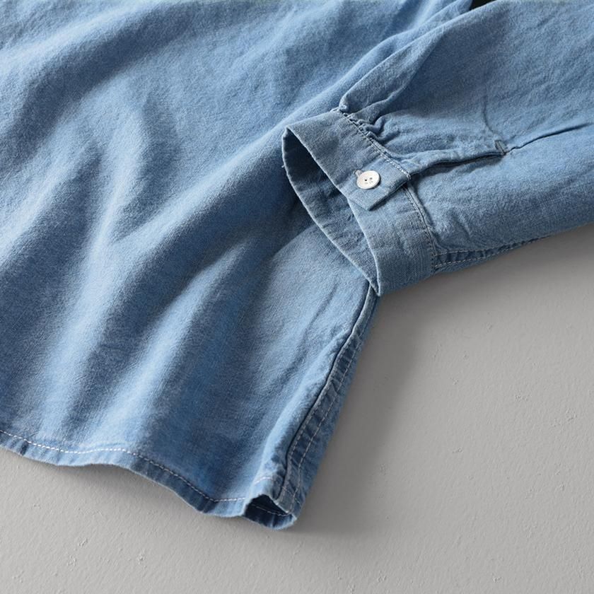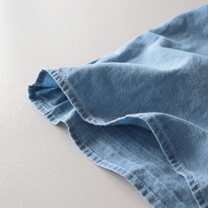 Clip.tab (クリップタブ) の定番人気素材、インディゴシャンブレーを使用。薄手で軽いシャンブレー生地にインディゴ染めを施し、くったりと柔らかな質感に仕上げています。繰り返し洗いをかけていくうちに風合いの変化を重ね、自分だけの一着に育てていけるのも魅力の一つです。