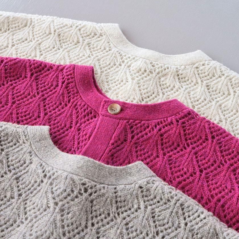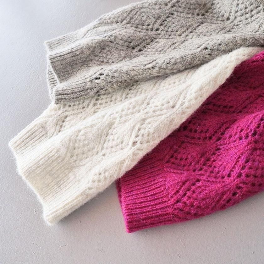 秋の落ち葉をイメージしたブランドオリジナルのリーフ柄を繊細なレース編みで表現した一着。ウールのあたたかみある質感はそのままに、ナイロンを混紡することでふんわり柔らかく、軽やかな着心地に。軽量ながらも保湿性にも優れているため、秋冬のレイヤードスタイルにぴったりです。