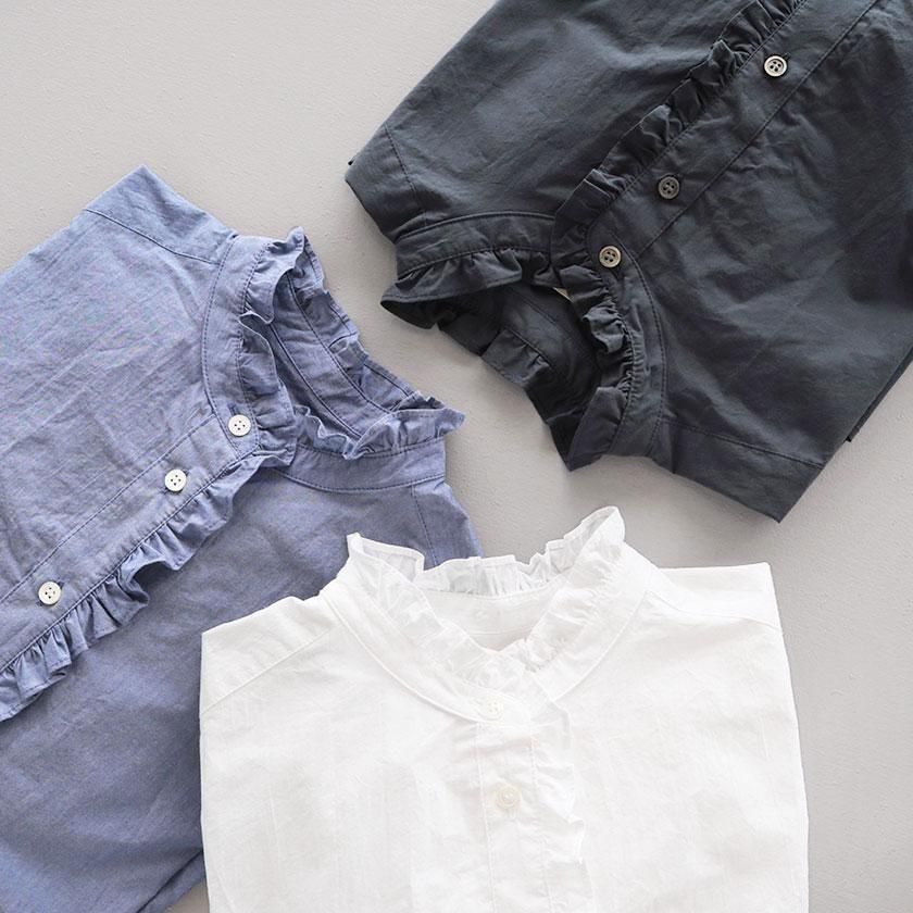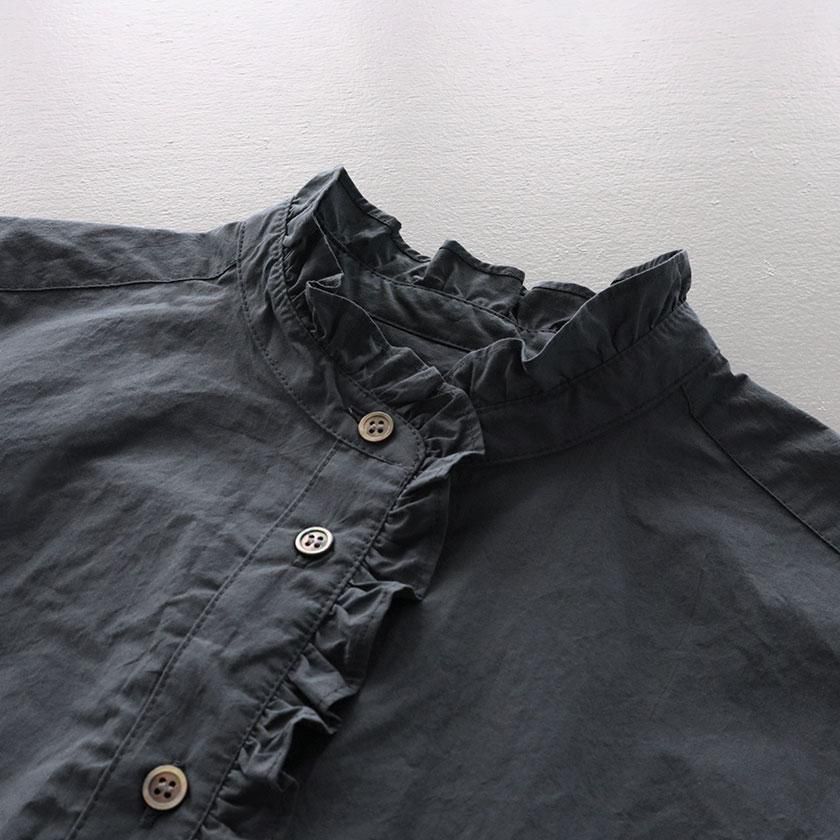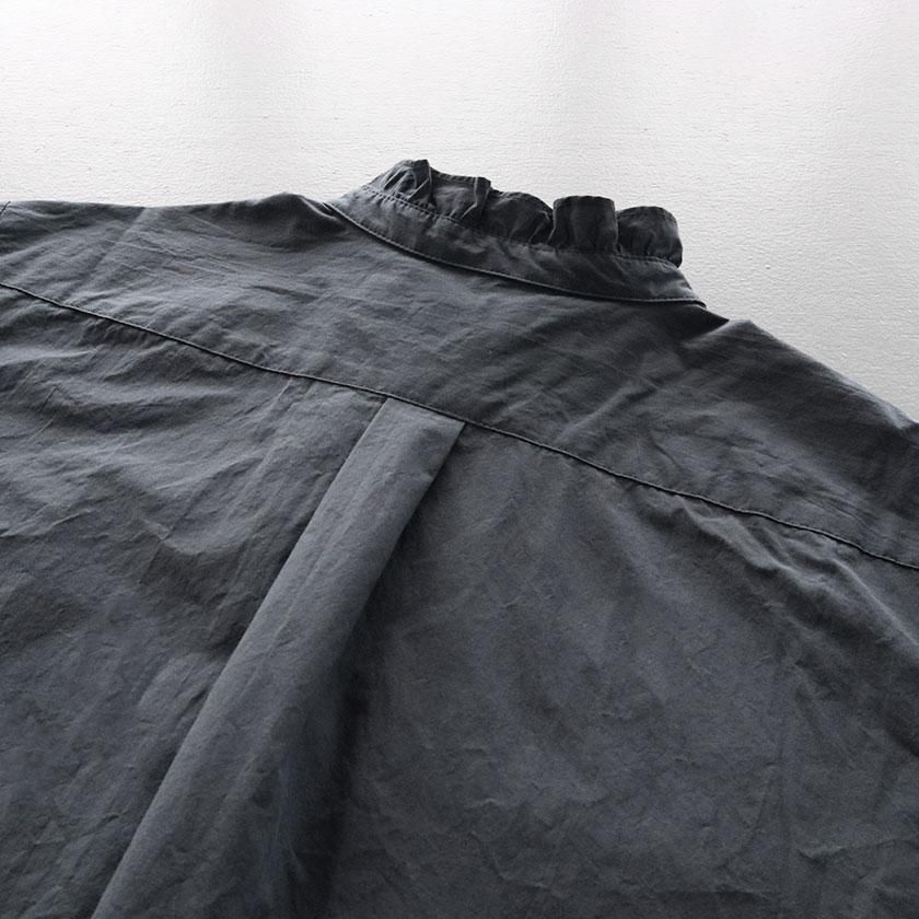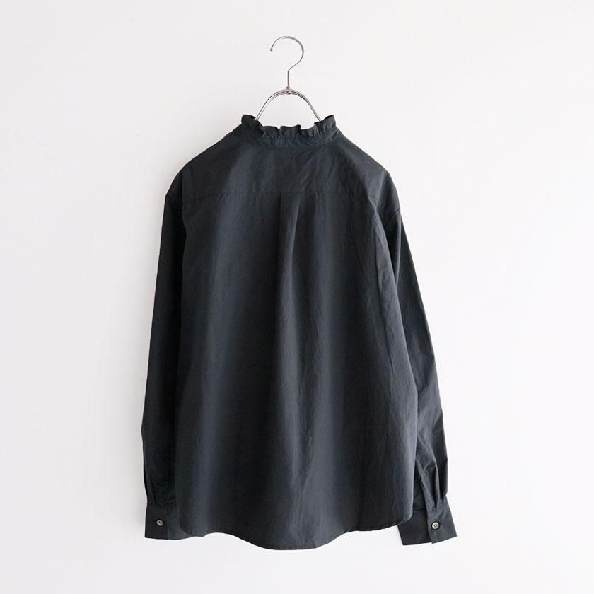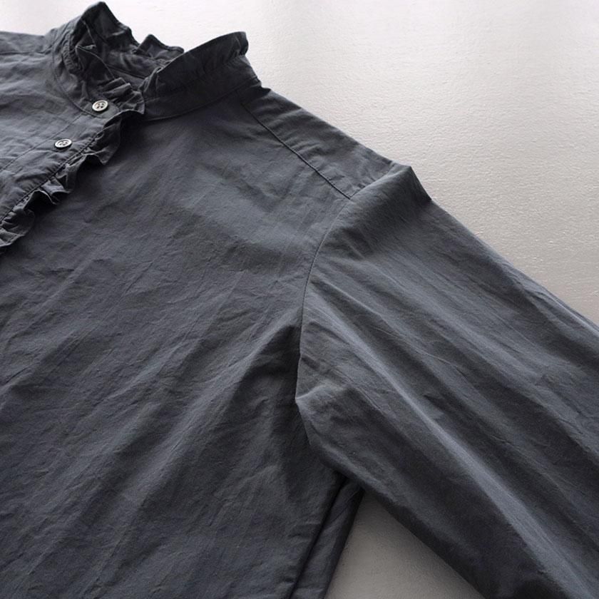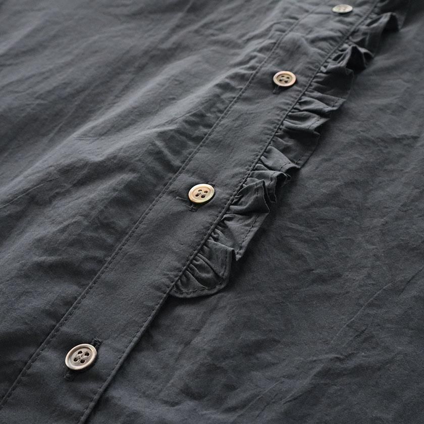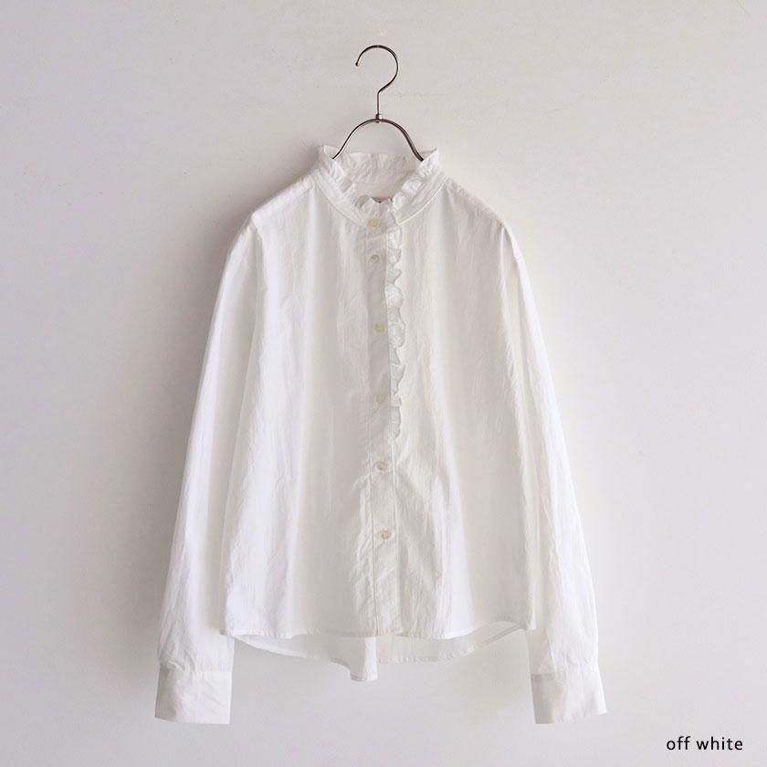 首まわりから胸元の第4ボタンあたりまで施されたフリルがクラシカルな雰囲気に。控えめなフリルなので甘くなりすぎず、大人の女性でも着用しやすいアイテムです。一枚での着用はもちろん、ニットやジャケットと合わせるとフリルがいいアクセントになりますよ。