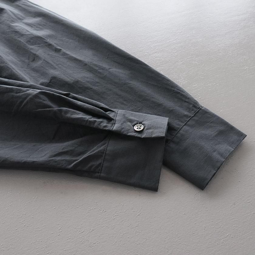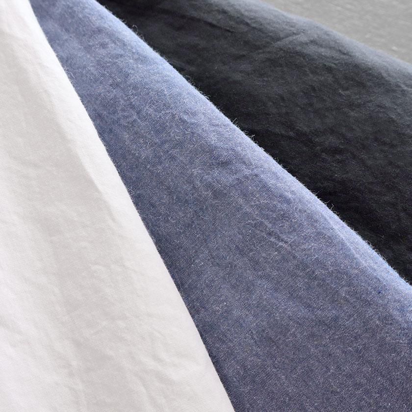 生地には高密度に織られたほどよくハリのあるタイプライター生地を使用。洗いをかけることで味わいのある独特なシワが生まれ、ヴィンテージ感のある質感に仕上がっています。