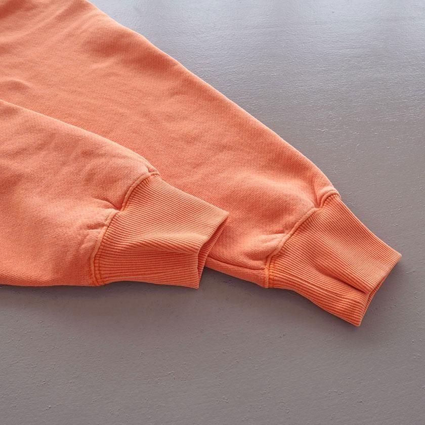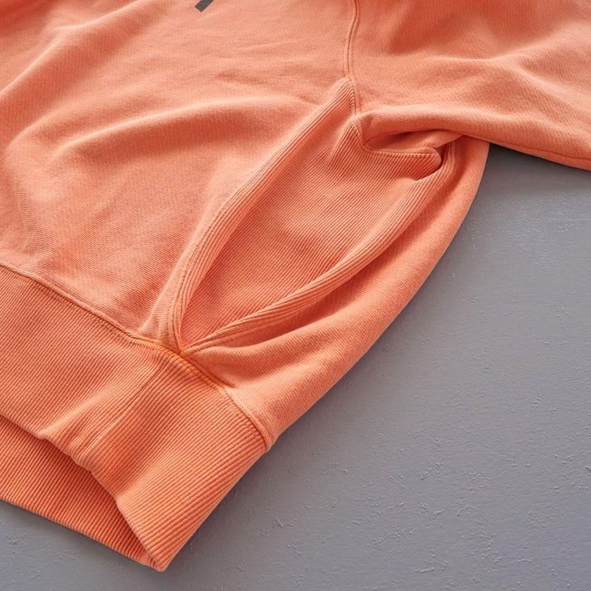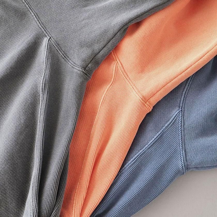 生地には希少なトンプキン編み機で下から上へゆっくりと糸に余計な力をかけずに編み上げたトンプキン裏毛を使用。従来とは異なる編み機を使い作られた生地は、しっかりと密度がありながらも空気をたっぷりと含んだふっくらと柔らかな風合いに仕上がっています。顔料染めを施すことで生まれる古着のような褪せた色合いも魅力で、さらっと1枚着るだけでこなれた着こなしが叶います。
