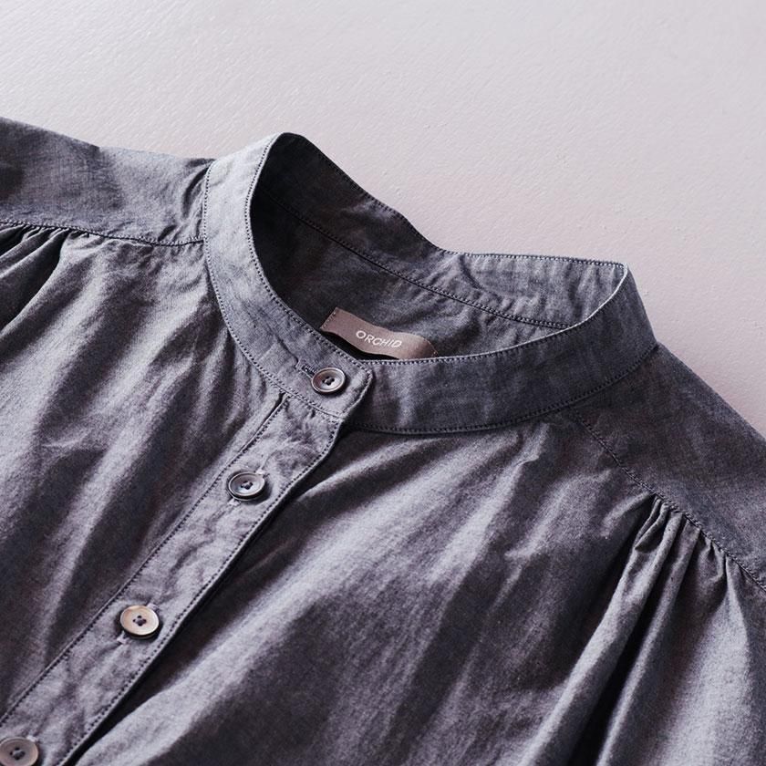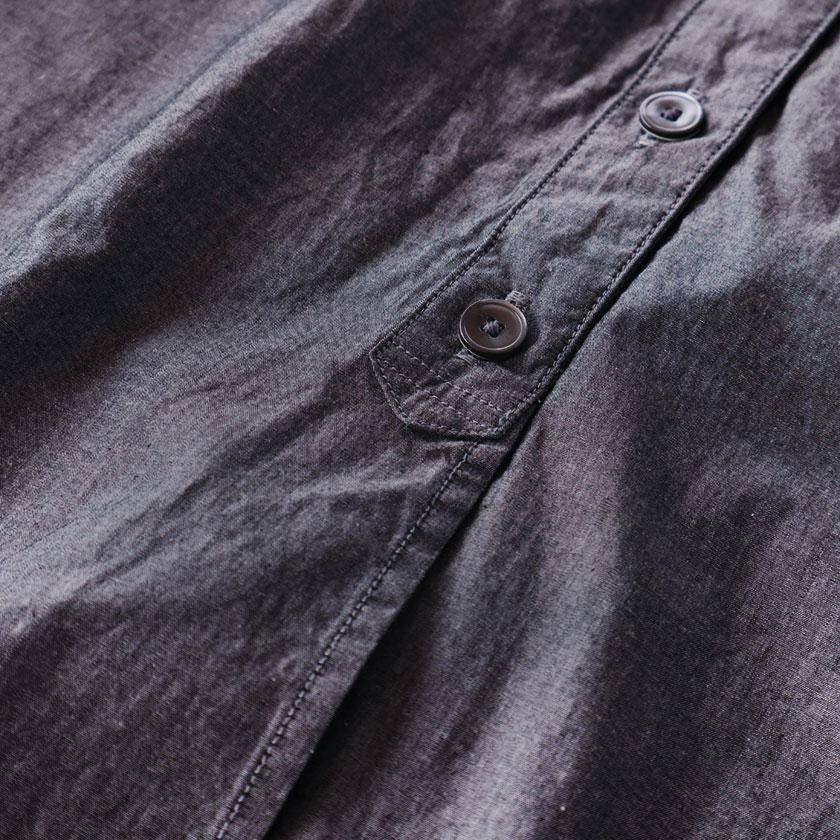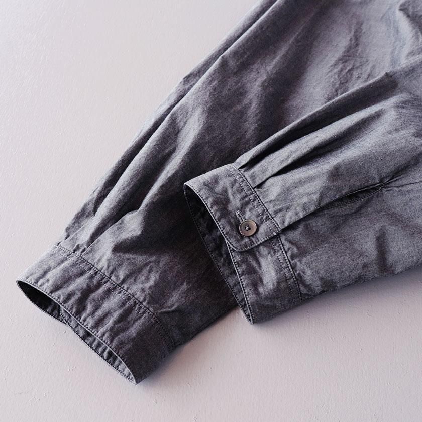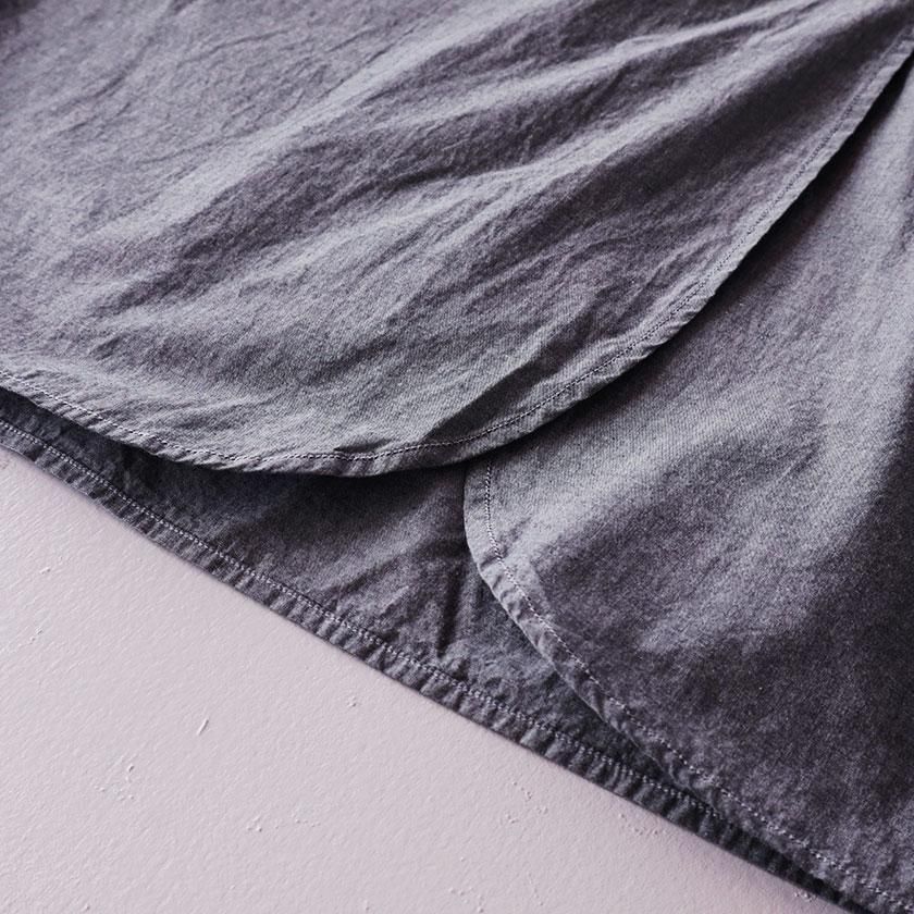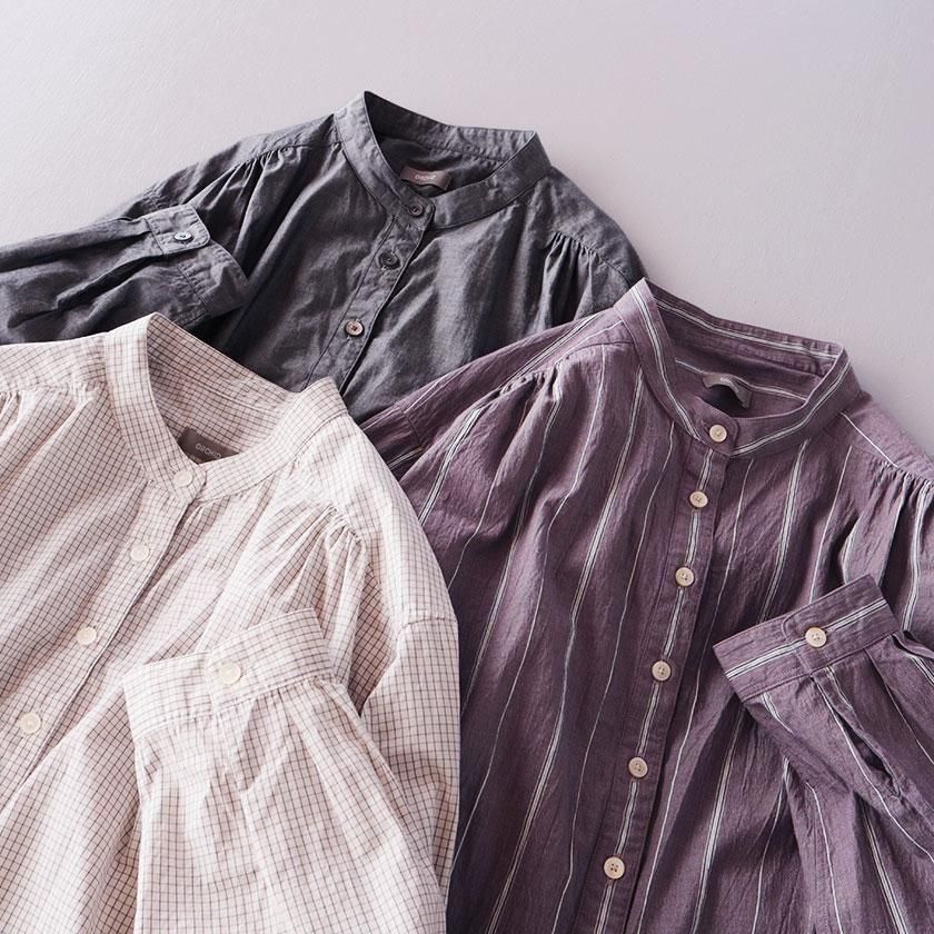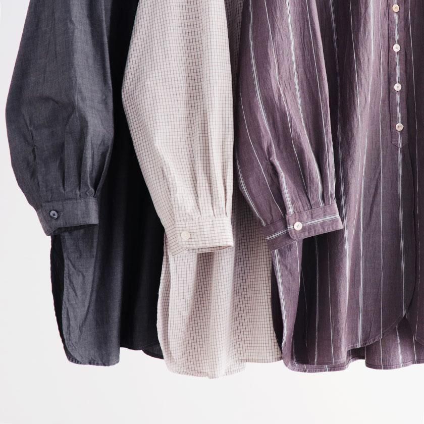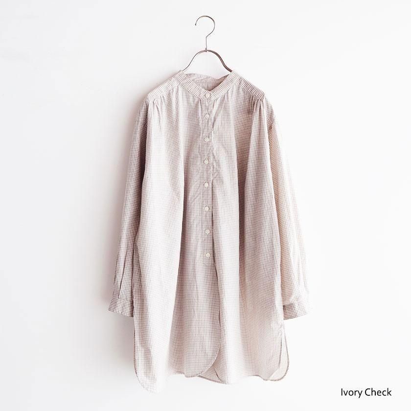 90年代のメンズのアンティークシャツをモチーフに女性らしい要素をプラスしたデザイン。ゆったりとした身幅に前身頃の肩と後ヨークの中央にギャザーを入れることでふんわりとしたシルエットを作り出しています。首回りはすっきりと見せてくれるバンドカラー。着丈は膝上ほどと長めの設定ですが、サイドにスリットを入れることで抜け感を演出し、レイヤードした時にも奥行きのある着こなしが楽しめます。