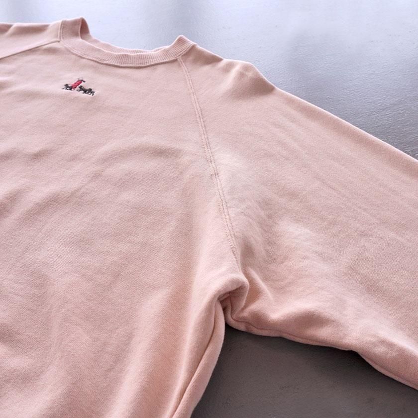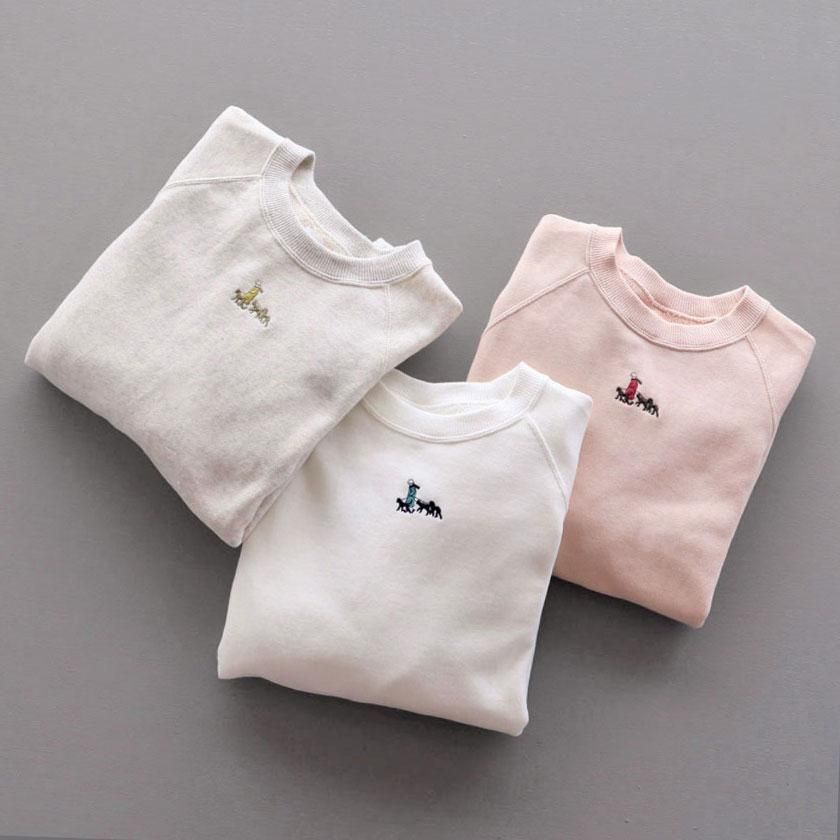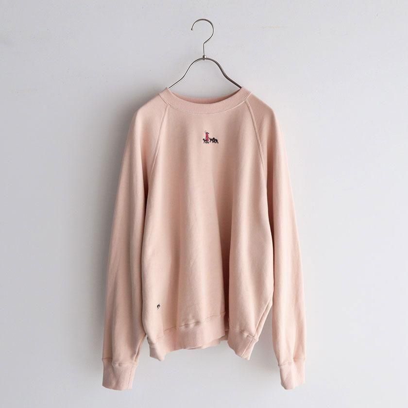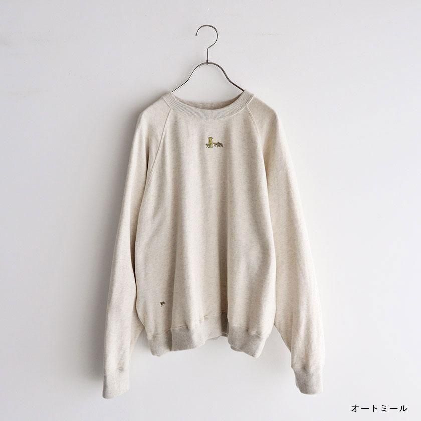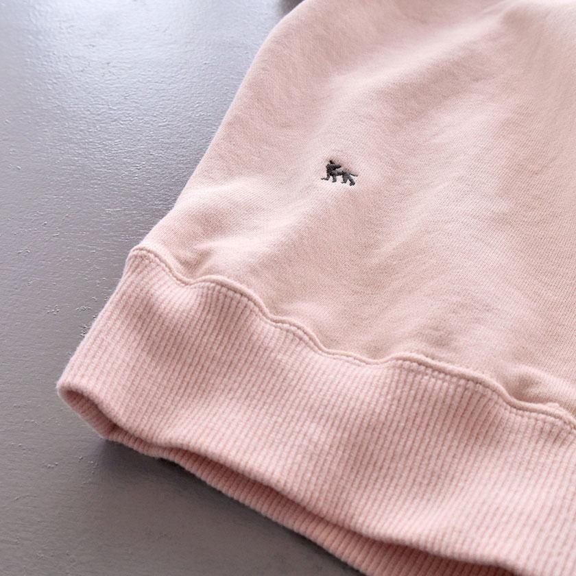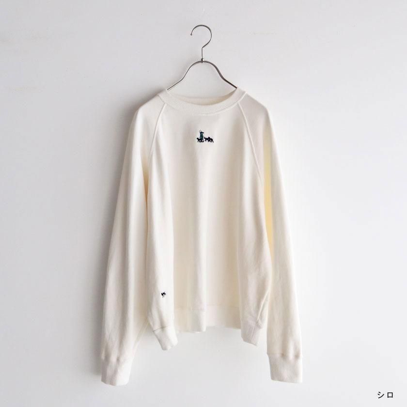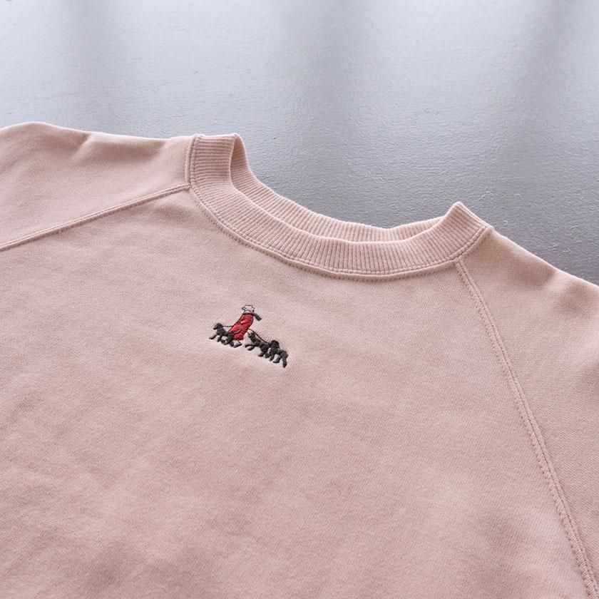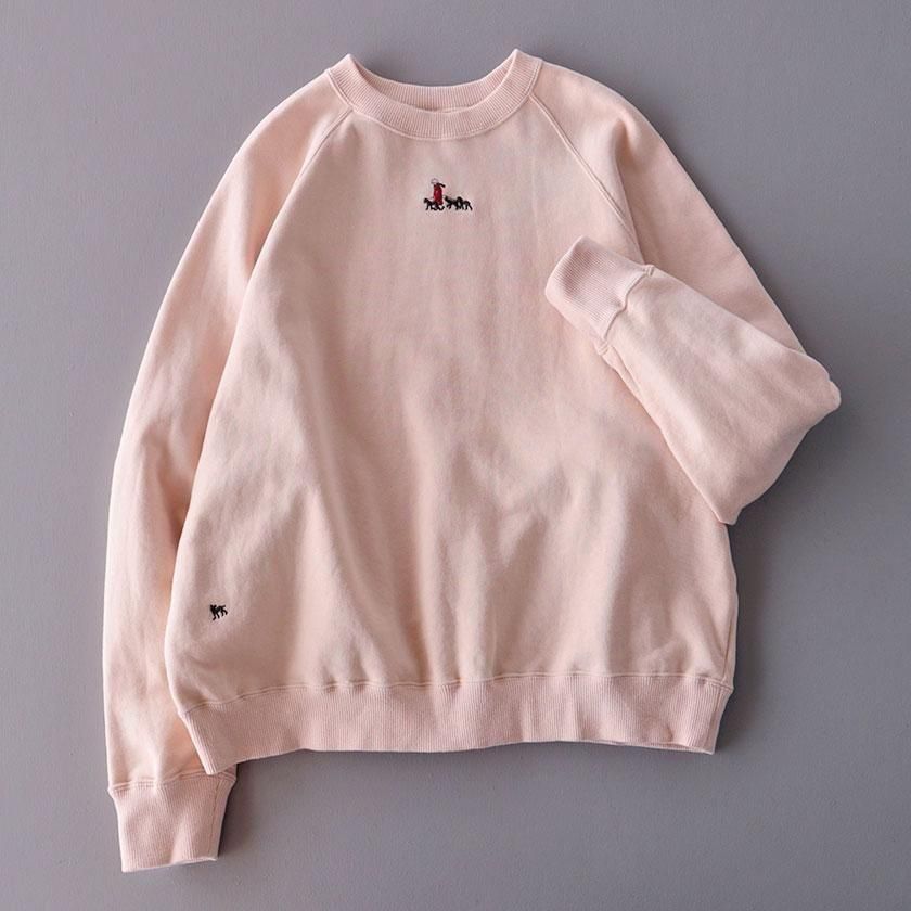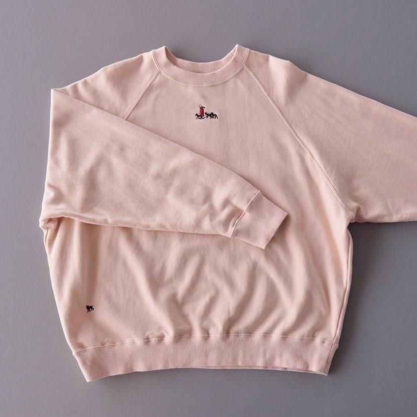 ほどよくゆとりのあるシルエットに、首元や袖口、裾をリブ仕様にすることでメリハリのある仕上がりに。袖は腕周りが動かしやすく快適なラグランスリーブです。胸元にはワンちゃんのお散歩を楽しむ様子をモチーフにした刺繍を施しています。右裾の方をよく見ると、お散歩中にはぐれてしまったワンちゃんも一匹。つい微笑んでしまうような心くすぐられる一着です。