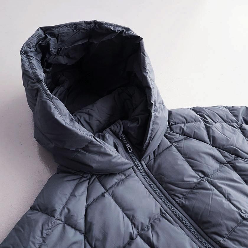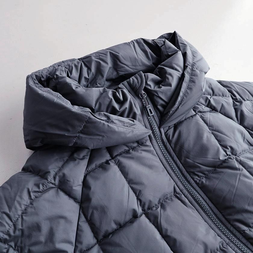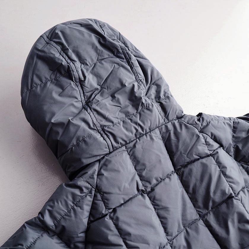 生地にはマットな風合いと柔らかな肌触りが特徴のナイロンタフタを使用。スクエア型のダウンステッチをあしらい、ほどよいボリューム感に抑えることですっきりときれいなシルエットを作り出しています。とても軽量ながらもダウンがたっぷりと封入されており、しっかりと暖かい仕上がりになっています。
