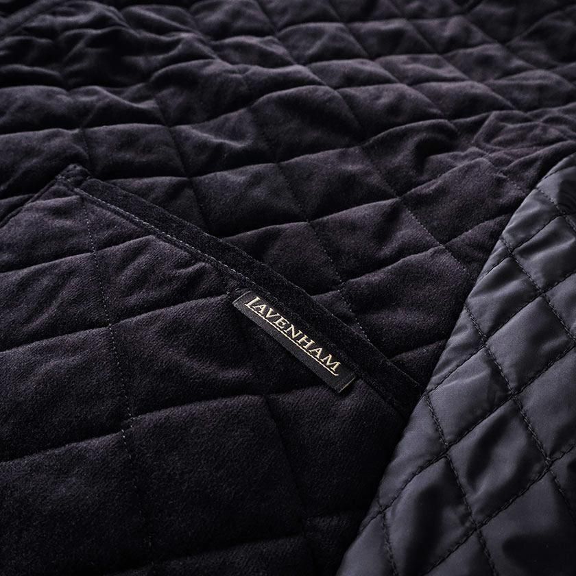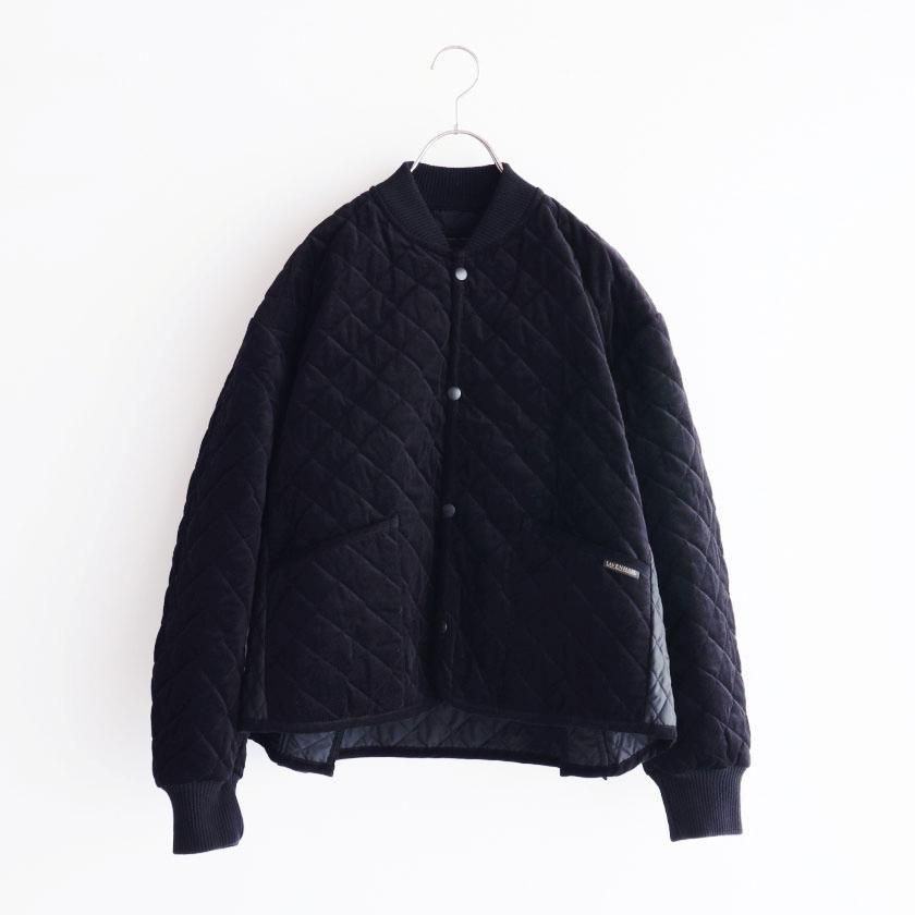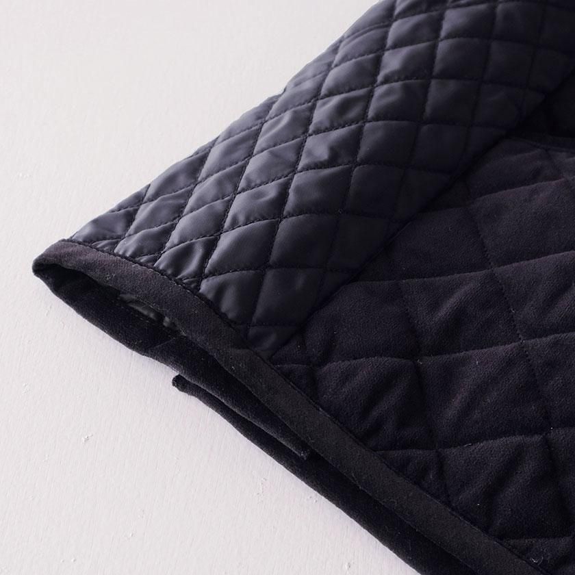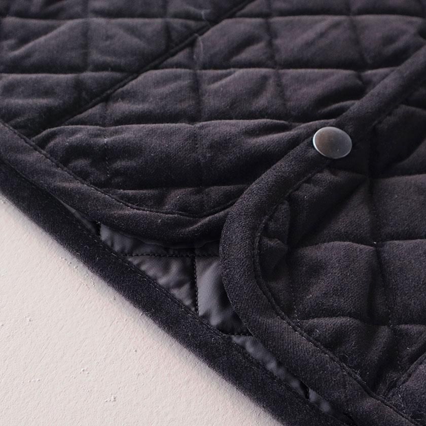 メインとサイドパネルに異なるキルトパターンを採用することで、独特な構造のシルエットを実現した一着。ベルベット生地にはクラシックなダイヤキルトを、サイド部分には1インチのナローダイヤモンドキルトが施されています。