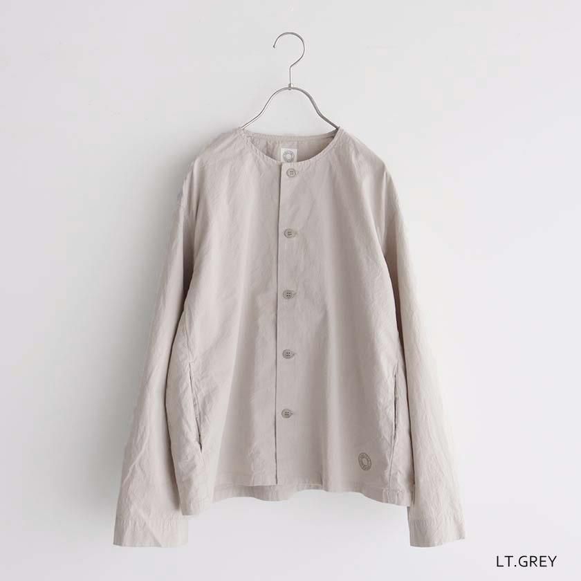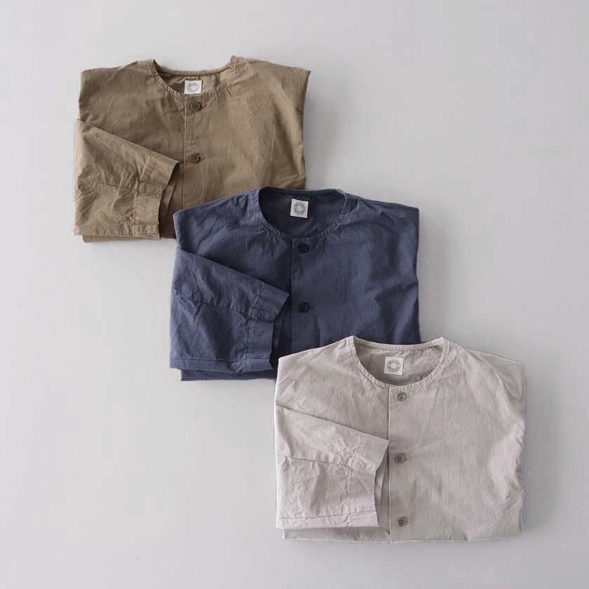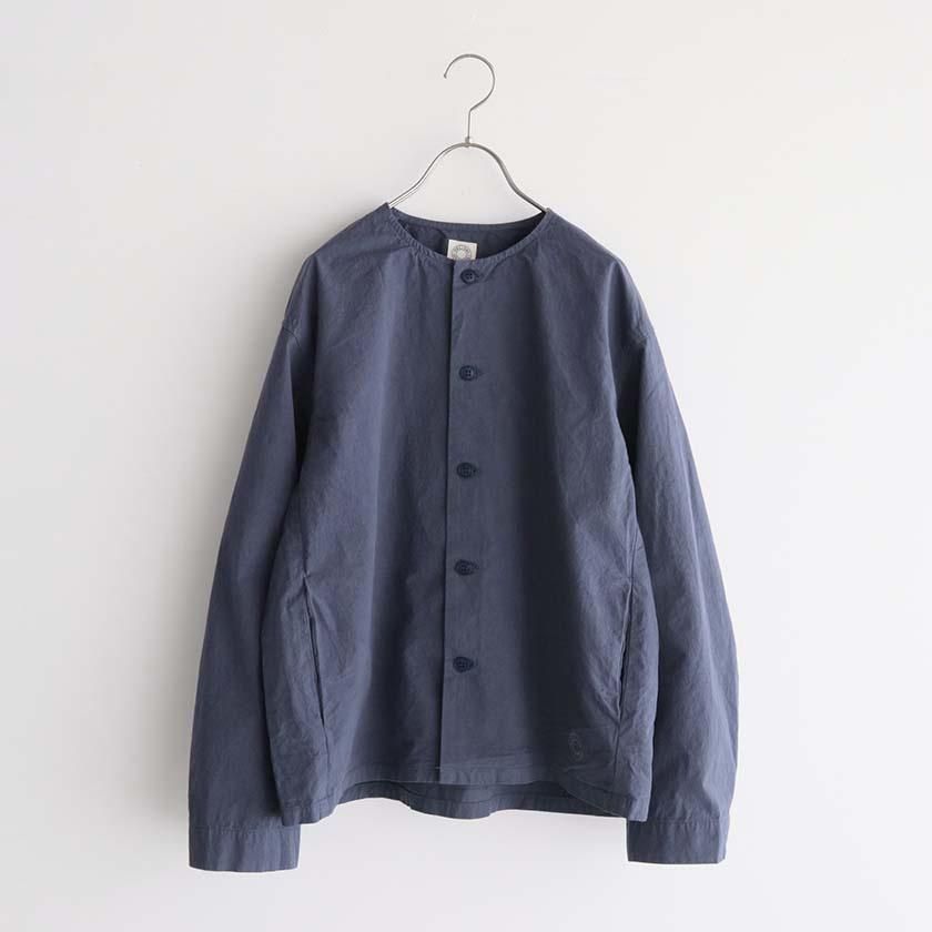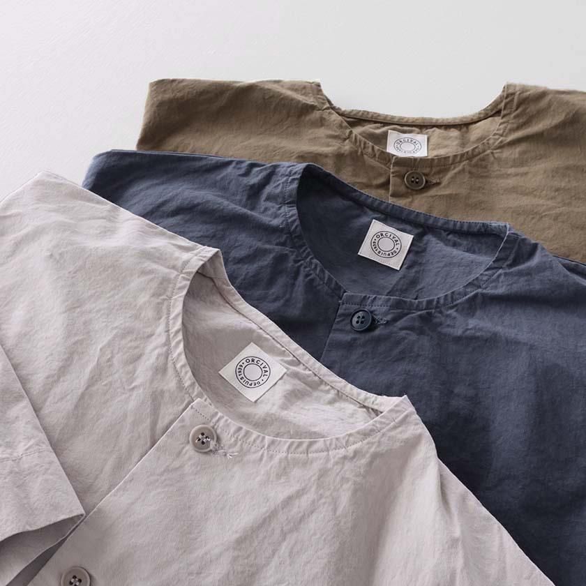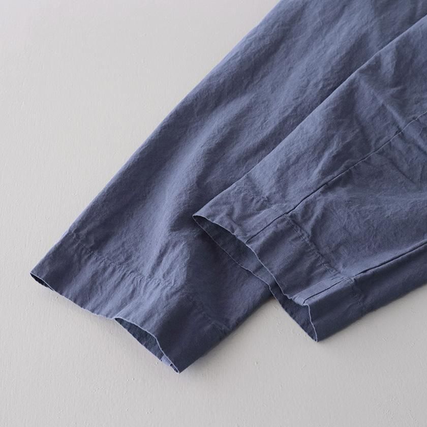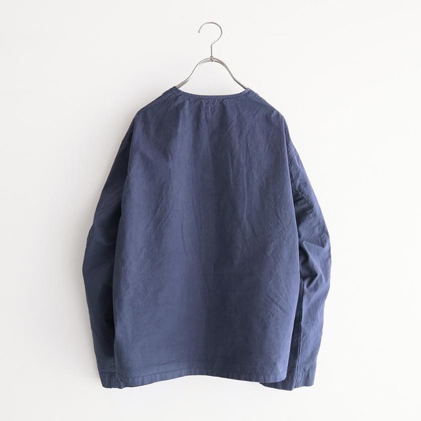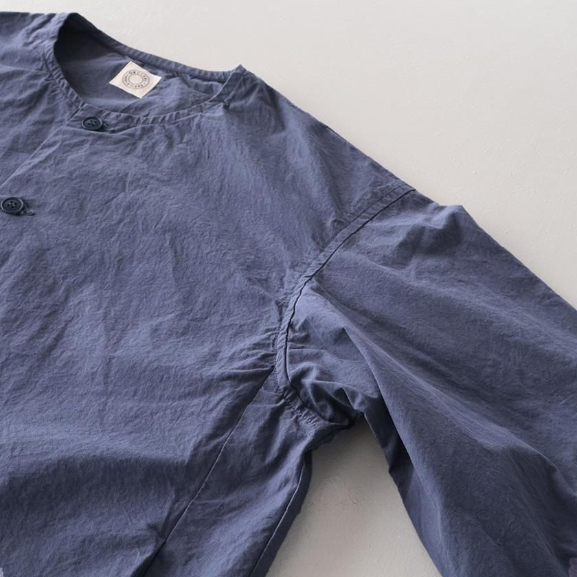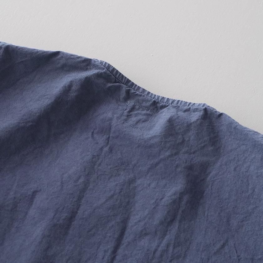 生地には40番手の糸を高密度に織り上げたコットンツイルを使用。近江晒加工を施すことで洗いざらしのようなナチュラルなシワ感が生まれ、ハリのあるドライタッチな質感に仕上げています。製品染めならではの深みのある色合いと立体的な凹凸感や独特の風合いであるパッカリングも魅力の一つ。薄手で軽やかな着心地なので肌寒い時期はアウターとして、真冬はインナーとしてシーズンレスで活躍する一着です。