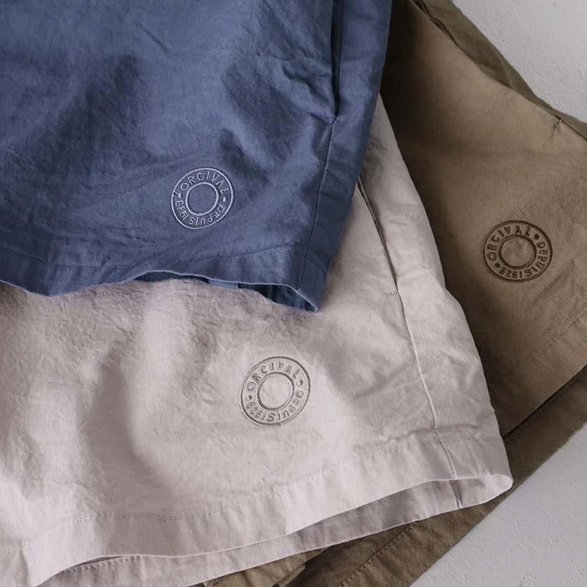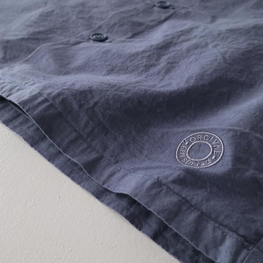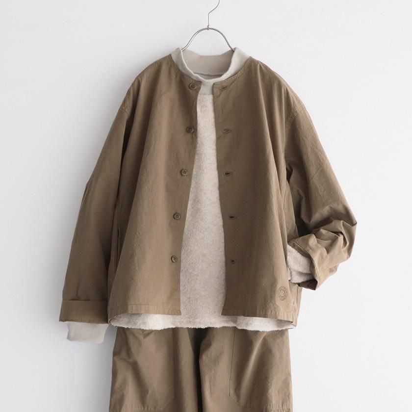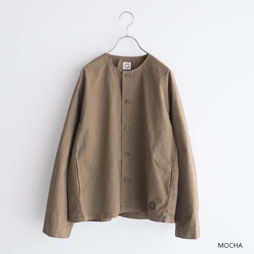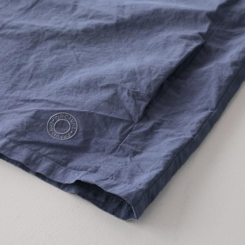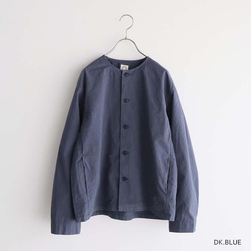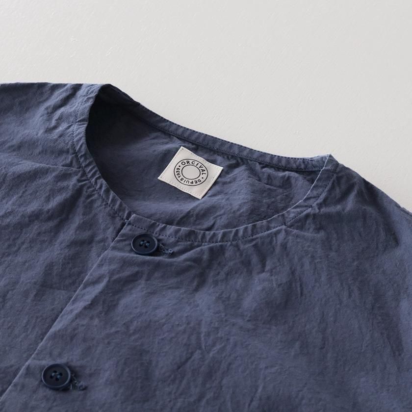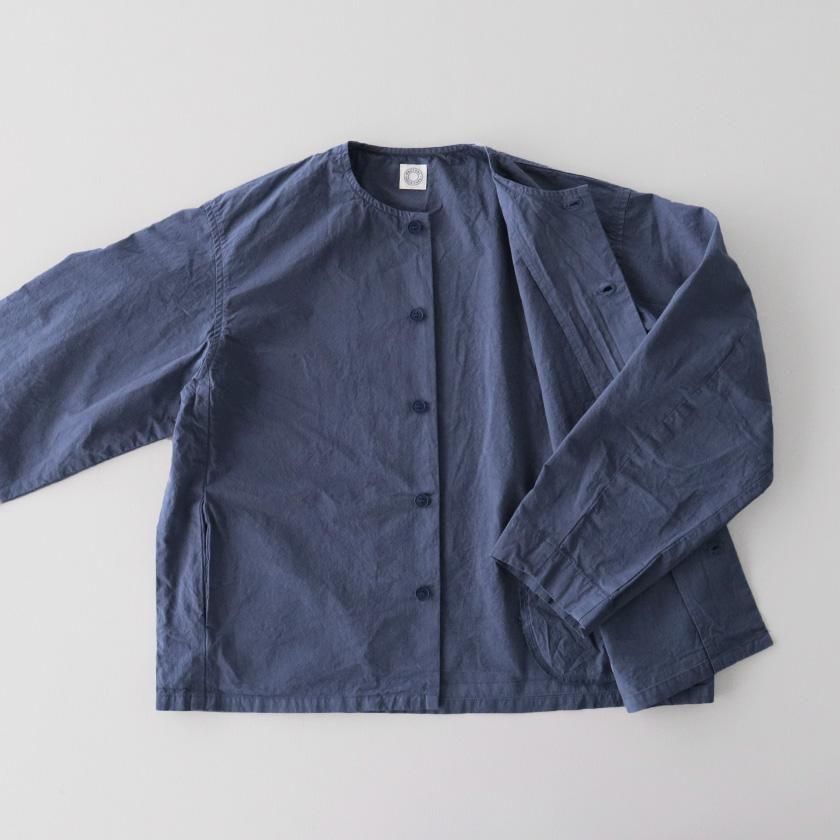 生地には40番手の糸を高密度に織り上げたコットンツイルを使用。近江晒加工を施すことで洗いざらしのようなナチュラルなシワ感が生まれ、ハリのあるドライタッチな質感に仕上げています。製品染めならではの深みのある色合いと立体的な凹凸感や独特の風合いであるパッカリングも魅力の一つ。薄手で軽やかな着心地なので肌寒い時期はアウターとして、真冬はインナーとしてシーズンレスで活躍する一着です。