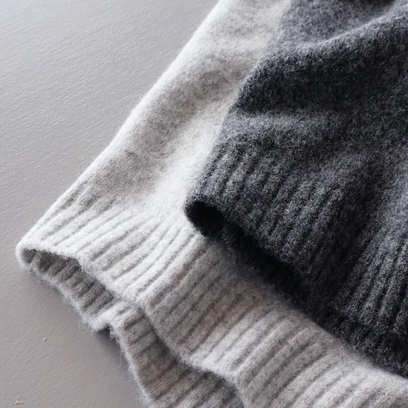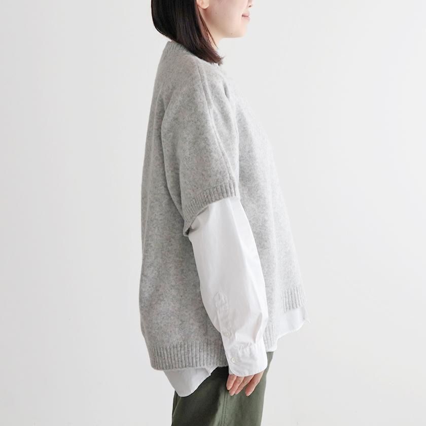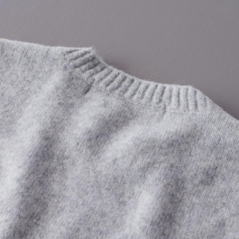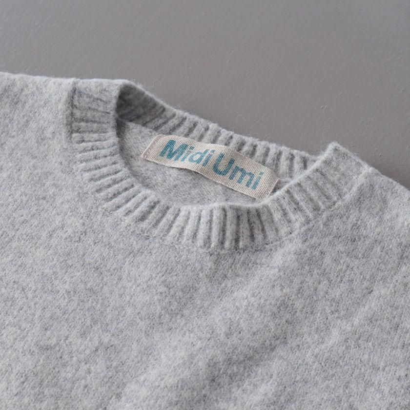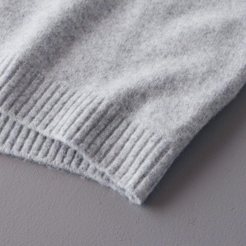 ペットボトル等を原料として再生したリサイクルポリエステルをメイン素材にした混紡糸を使用。チクチク感の少ないふっくらと柔らかな肌触りでニットならではのあたたかみを感じられます。ご自宅で手洗いできるのも嬉しいポイント。環境に配慮しながらも着心地の良さと扱いやすさを追求した一着です。
