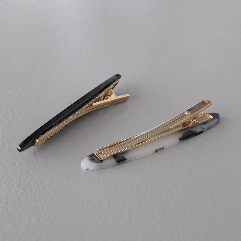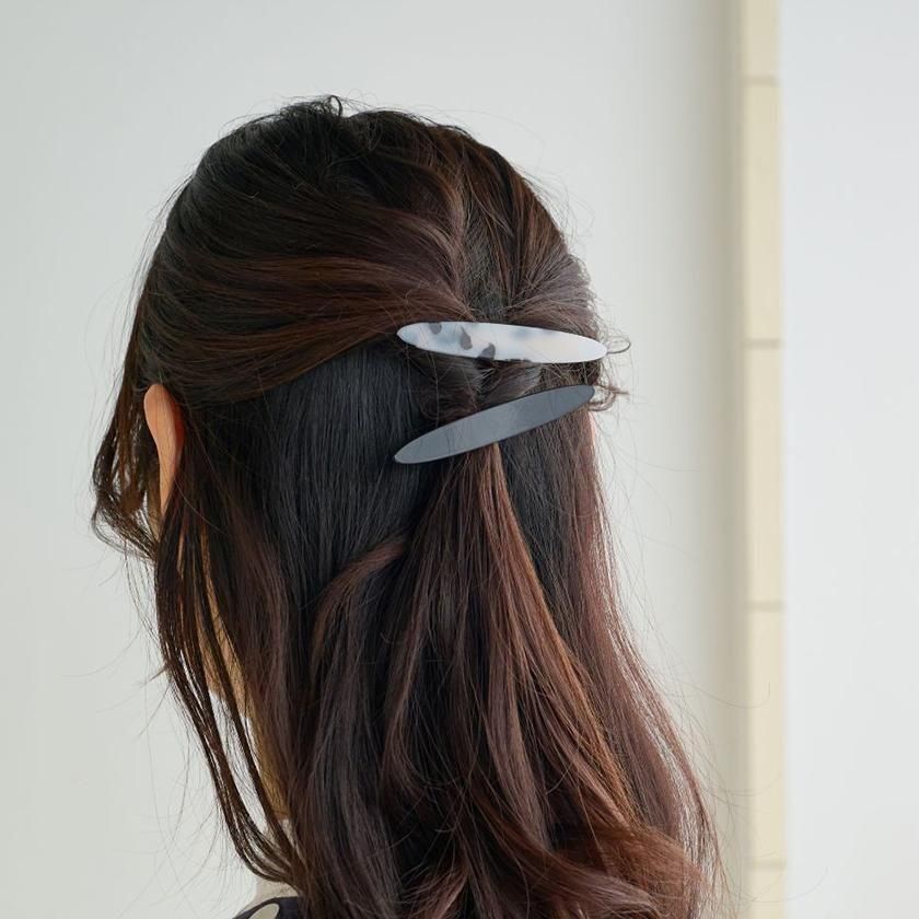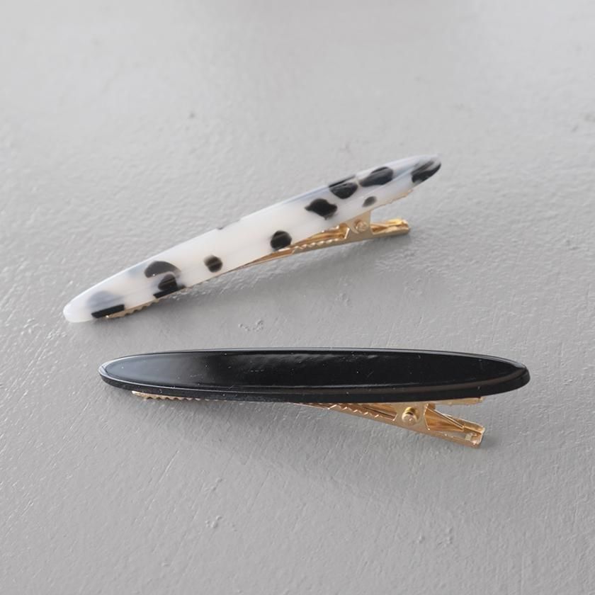 ベーシックカラーで合わせやすい単色と秋冬らしさを高めてくれるべっ甲柄の2本セット。重ねて着けても派手になりすぎずシンプルなコーディネートのさりげないアクセントになります。前髪を留めたりまとめ髪にプラスしたりと、カジュアルから上品なヘアスタイルまで幅広くご使用いただけますよ。